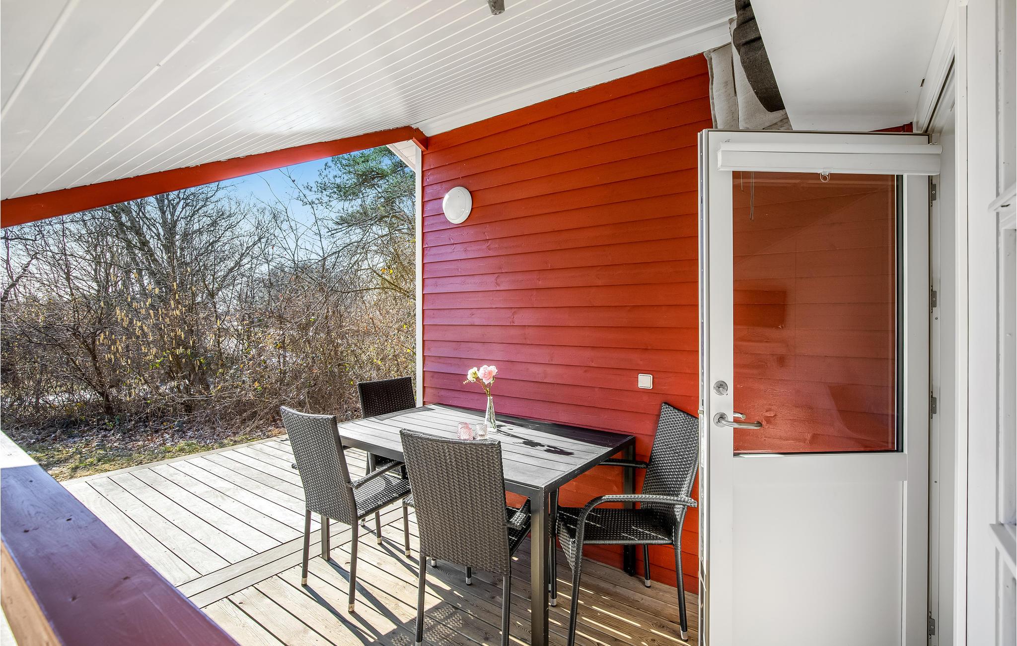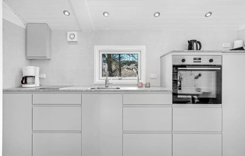 Hytten er velindrettet med et hjemligt interiør i skandinavisk stil med tekøkken. Tag en kop kaffe og sæt jer i det hyggelige opholdsrum eller find en stol på den solrige terrasse.