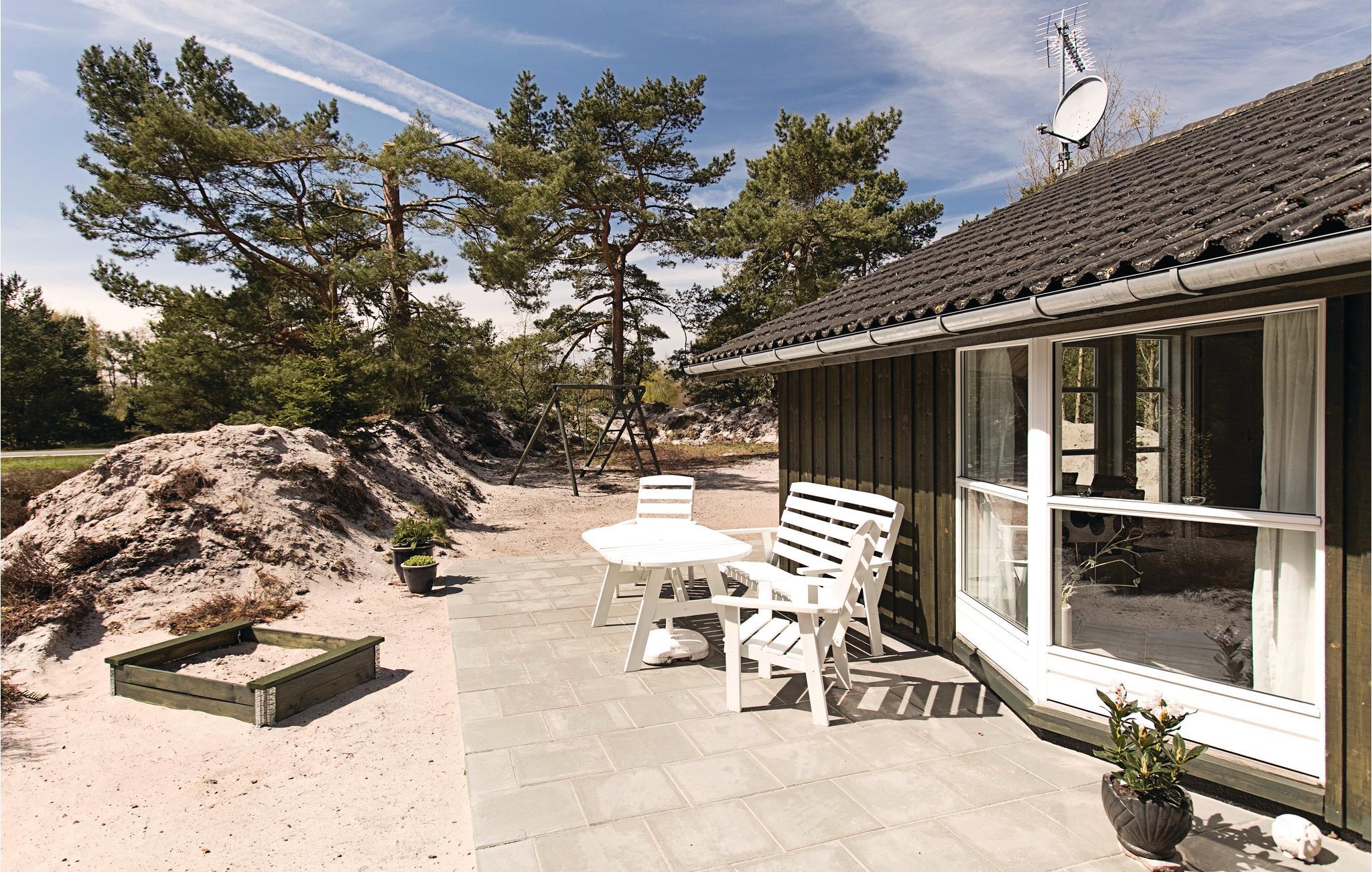 Hyggeligt træferiehus nær Balka Strand med stor terrasse, moderne indretning og gratis internet.