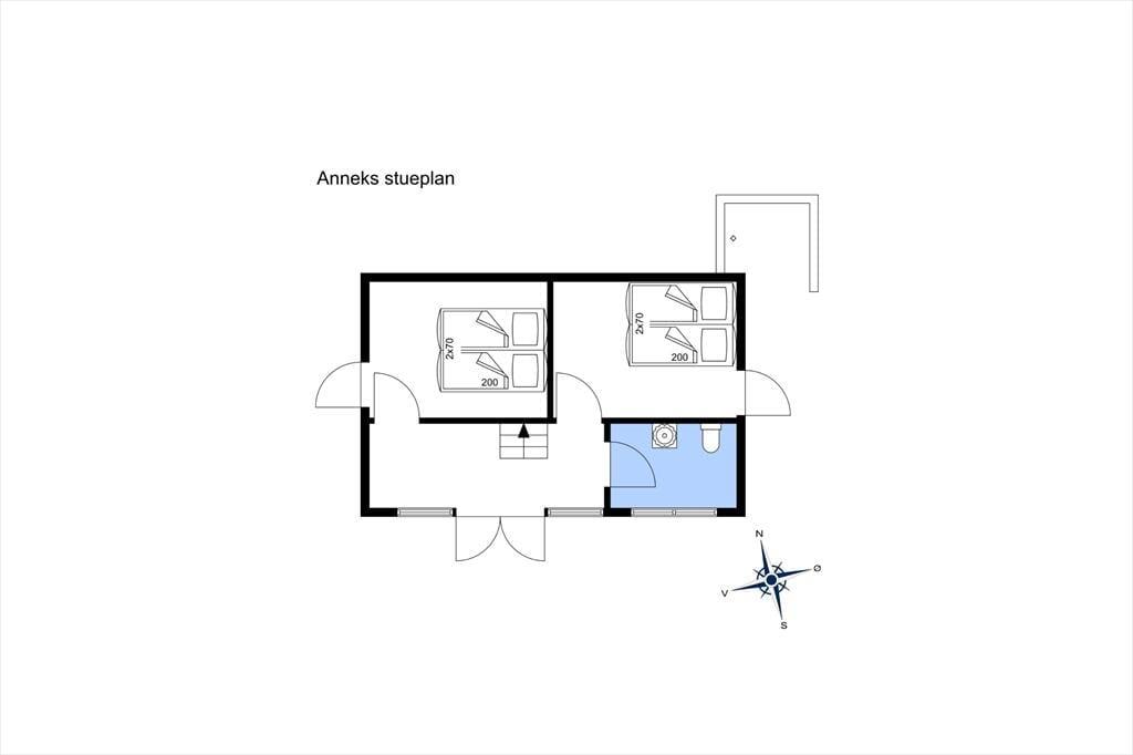 Det flotte anneks fra 2007 rummer yderligere to soverum med hver to boksmadrasser; desuden hems og dejligt badeværelse med gulvvarme. Udendørsbruser på østside af anneks.