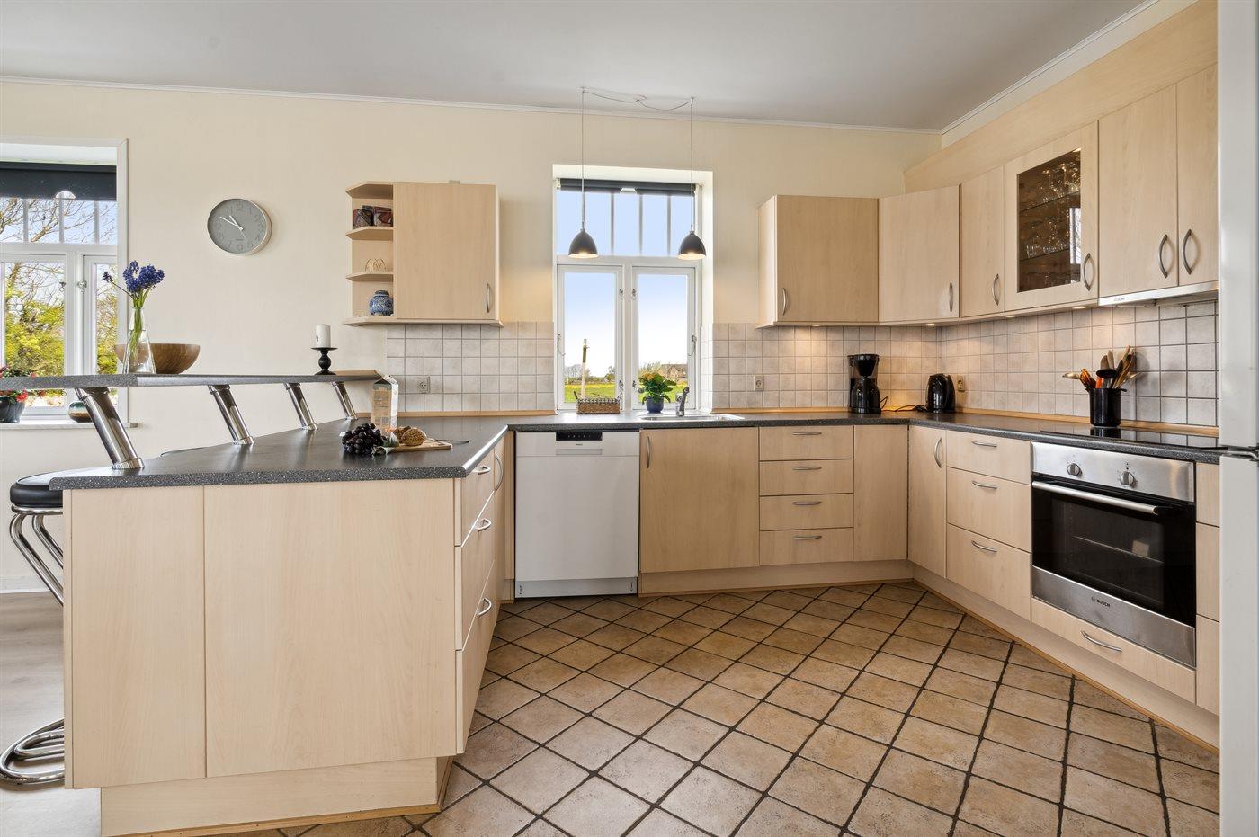 Køkkenet er udstyret med 1 køleskab. Der er 4 keramiske kogeplader, varmluftovn, mikrobølgeovn samt opvaskemaskine Der er gulvvarme i køkkenet.