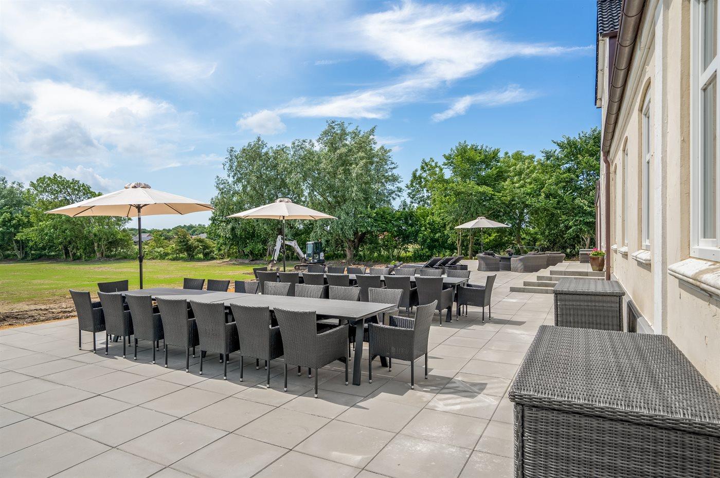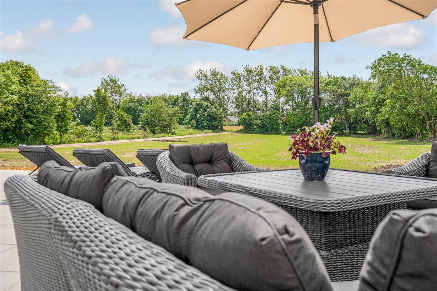 Ferieboligen er beliggende på en 15000 m² stor naturgrund. Der er 15000 m til havet. Der er 1200 m til Vadehavet. Nærmeste forretning er beliggende i en afstand af 700 m. Til ferieboligen hører åbent terrasseareal. Sandkasse. Trampolin. Fodboldmål. Bålsted. Shelter. Udendørs sauna. Udendørs bruser. Der er mulighed for at tilberede maden udendørs i udekøkkenet. Grill til rådighed. Der er installeret stik til opladning af elbil. CEE stik. Parkering ved ferieboligen.