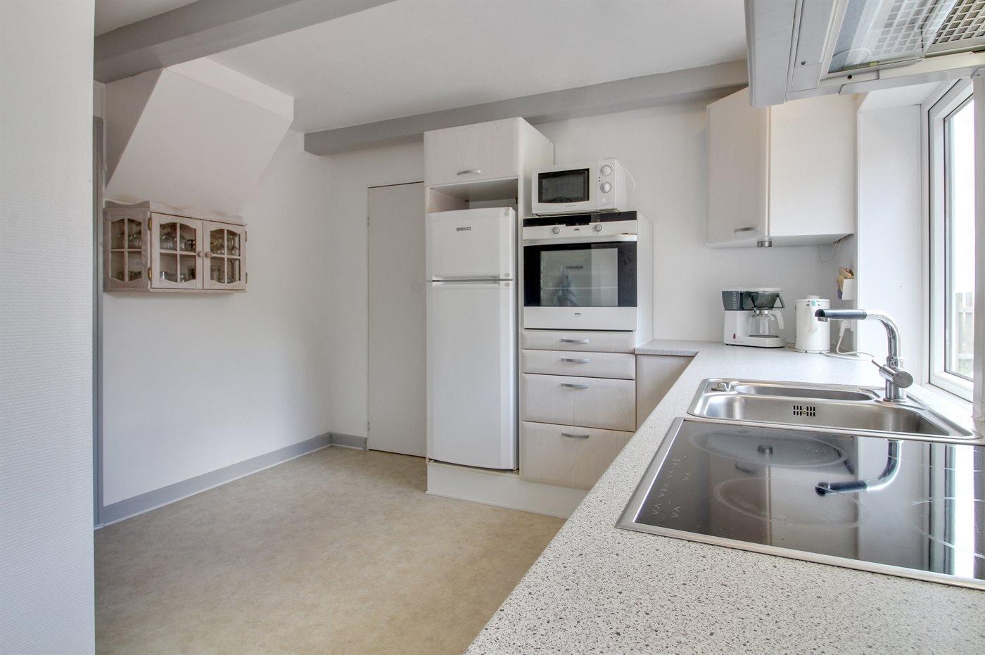 Køkkenet er udstyret med 1 køleskab. Der er 4 keramiske kogeplader, varmluftovn, mikrobølgeovn samt opvaskemaskine Der er gulvvarme i køkkenet.