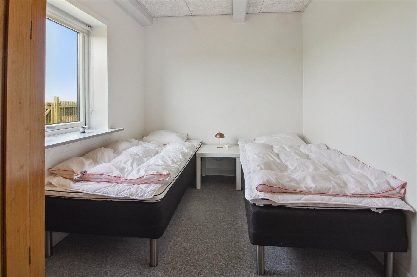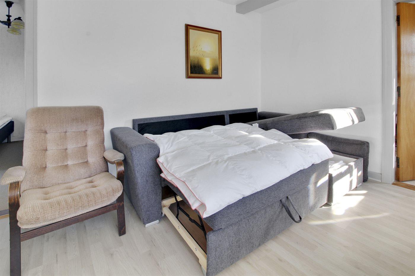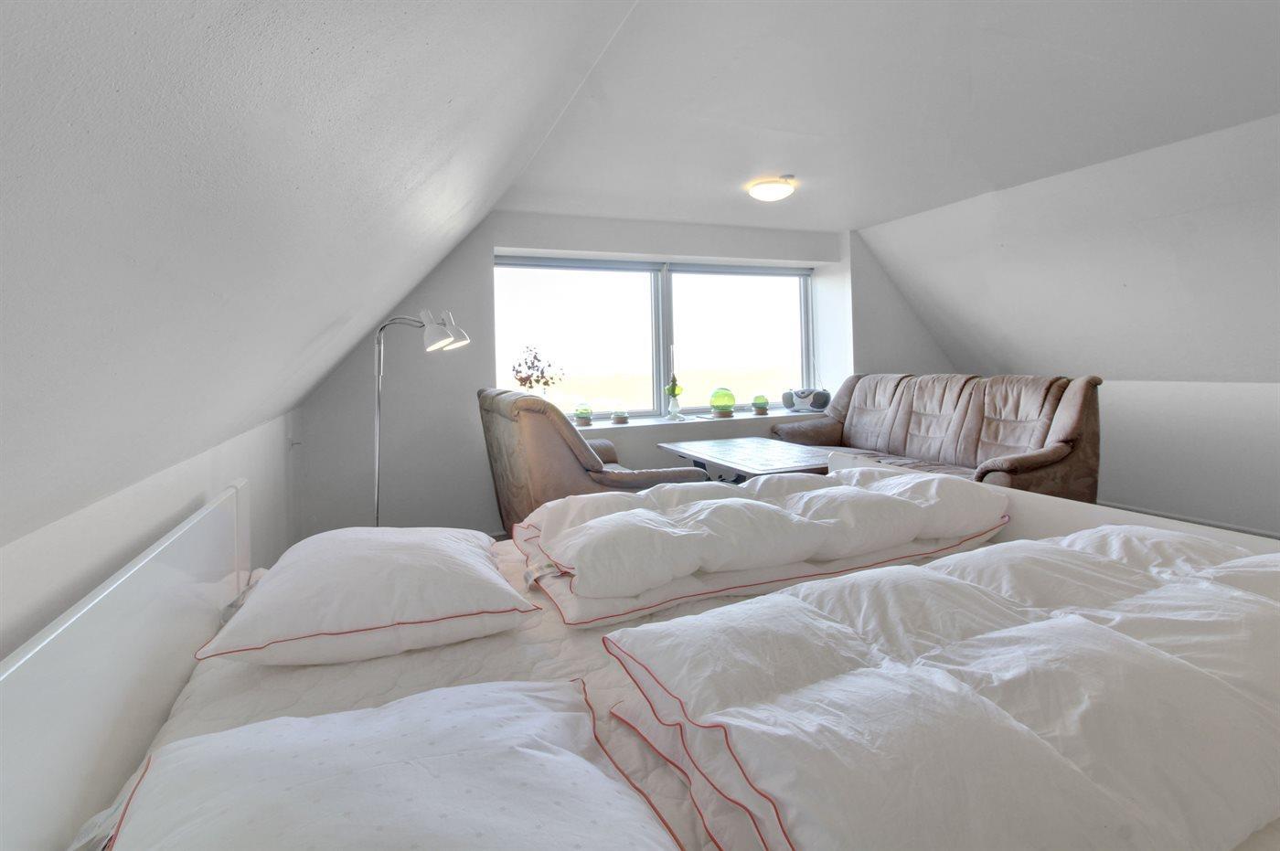 Der er i alt 1 soveværelse. Sovepladserne fordeler sig på: 2 sovepladser i dobbeltseng. 2 sovepladser i enkeltsenge. 2 sovepladser i sovesofa (dobbelt). 2 af disse sovepladser befinder sig i stuen. Derudover er der 1 stk. barneseng.