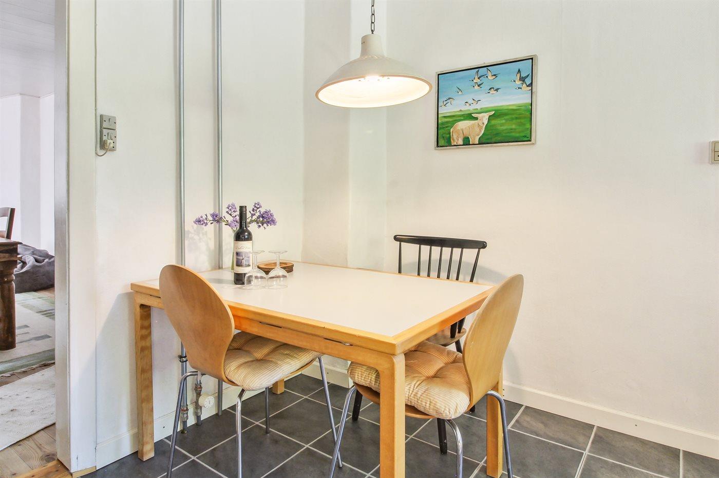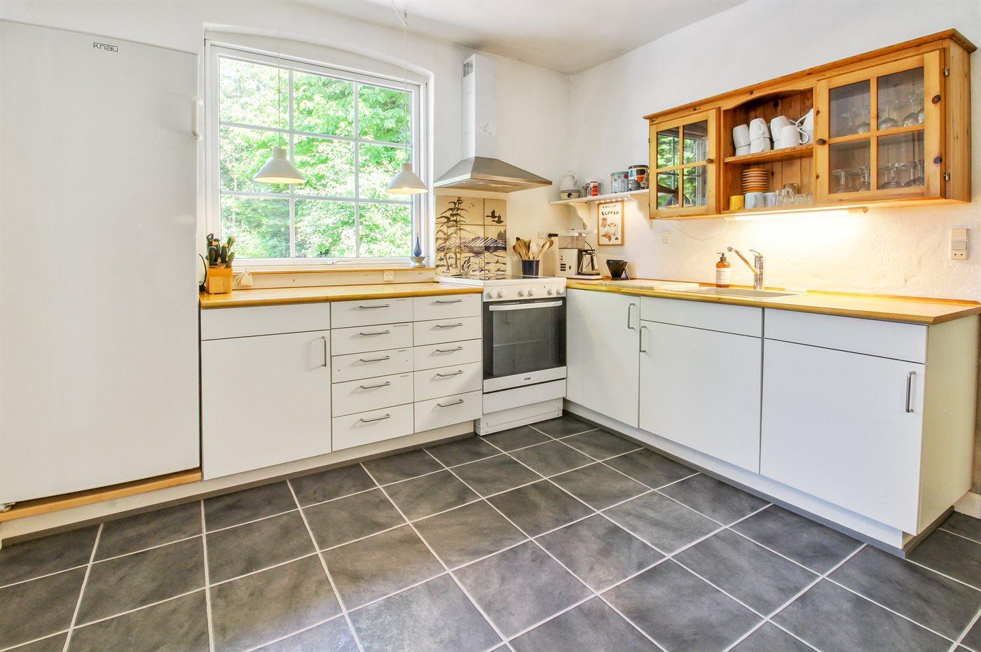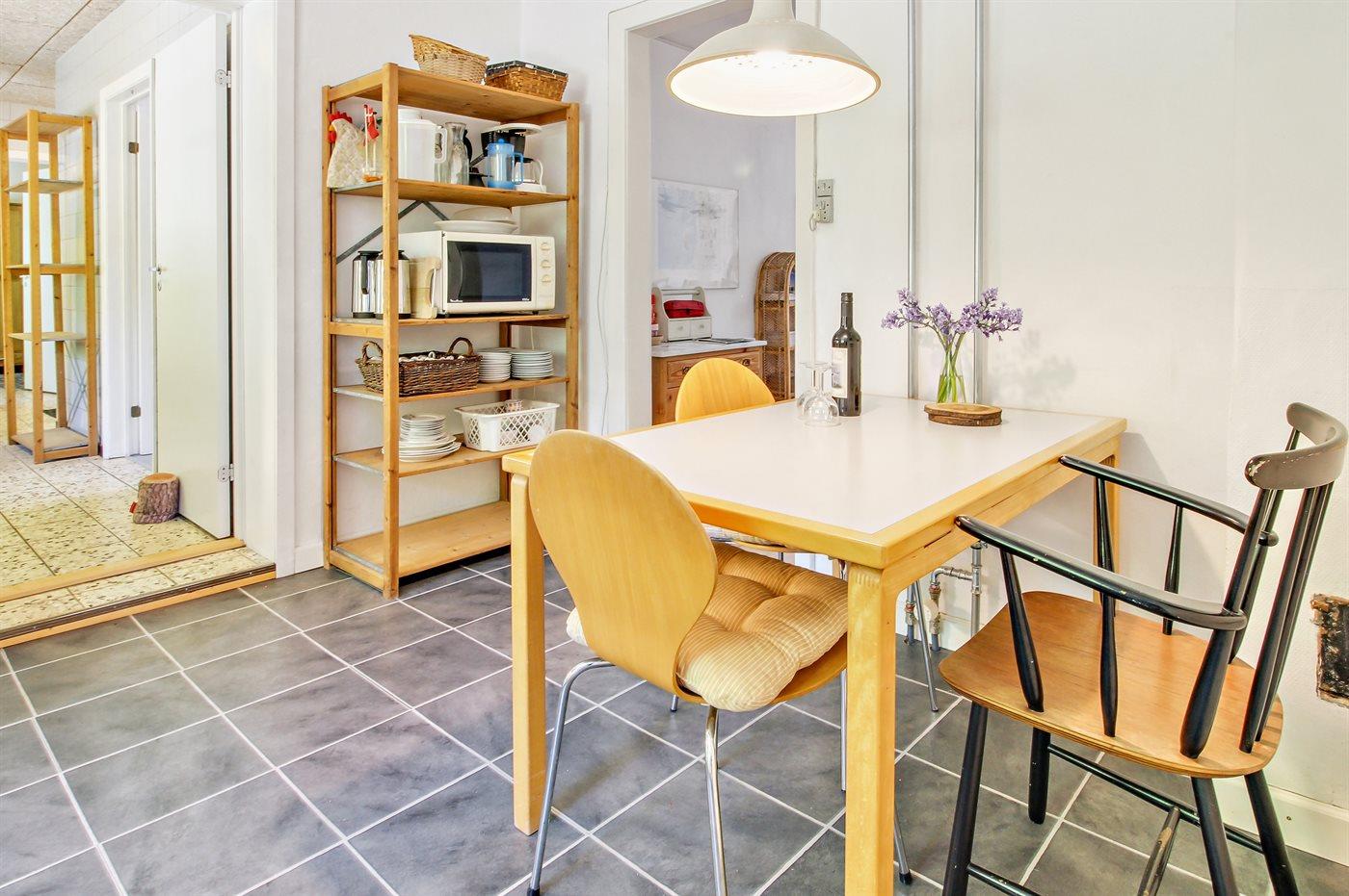 Køkkenet er udstyret med 1 køleskab. Der er 4 keramiske kogeplader, varmluftovn, mikrobølgeovn samt opvaskemaskine Der er gulvvarme i køkkenet.
