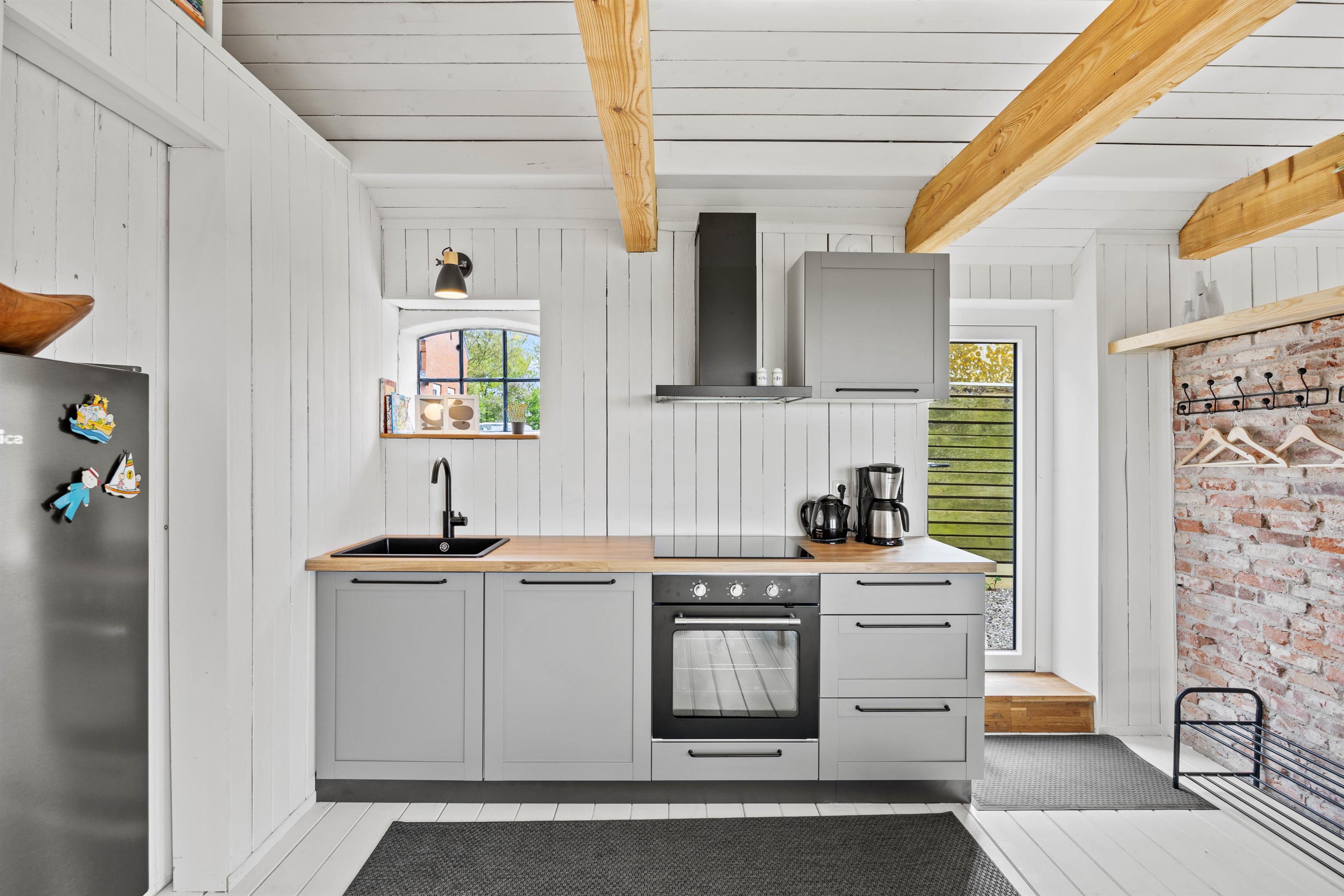 Køkkenet er fuldt udstyret med opvaskemaskine, induktionskomfur med ovn og køleskab med integreret frostboks, så I nemt kan tilberede lækre måltider, som I kan nyde sammen om aftenen enten på terrassen, mens I ser solen gå ned eller i stuen, som er udstyret med fladskærms-TV, Apple?TV og Chromecast.