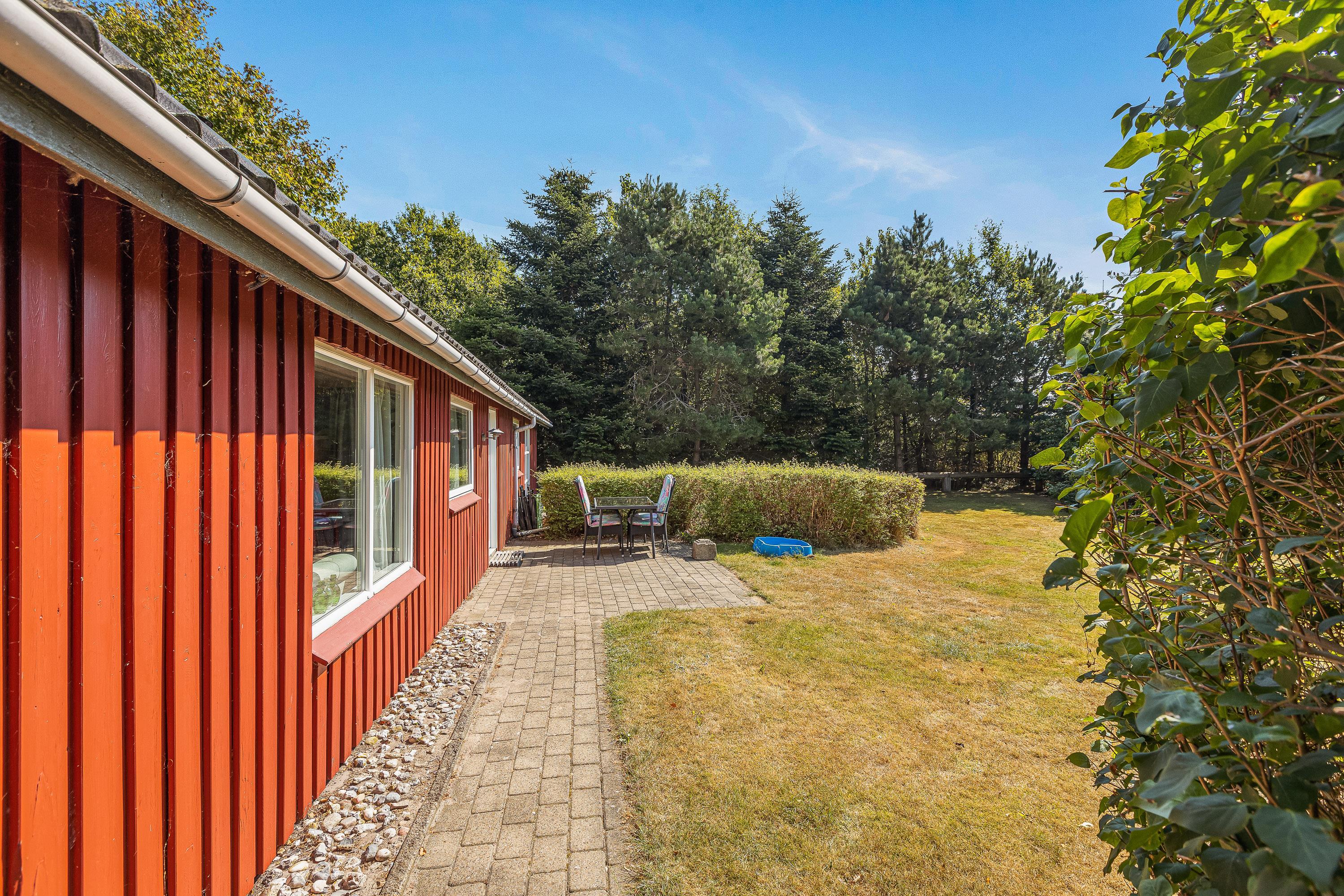 I den velholdte have omkranset af træer og buske er der rig mulighed for at holde opsyn med børnene. Haven byder også på en sandkasse.