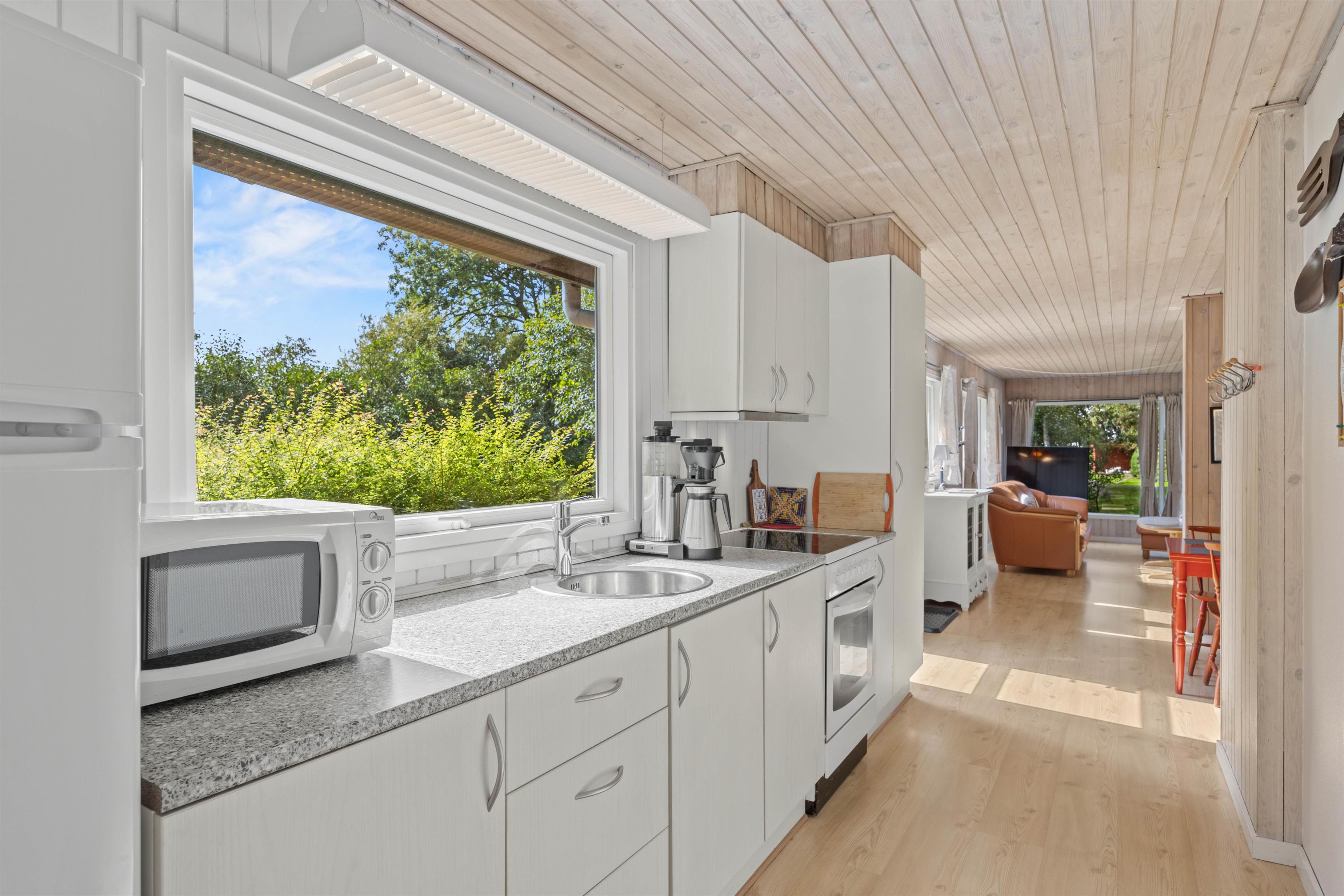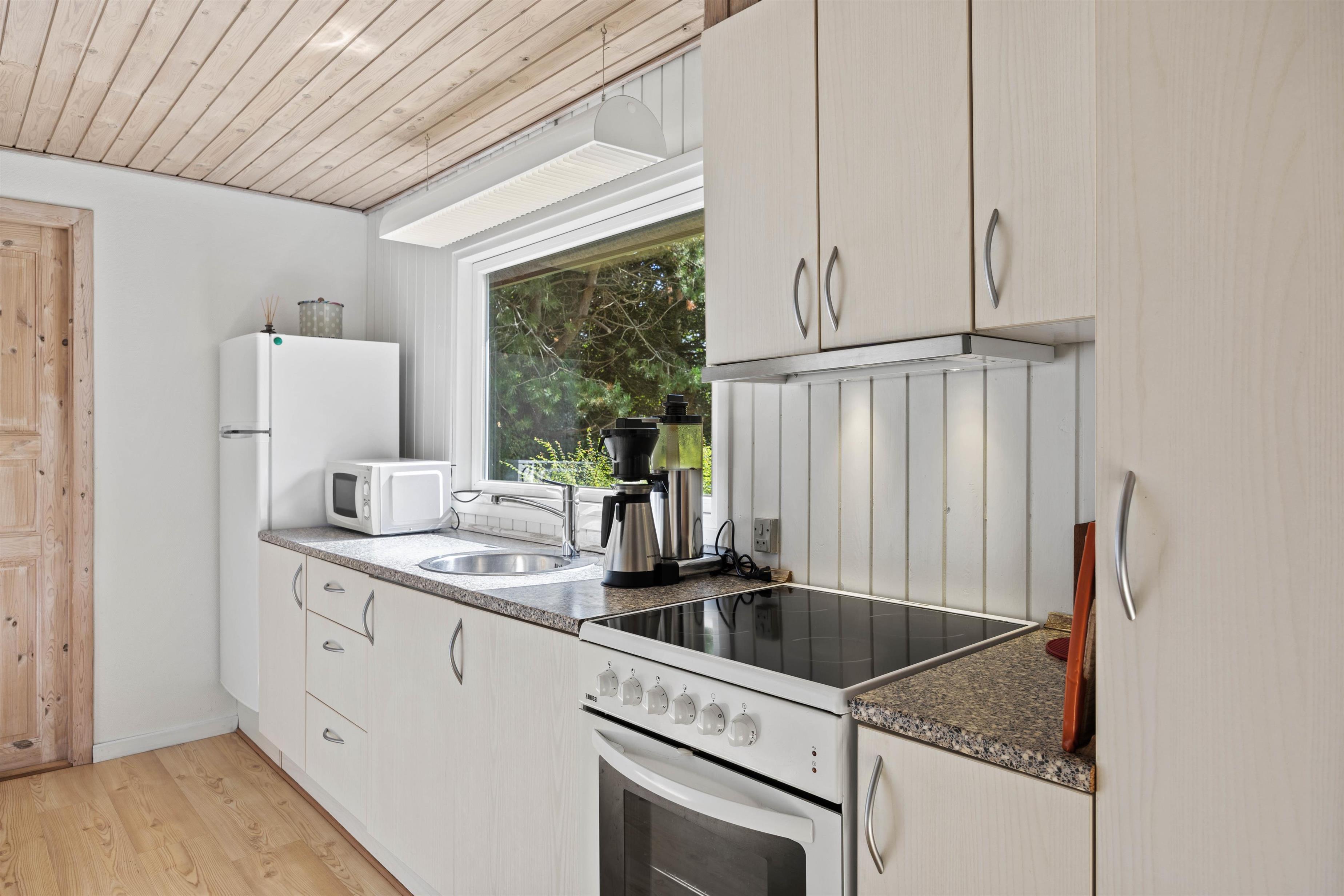 Køkkenet og stuen hænger sammen, så her er rig mulighed for gode samtaler. Læn jer tilbage i det komfortable møblement, mens brændeovnen knitrer i baggrunden. Nyd en god nats søvn i værelset med dobbeltseng. Her er også en etageseng. Badeværelset har gulvvarme og her står vaskemaskinen også. Desuden er her 10 liters fryser i sommerhuset og en barneseng.