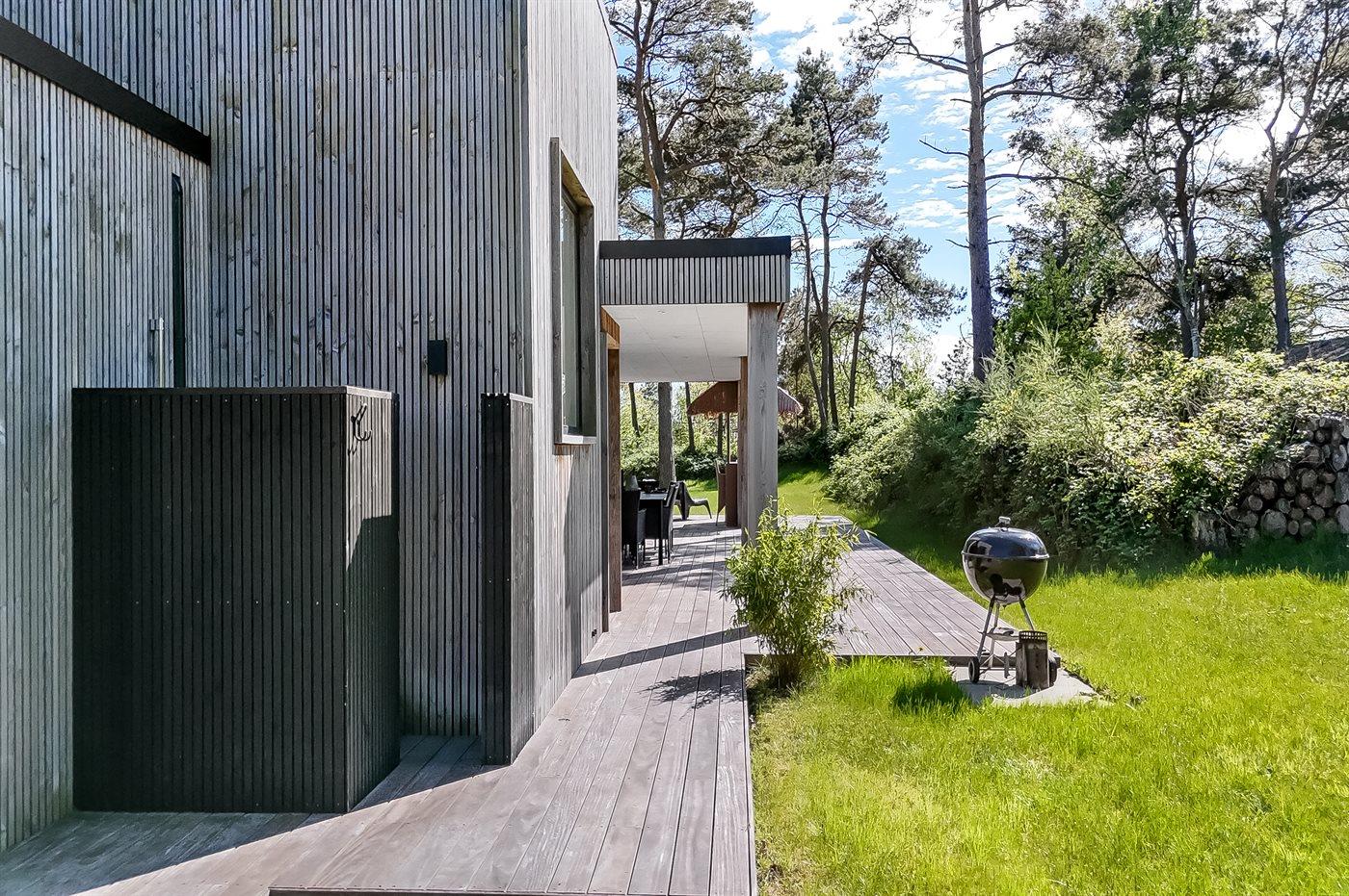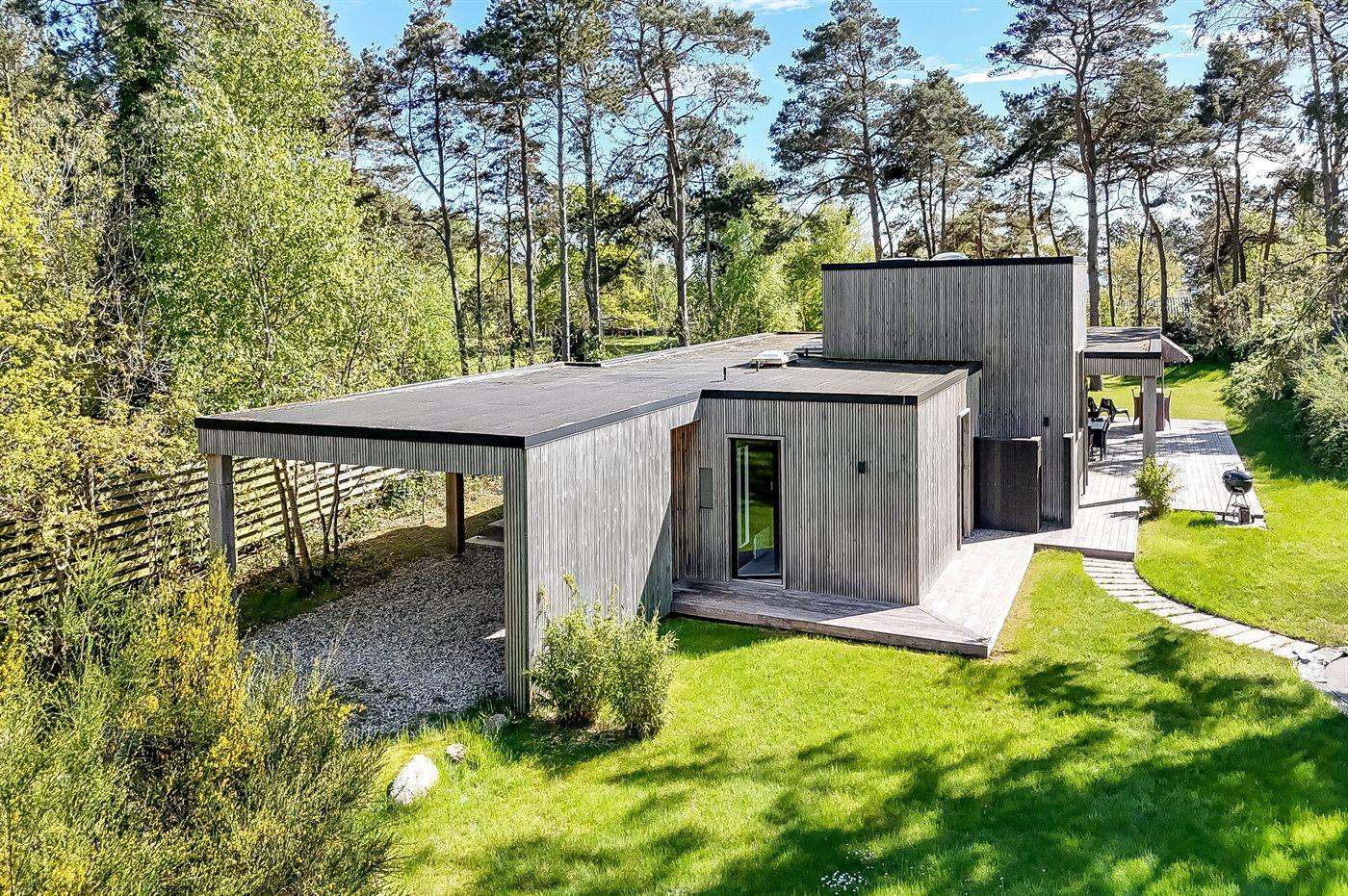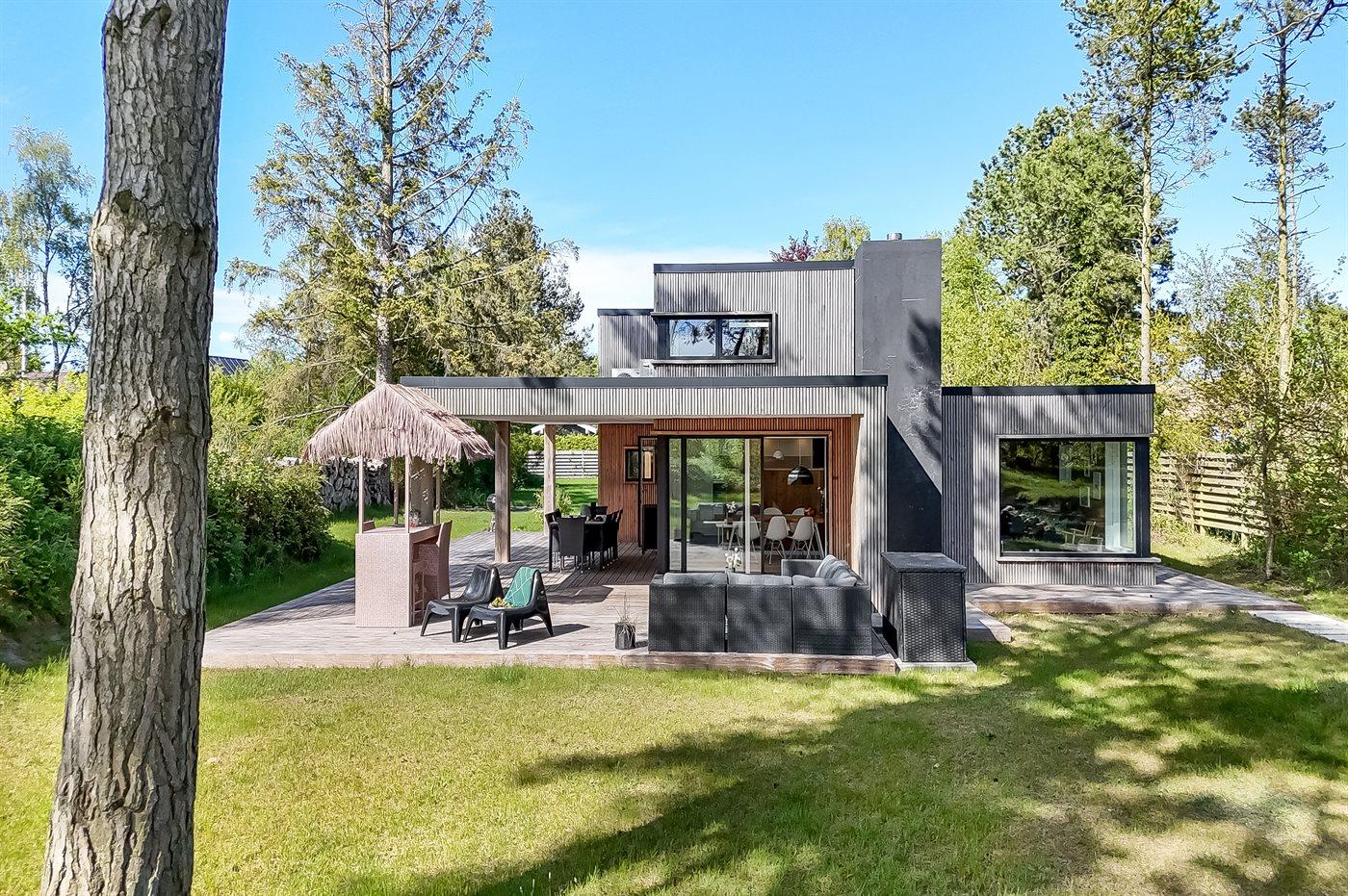 Eksklusivt nyt sommerhus tæt på børnevenlig strand med aktivitetsrum og stor terrasse i naturskønne omgivelser.