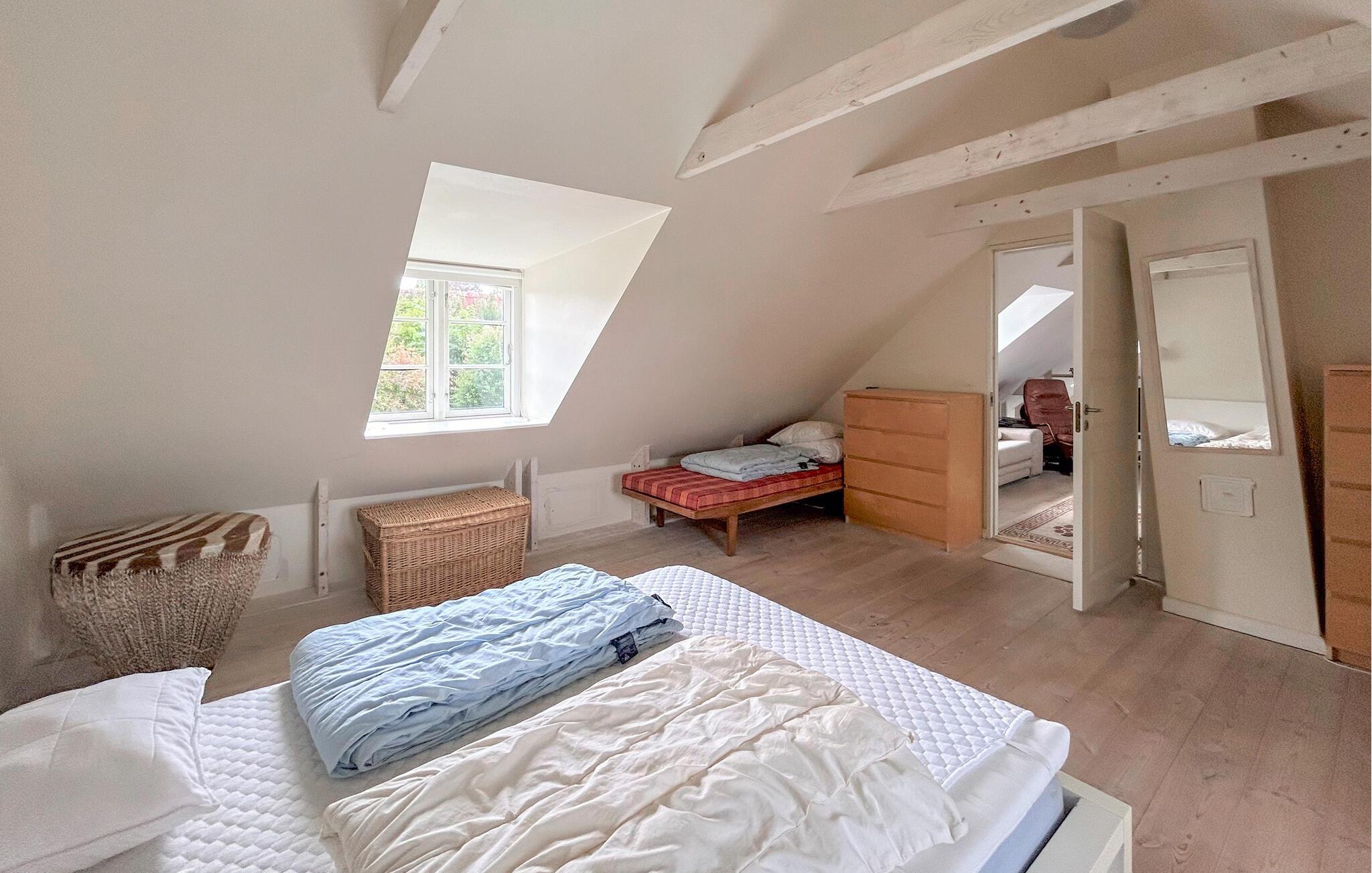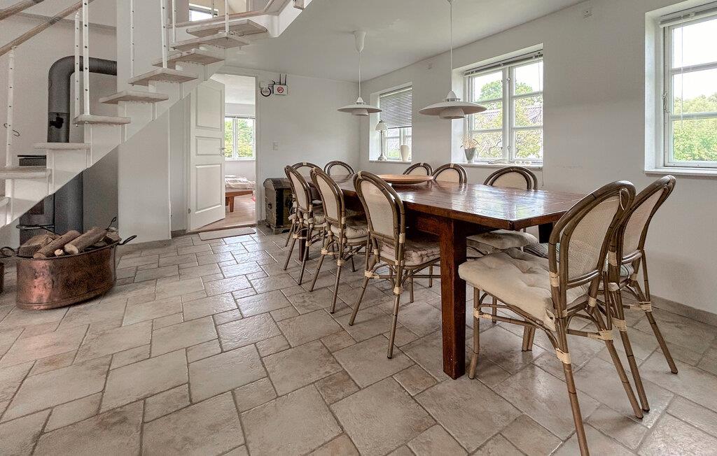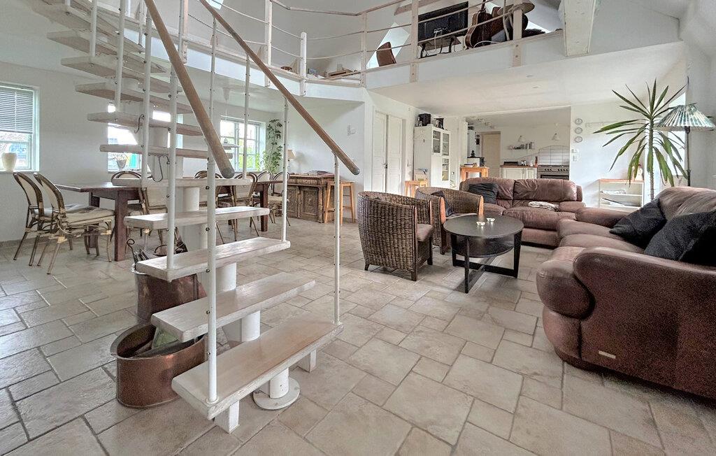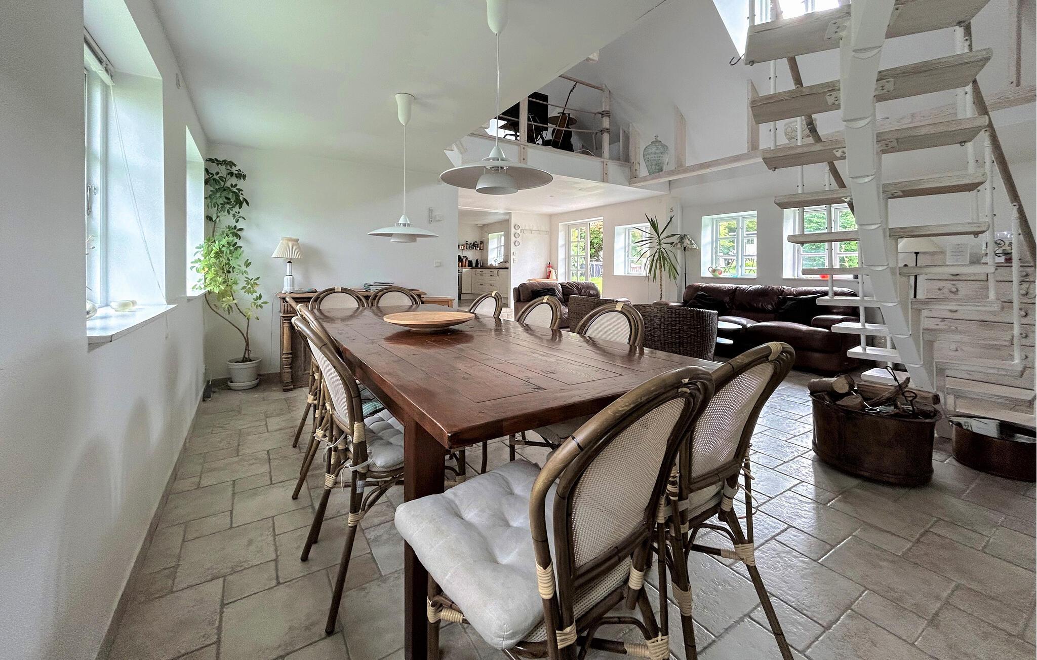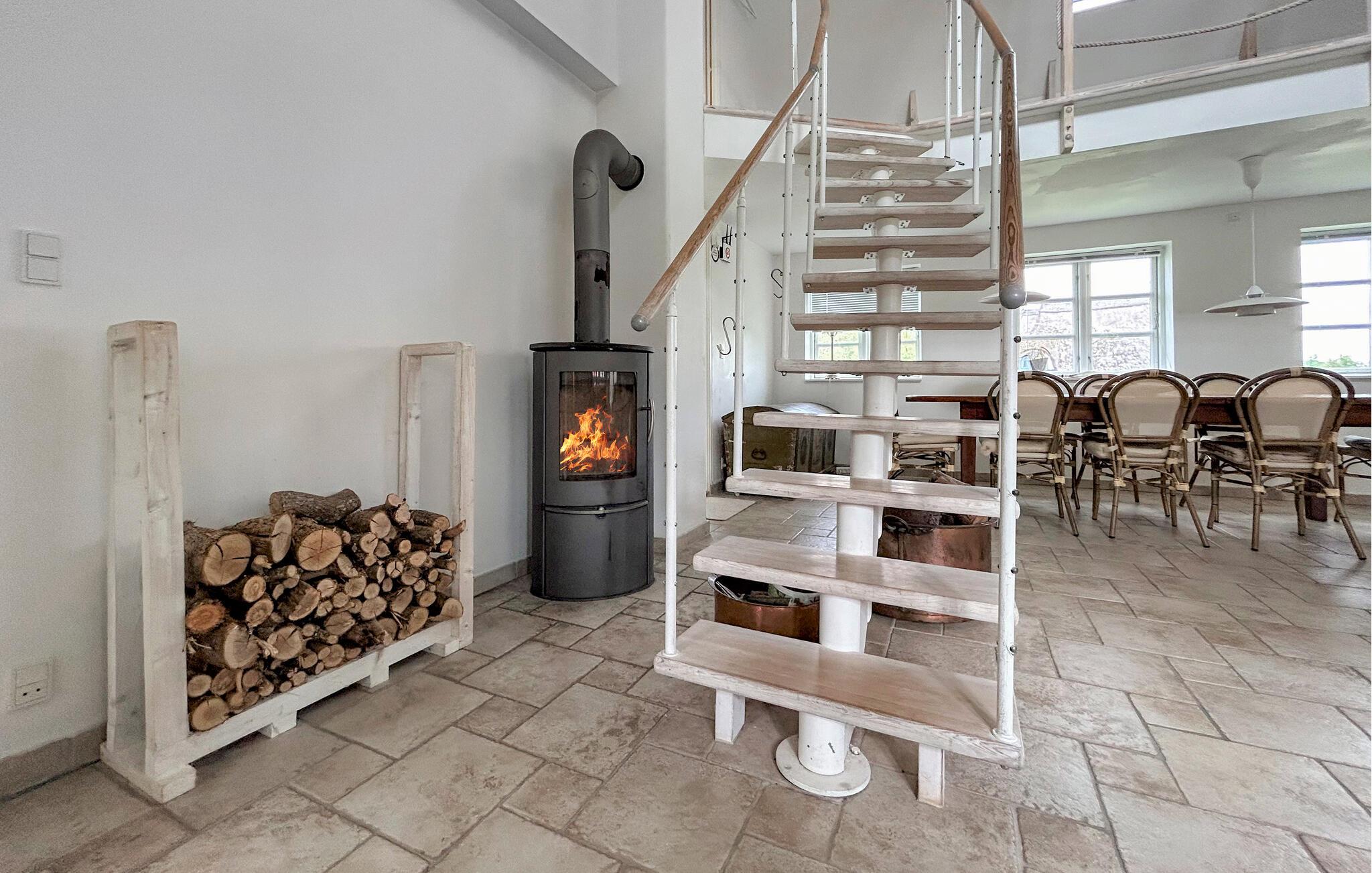 Dette hus forener komfort, hygge og historisk charme på en harmonisk måde. Den åbne, lyse arkitektur giver masser af plads til fælles stunder. I den rummelige opholdsstue kan I lave mad, spise og tilbringe hyggelige aftener ved pejsen, mens hemsen med komfortable sofaer indbyder til rolige timer med læsning eller tv.