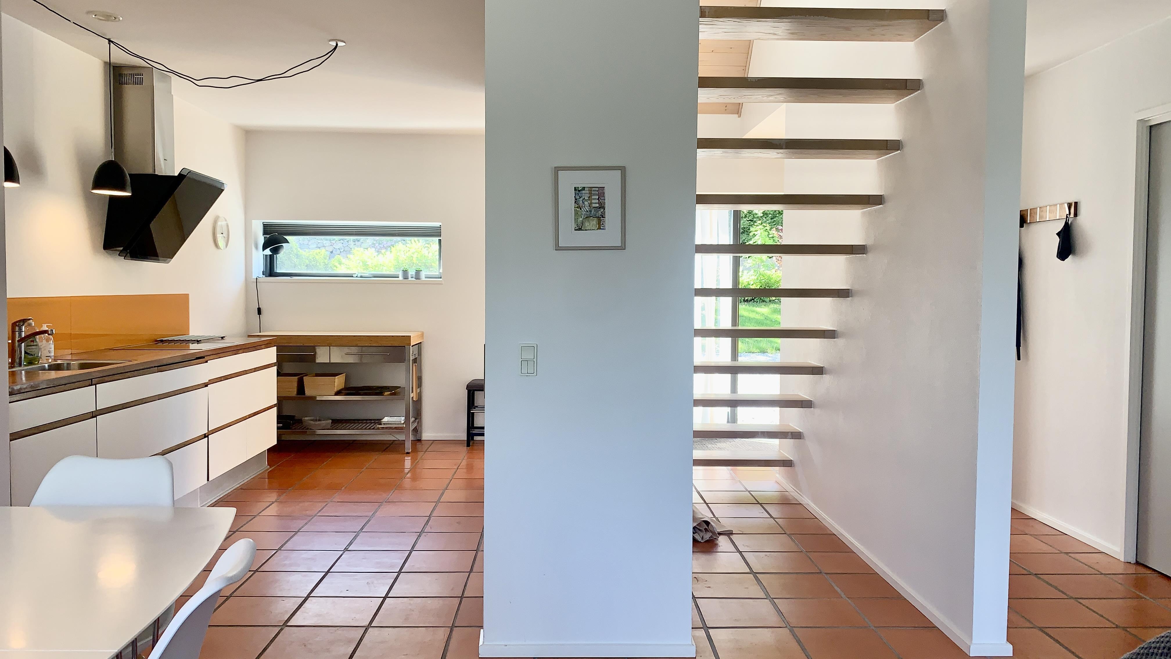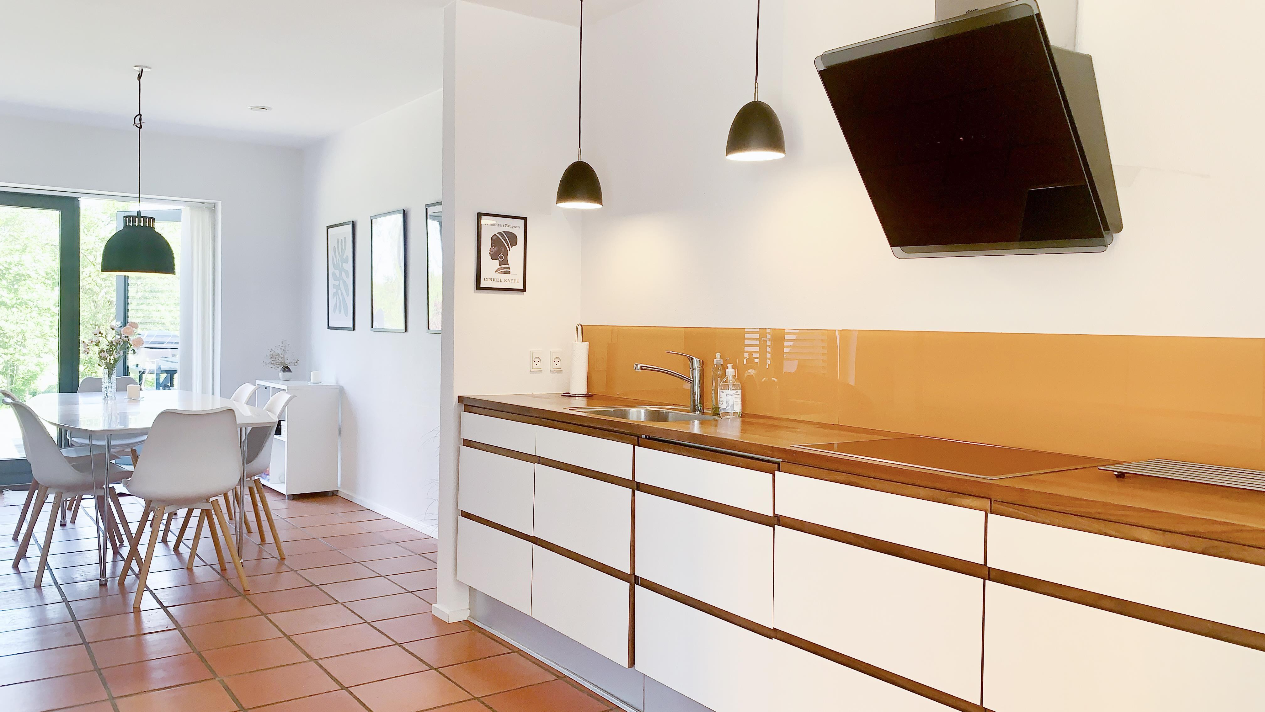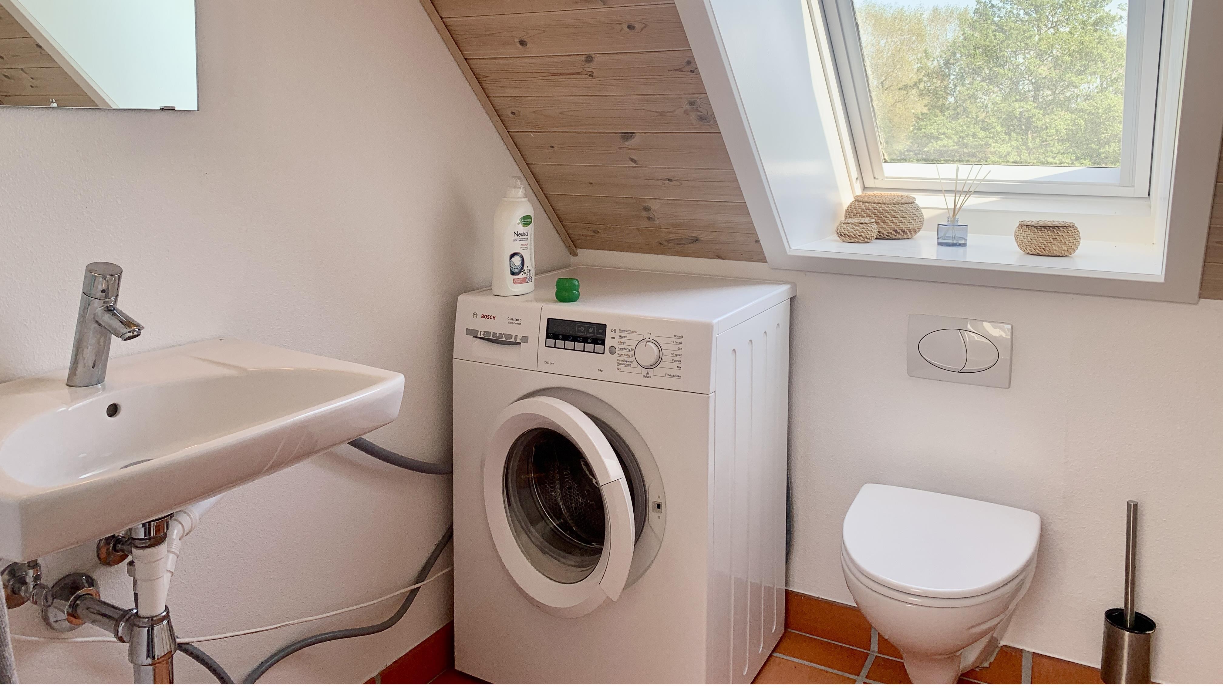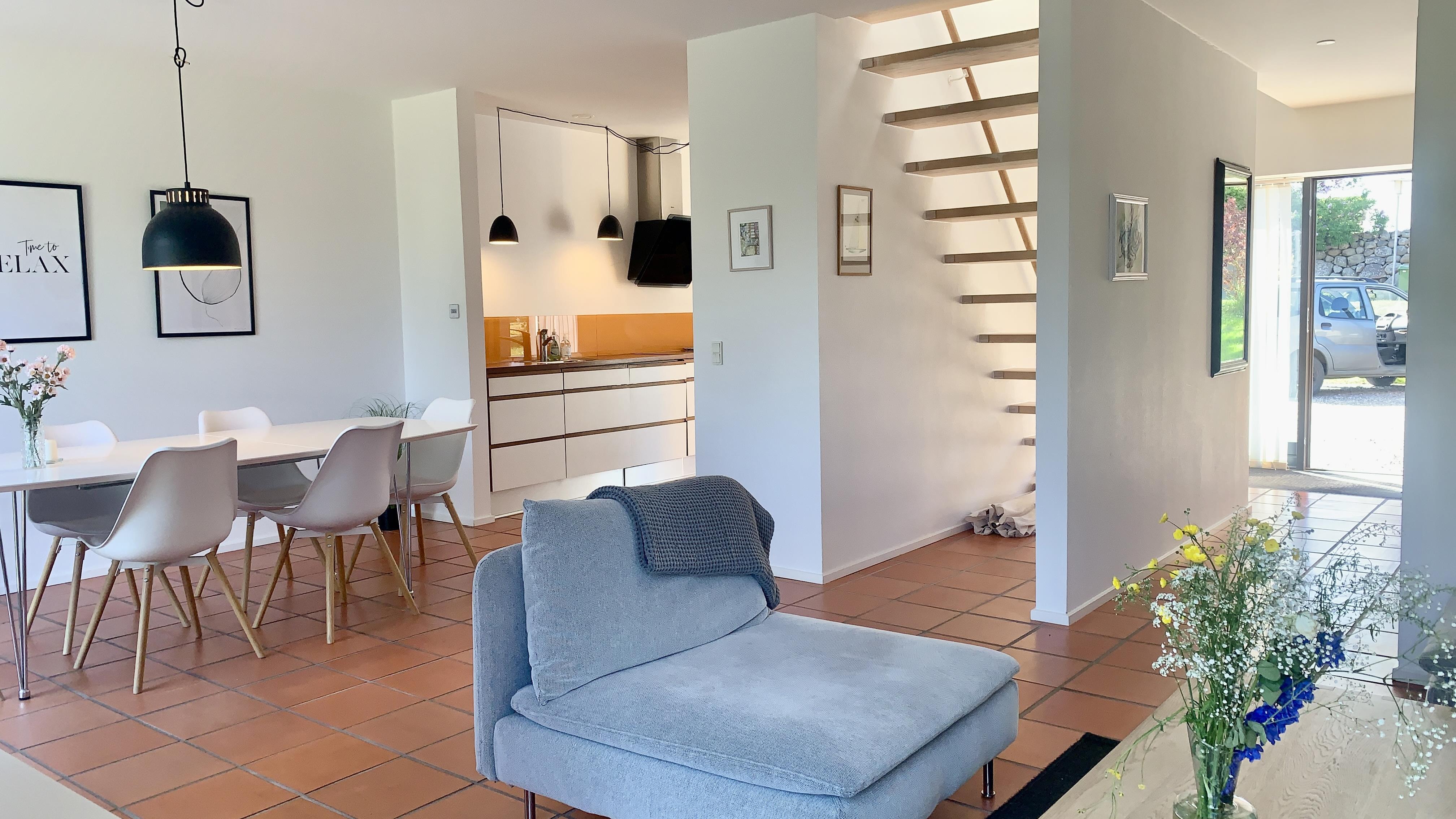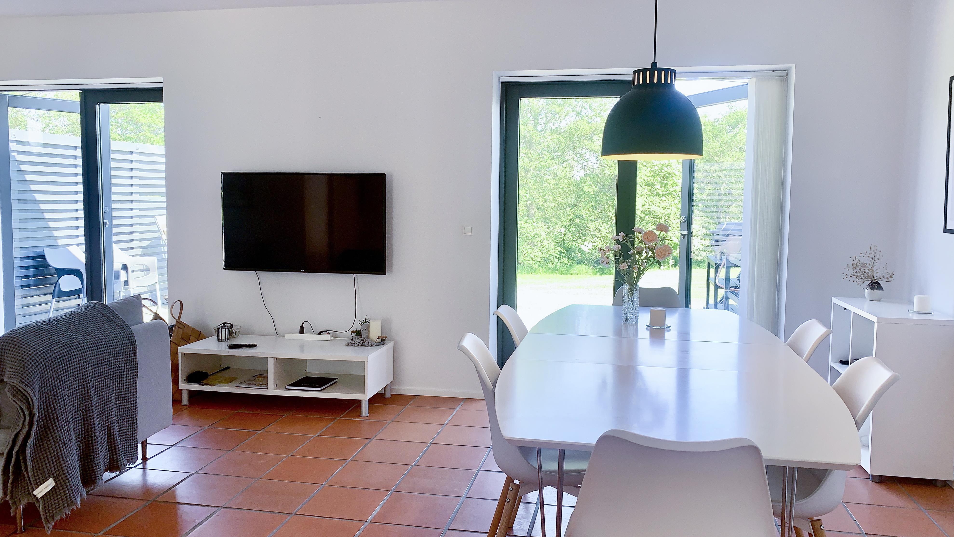 Huset er lyst, moderne og indbydende med en god rumfordeling. I stueetagen finder du et åbent køkken-alrum med spiseplads og sofahjørne, store vinduespartier og direkte adgang til terrassen. Her kan I samles til måltider, hygge med spil eller se TV med Chromecast. Badeværelset ligger også i stueetagen.