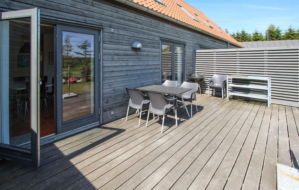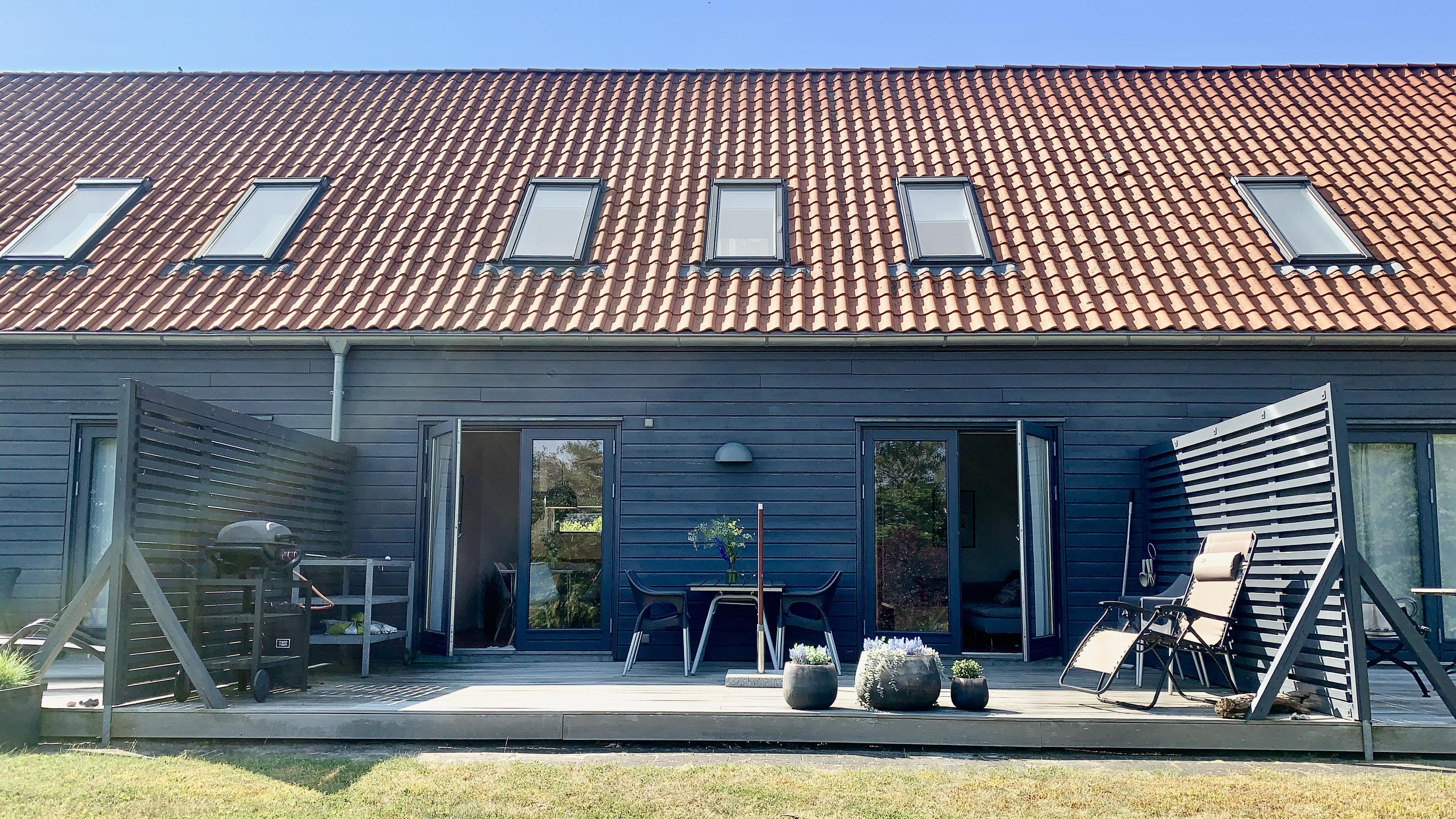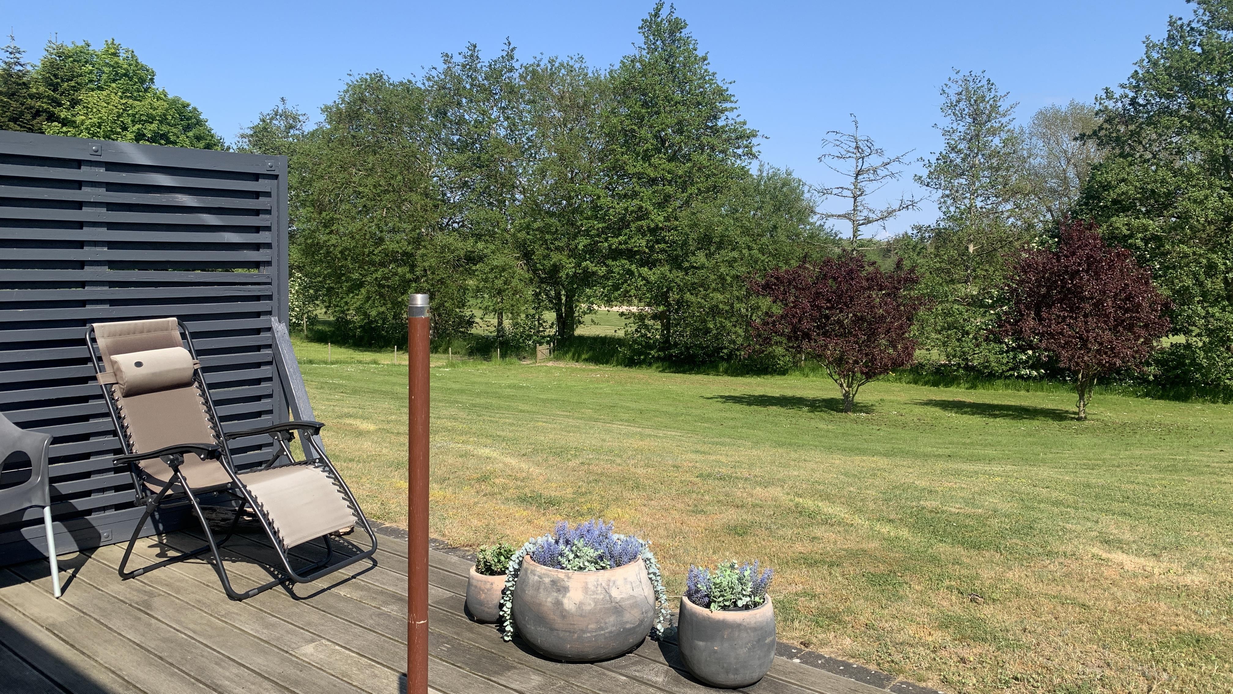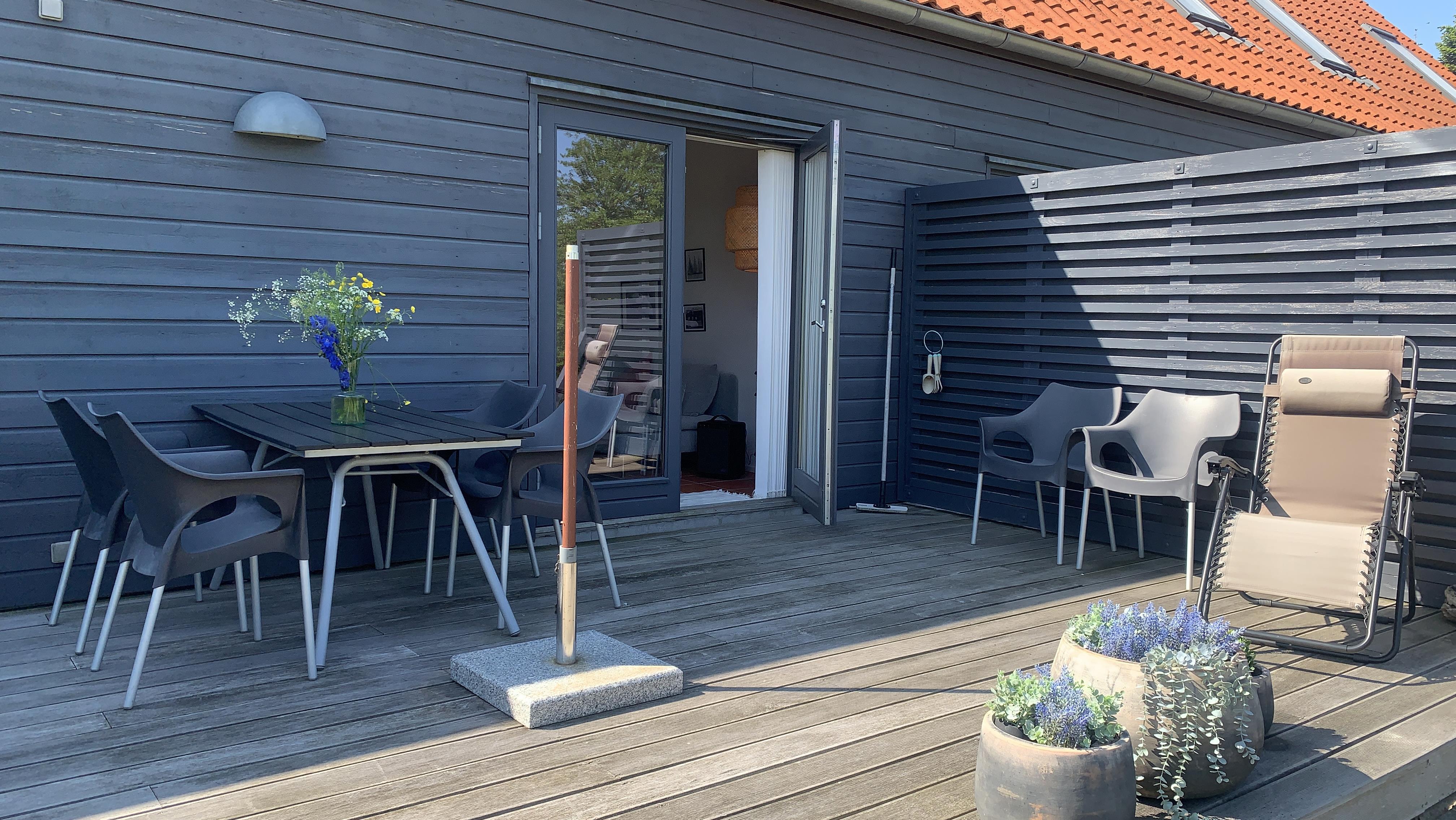 Fra stuen og køkken/alrummet kommer I ud på en afskærmet terrasse med havemøbler, parasol og grill. Her kan I nyde solen og udsigten til golfbanen i fredelige omgivelser.