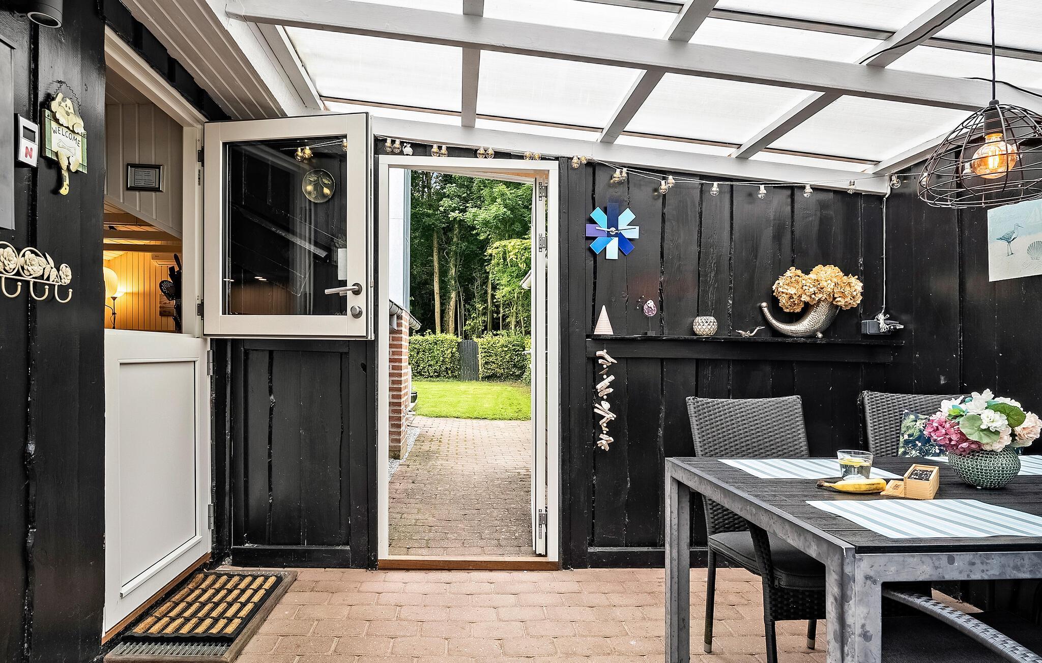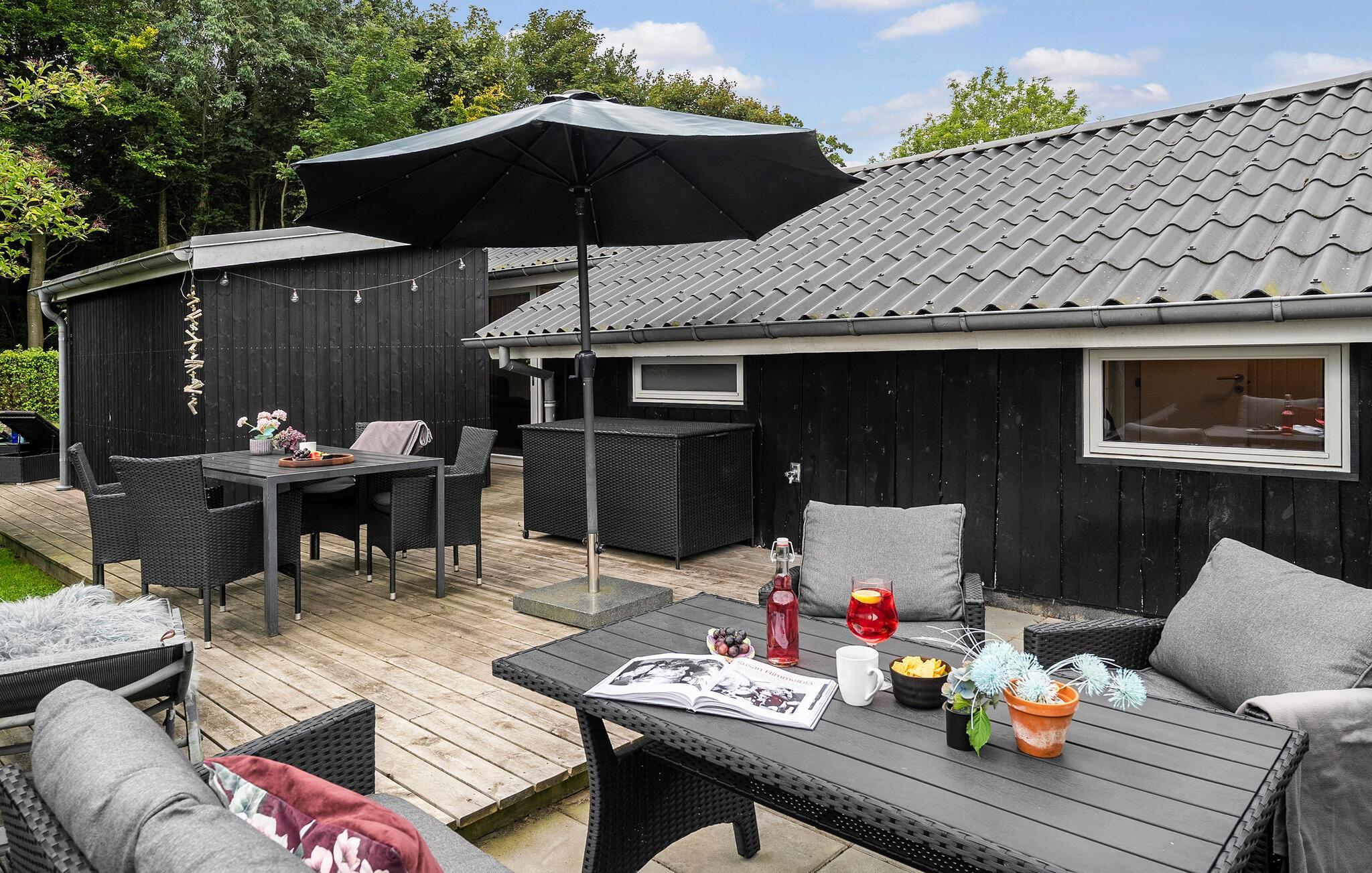 I haven kan I sidde dejligt på den åbne og overdækkede terrasse. Tilbered noget lækkert på grillen, nyd solen i de komfortable liggestole og læg hverdagen bag jer.