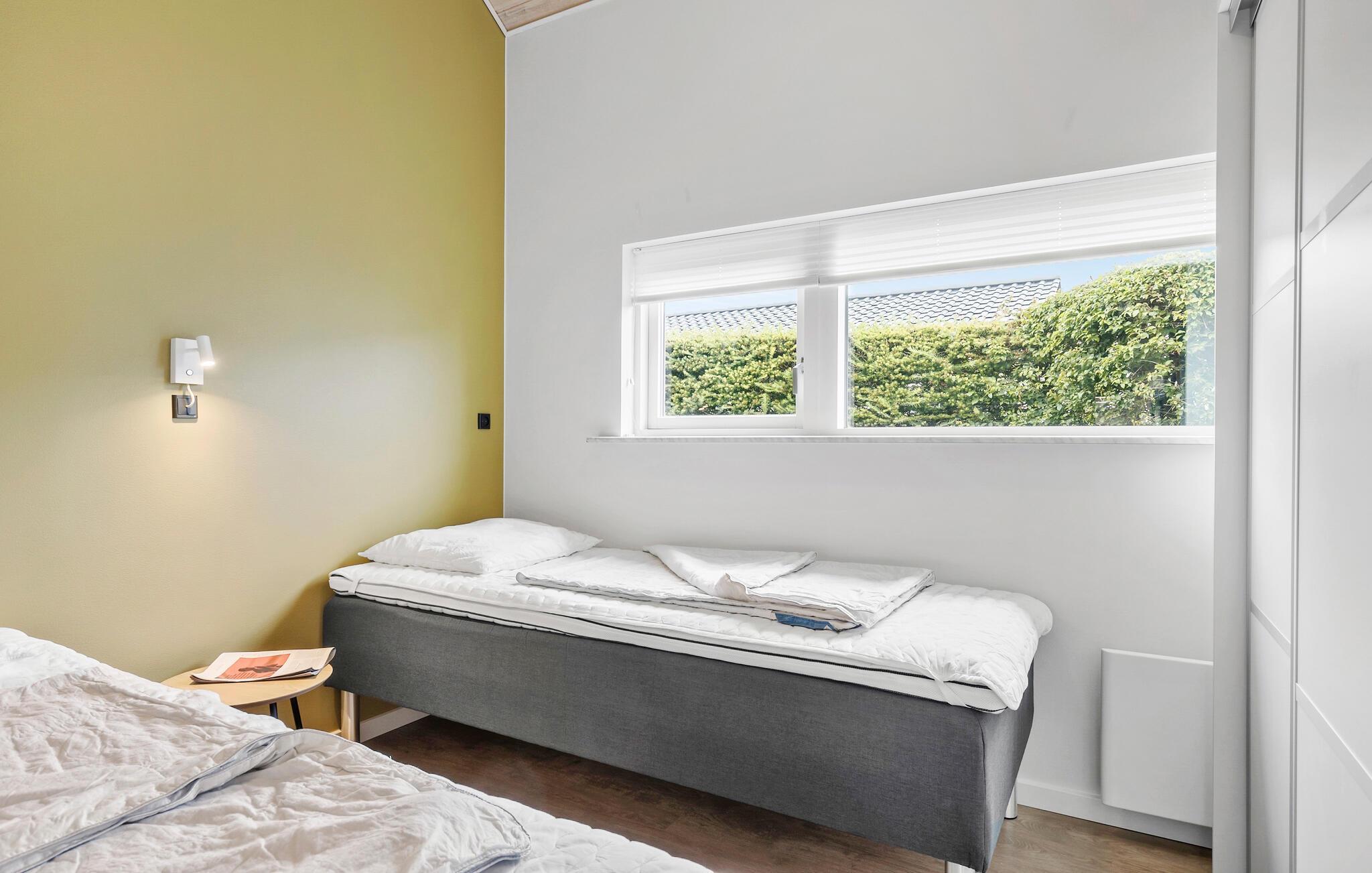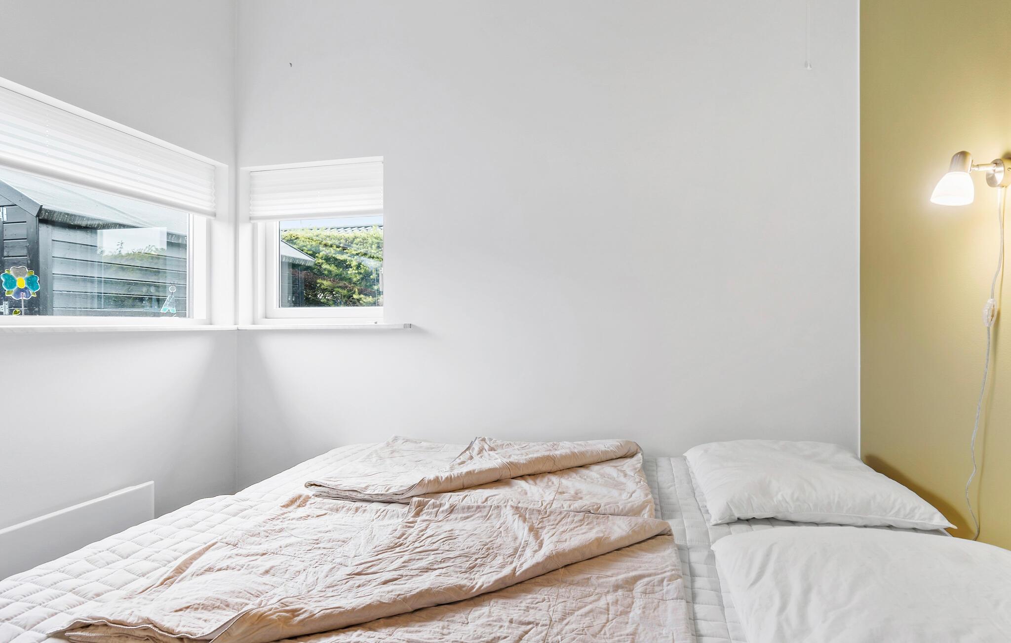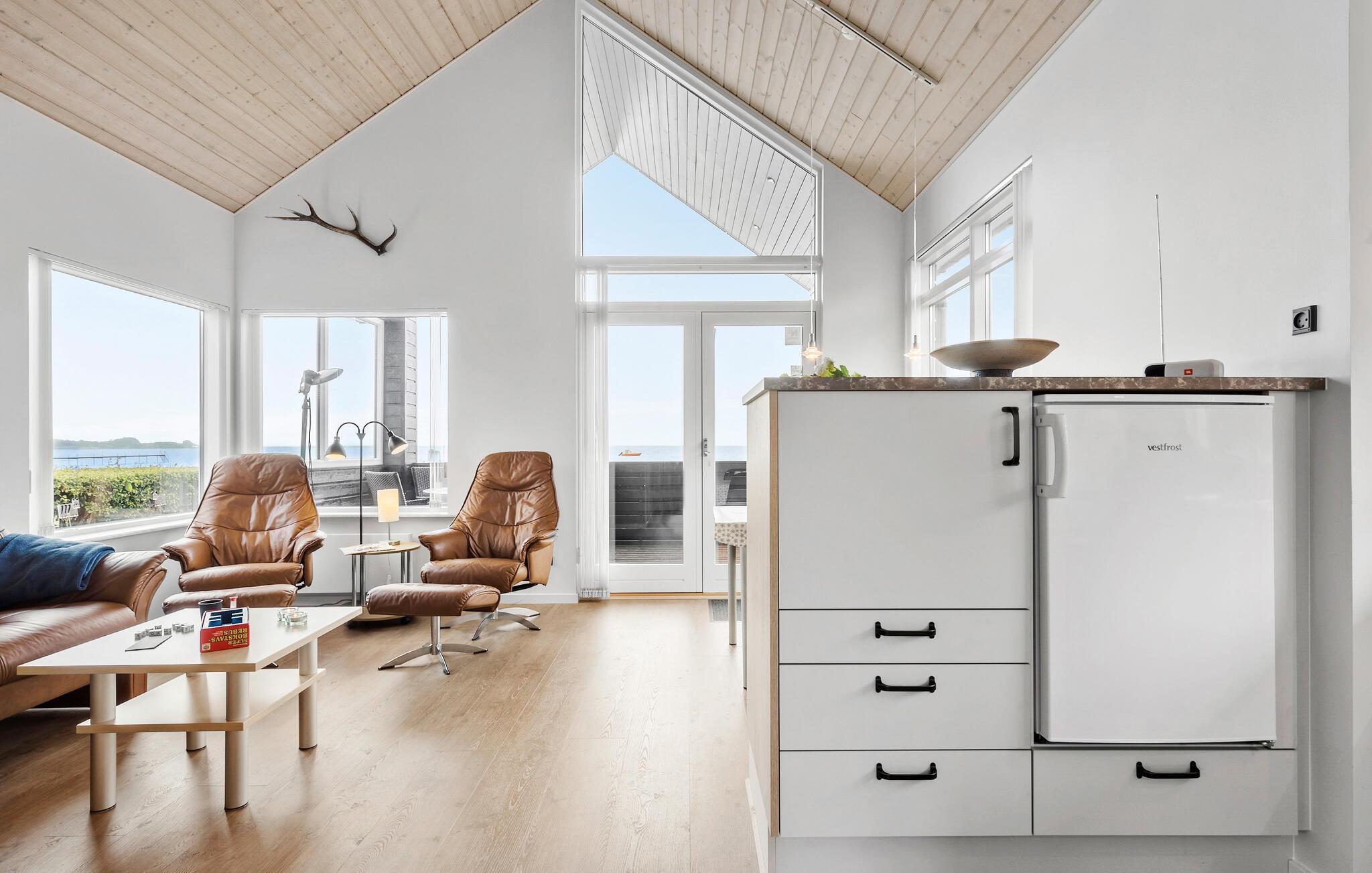Med kun 10 m til områdets mest børnevenlige badestrand får I ikke bedre beliggenhed end i dette skønne sommerhus. Huset ligger på en lille grund med to gode overdækkede terrasser, det ene med direkte udsigt til stranden og det andet på bagsiden af huset, så I kan sidde ugenert og nyde kaffen eller aftensmaden. Inde fra huset kan I også nyde udsigten gennem de store panoramavinduer, både fra stuen og køkkenet som ligger i åben forbindelse. Der er et dejligt soveværelse med skabsvæg i huset, og med indgang fra den overdækkede terrasse er der adgang til et stort anneks med yderligere en dobbeltseng. Derudover findes der to sovepladser på hemsen. Et rigtig dejligt sommerhus hvor I kan nyde ferien, badestranden og tage på udflugt i området.