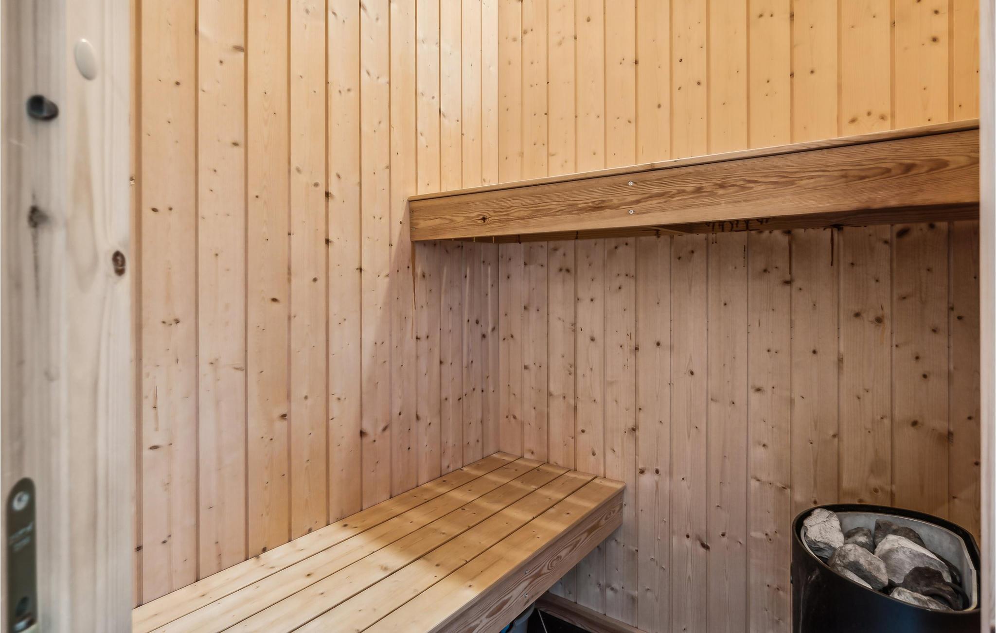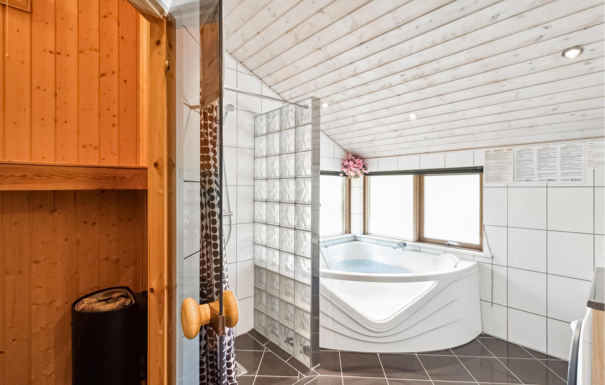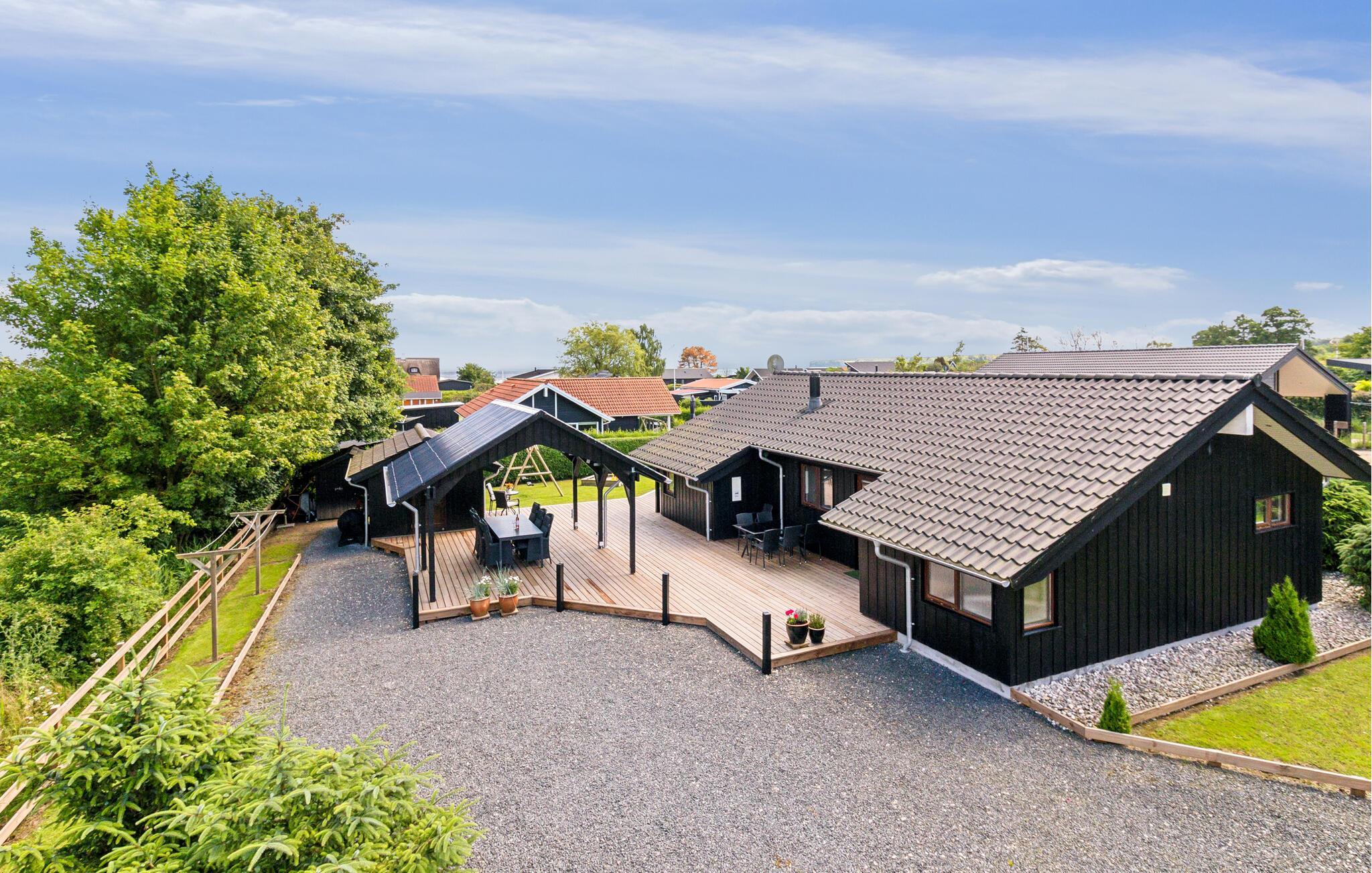Moderne træhus nær Binderup Strand med spabad, sauna og stor terrasse for afslapning i naturen.