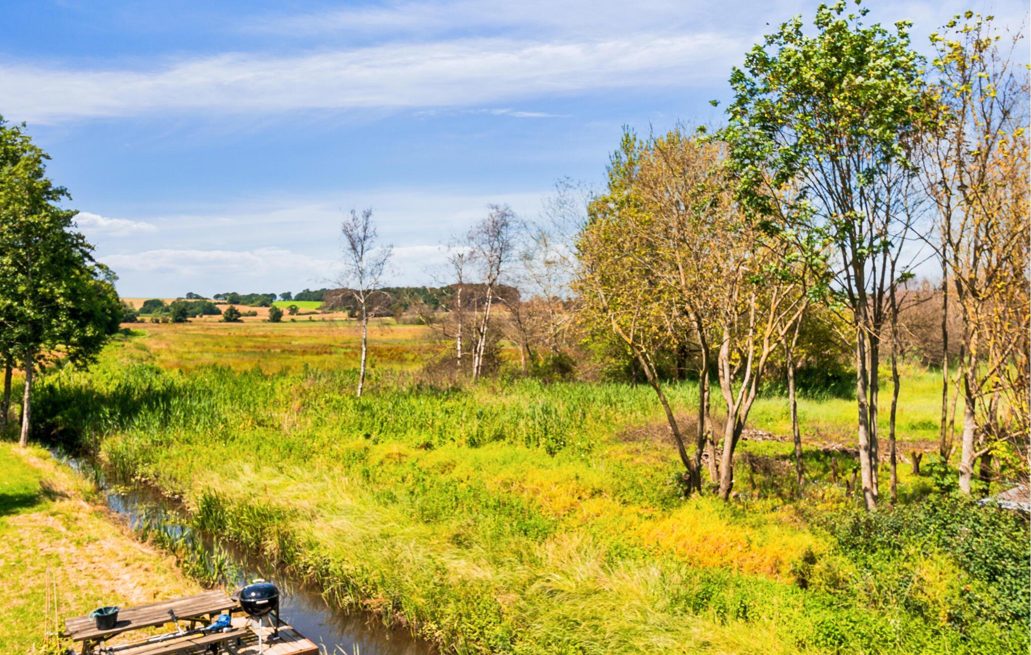 Huset ligger uforstyrret og tæt på naturen for enden af lukket vej ud mod fredede arealer med eng, marker og skov. Det ligger i udkanten af et stort feriehusområde ikke mange meter fra stranden.