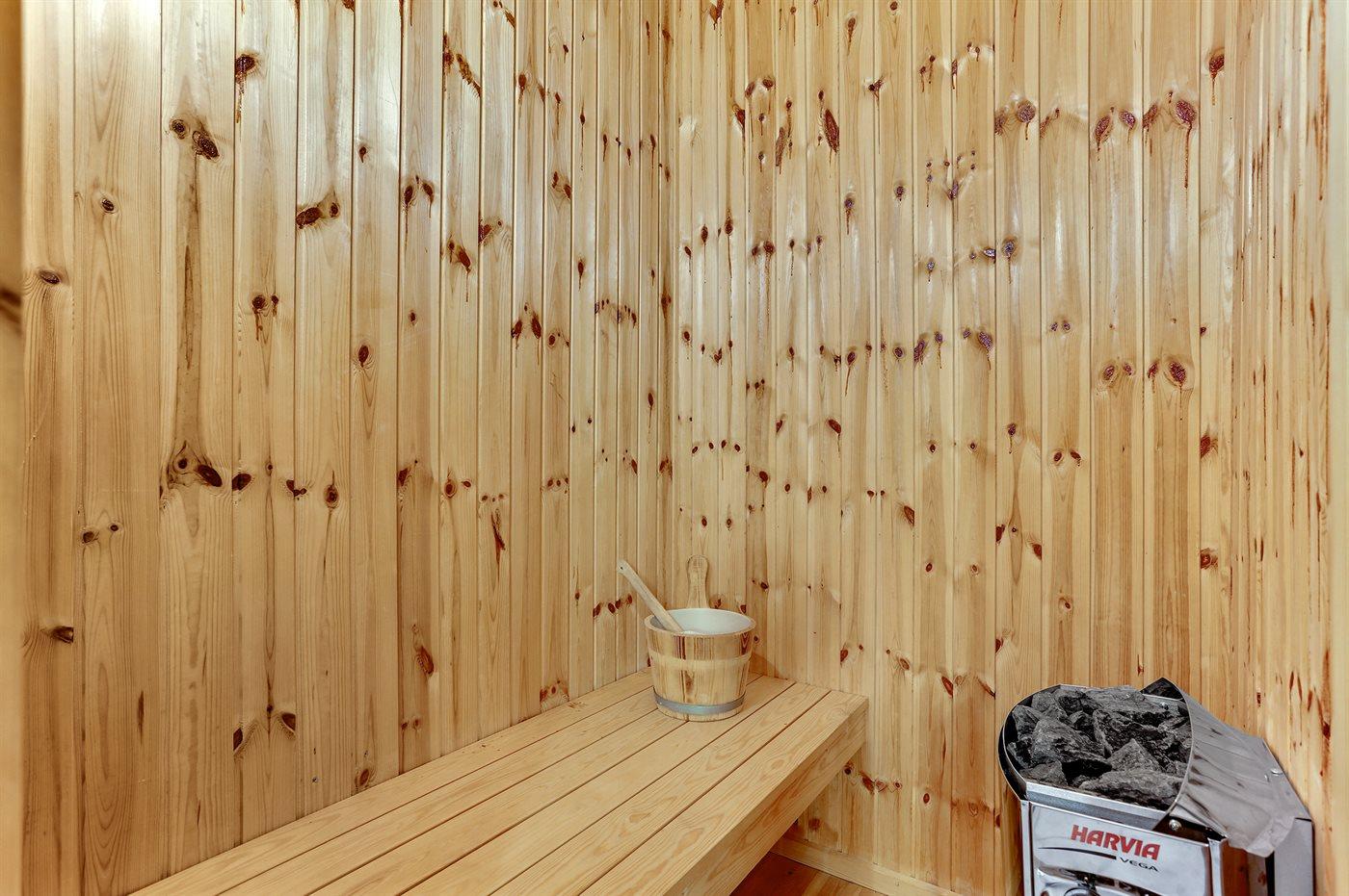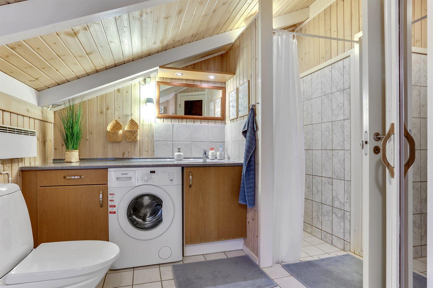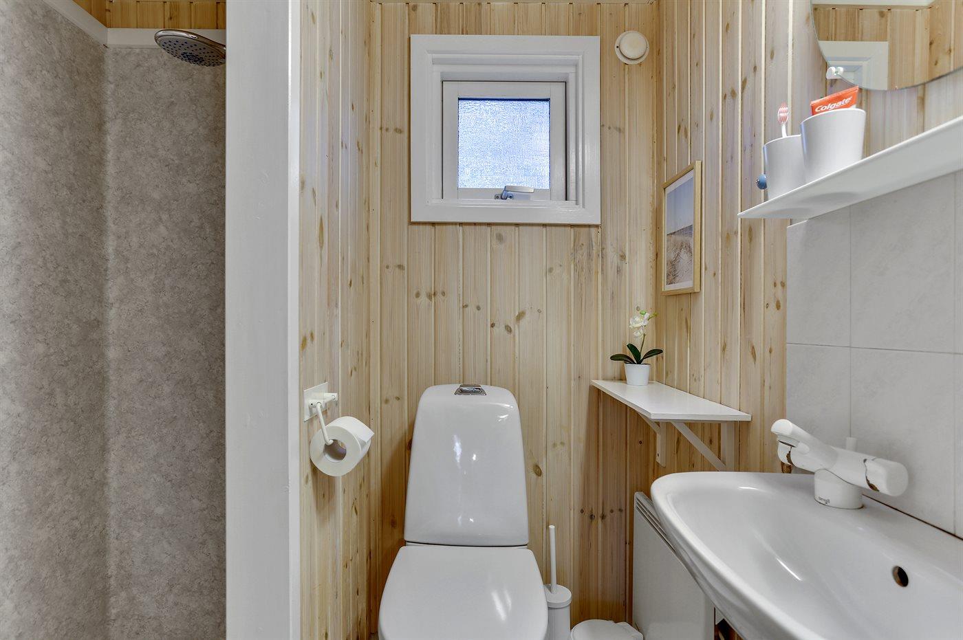 Der er 2 badeværelser med bruseniche og 2 toiletter. Der er gulvvarme på 1 badeværelse. I saunaen er der mulighed for afslapning.