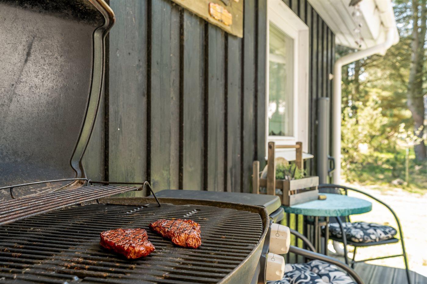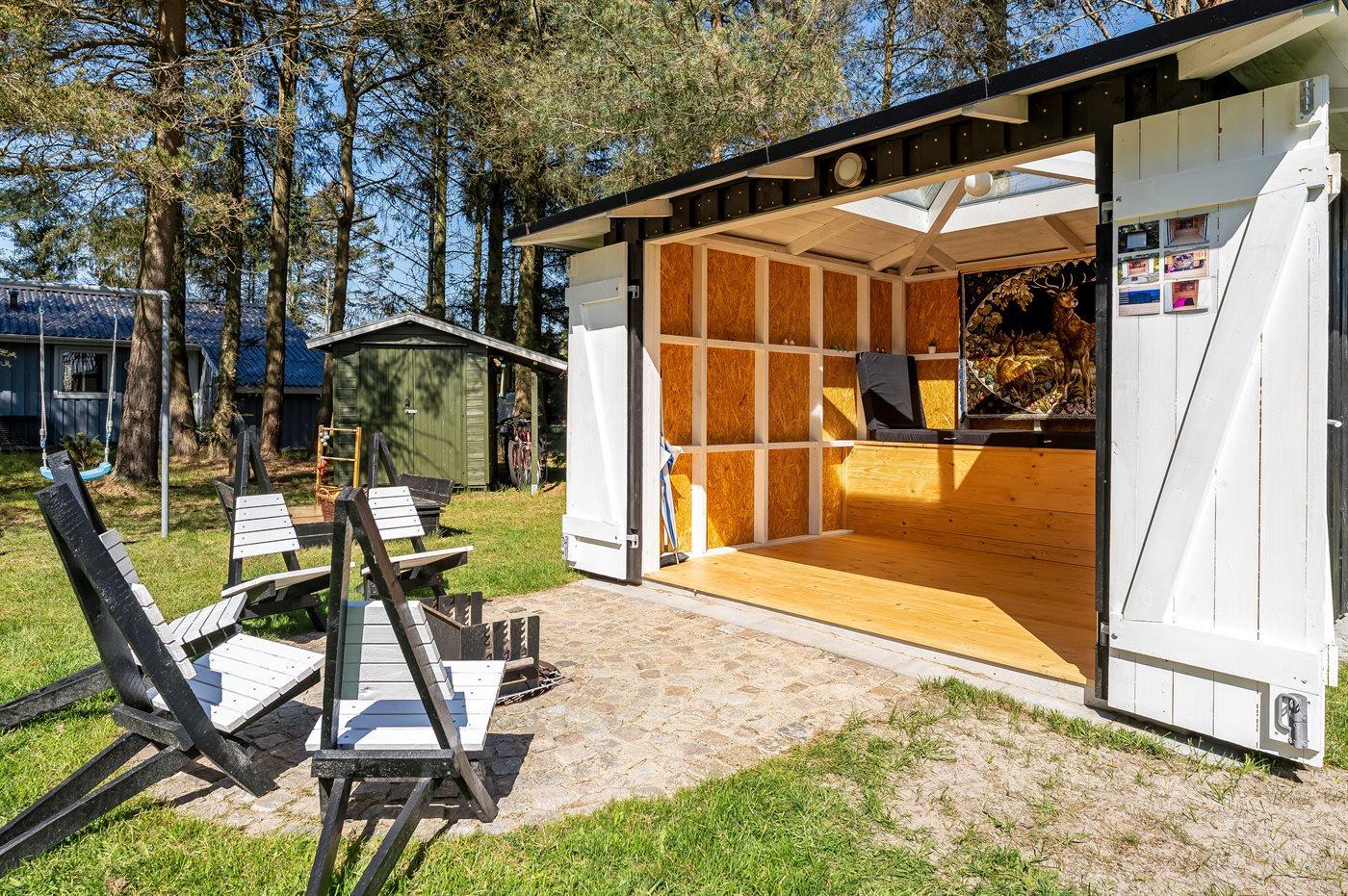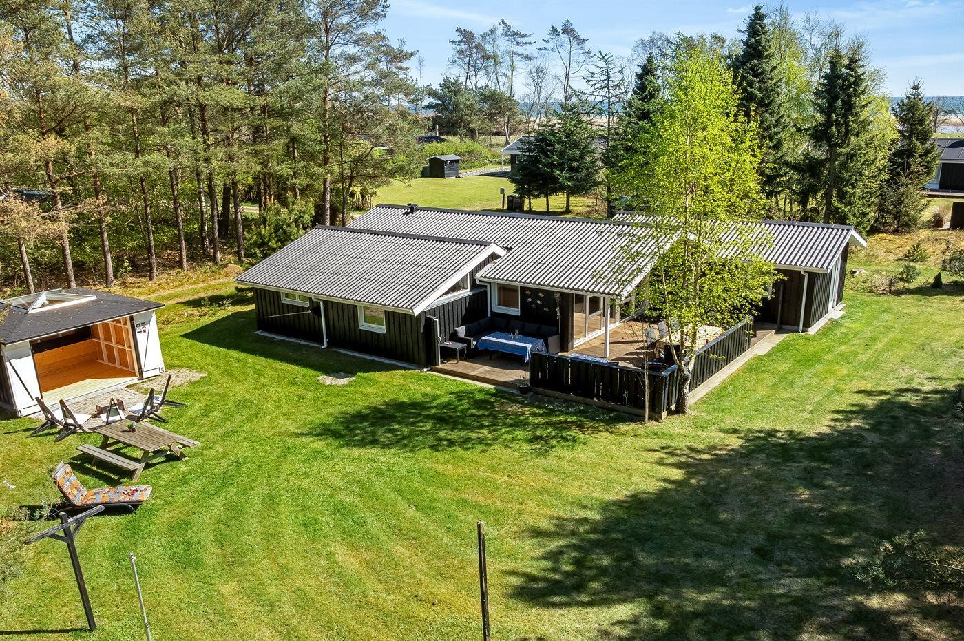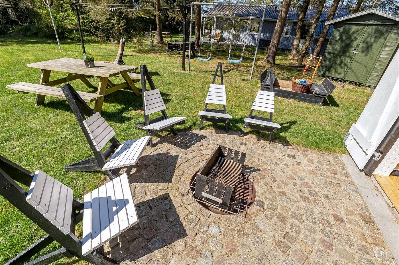 Ferieboligen er beliggende på en 1058 m² stor havegrund. Der er 200 m til havet. Nærmeste forretning er beliggende i en afstand af 2000 m. Der er en golfbane i en afstand af 500 m. Til ferieboligen hører 40 m² terrasseareal. Desuden er der 9 m² overdækket terrasse. Gynge. Sandkasse. Bålsted. Der er installeret stik til opladning af elbil. Parkering ved ferieboligen.