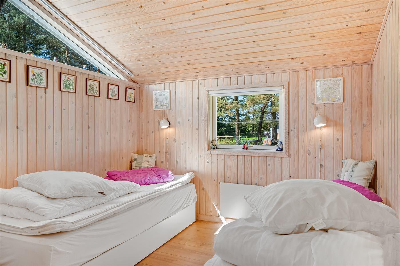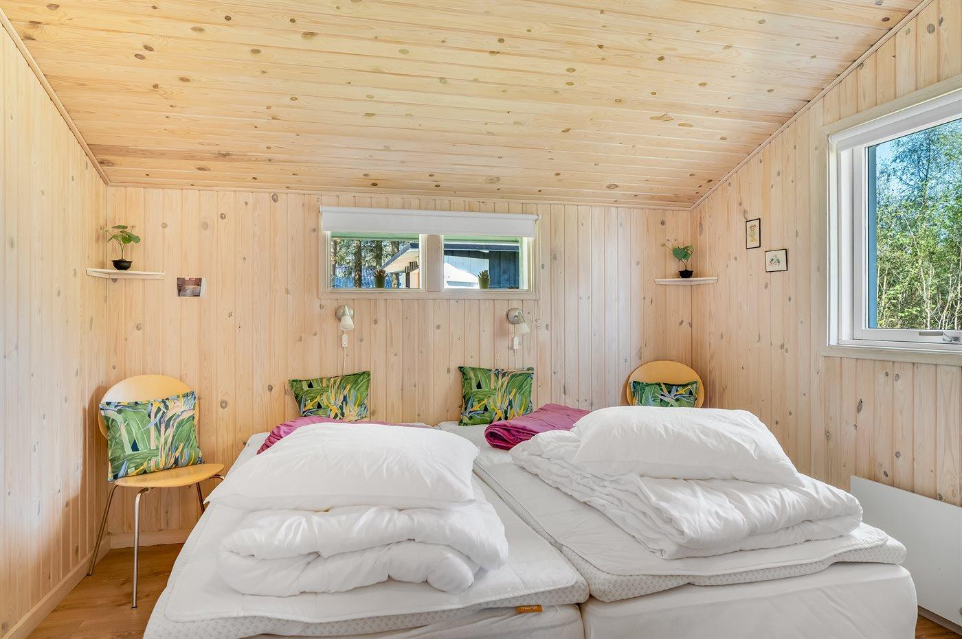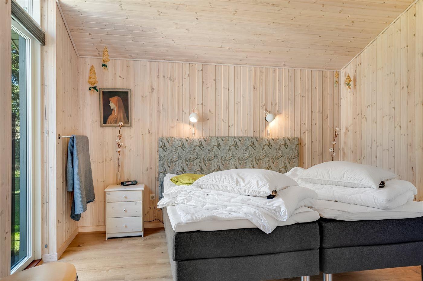 Der er i alt 3 soveværelser. Sovepladserne fordeler sig på: 4 sovepladser i dobbeltsenge. 2 sovepladser i enkeltsenge. Derudover er der 1 stk. barneseng.