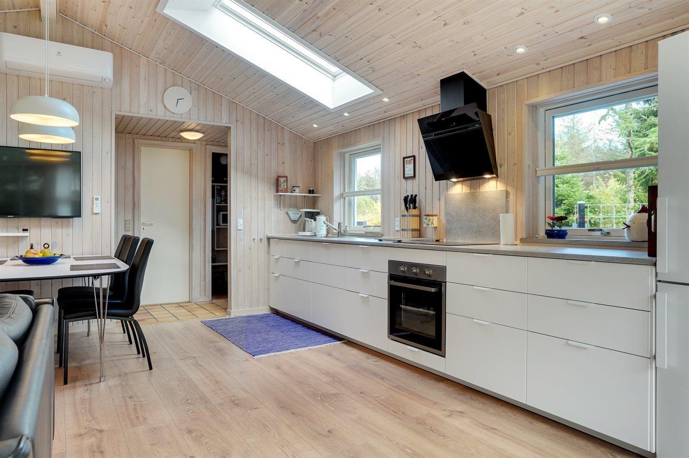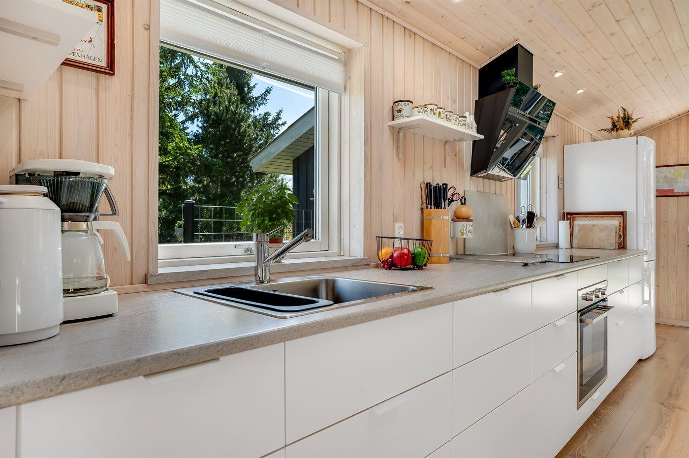 Køkkenet er udstyret med 1 køleskab. Der er 4 induktionskogeplader, varmluftovn, mikrobølgeovn samt opvaskemaskine.