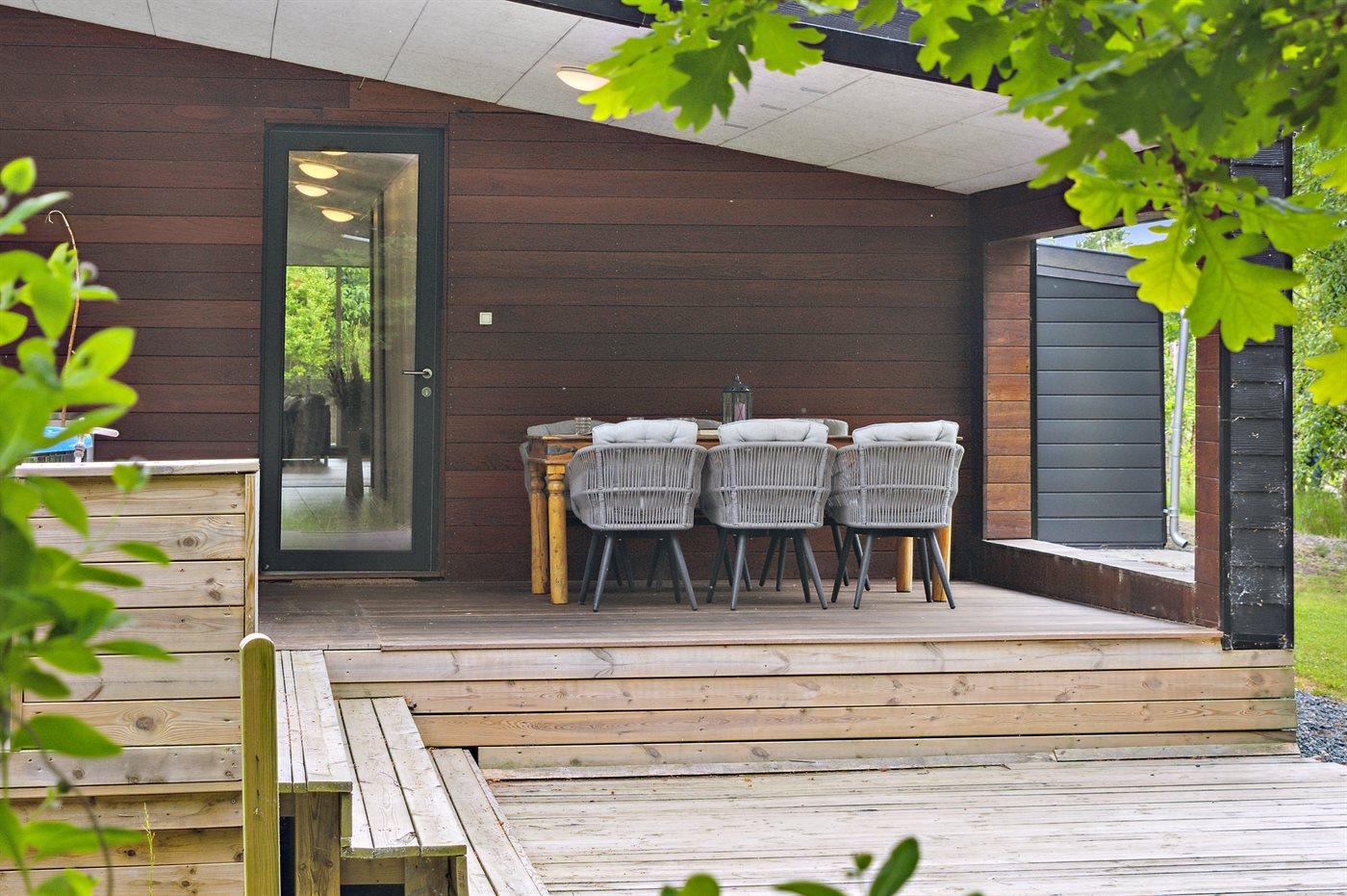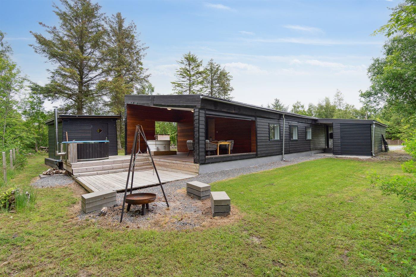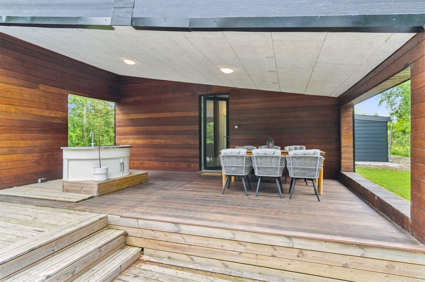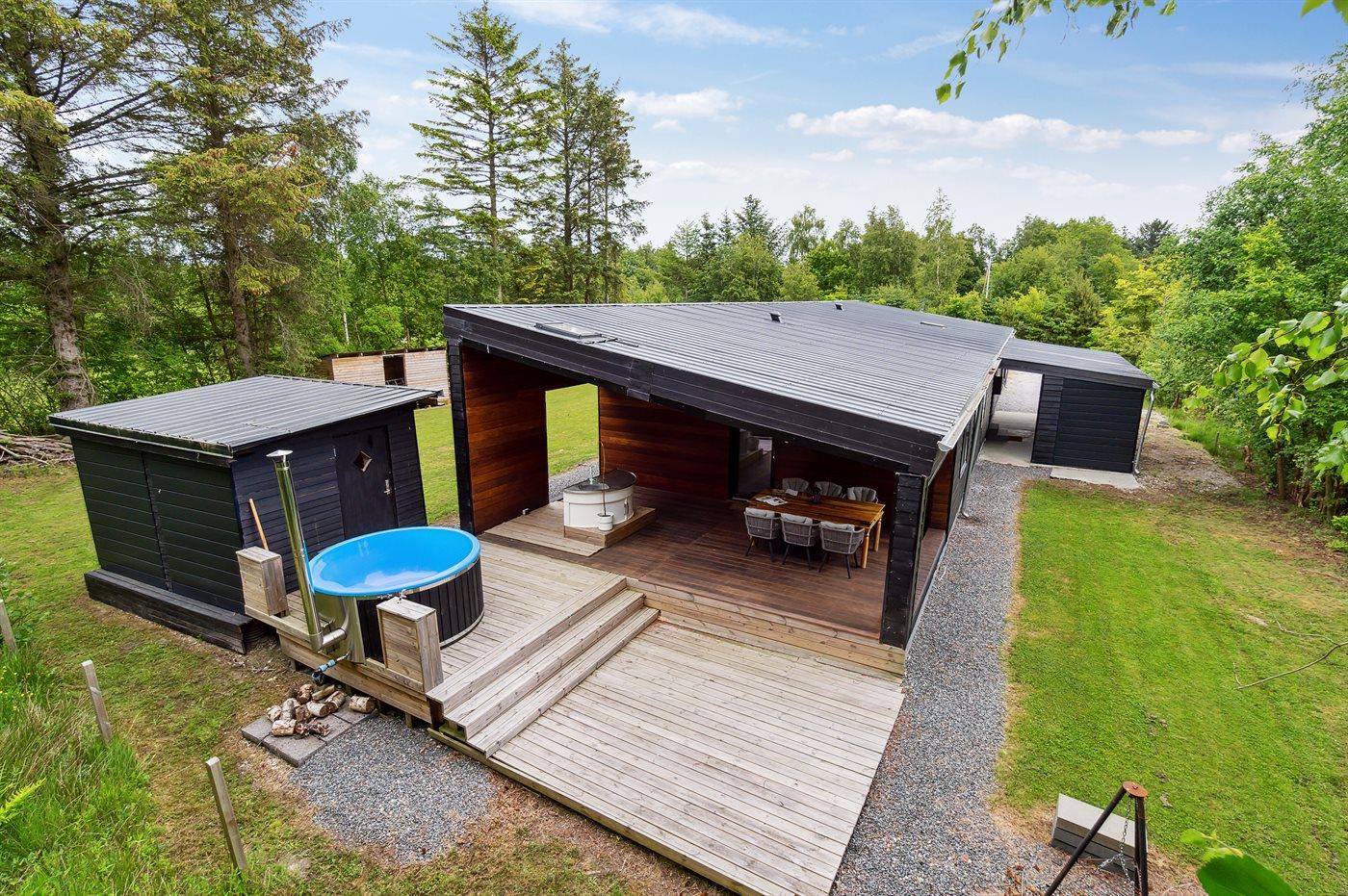 Sommerhuset fremstår lyst og moderne og med en rigtig god planløsning. Her er god plads til f.eks. to familier, som ønsker at holder ferie sammen i disse dejlige omgivelser. Her findes tilmed nogle fantastiske terrassearealer, som også er delvist overdækket – der er to store terrasser på begge sider af sommerhuset, så der er altid mulighed for at nyde solen og roen. På den ene terrasse findes et vildmarksbad til 4 personer, hvori man kan sidde helt ugeneret.
