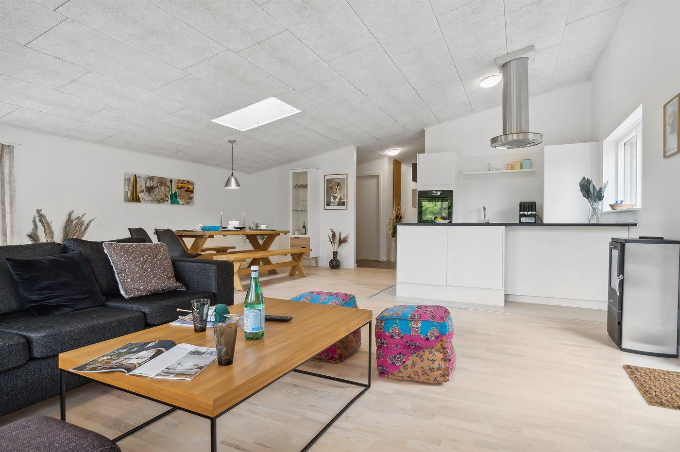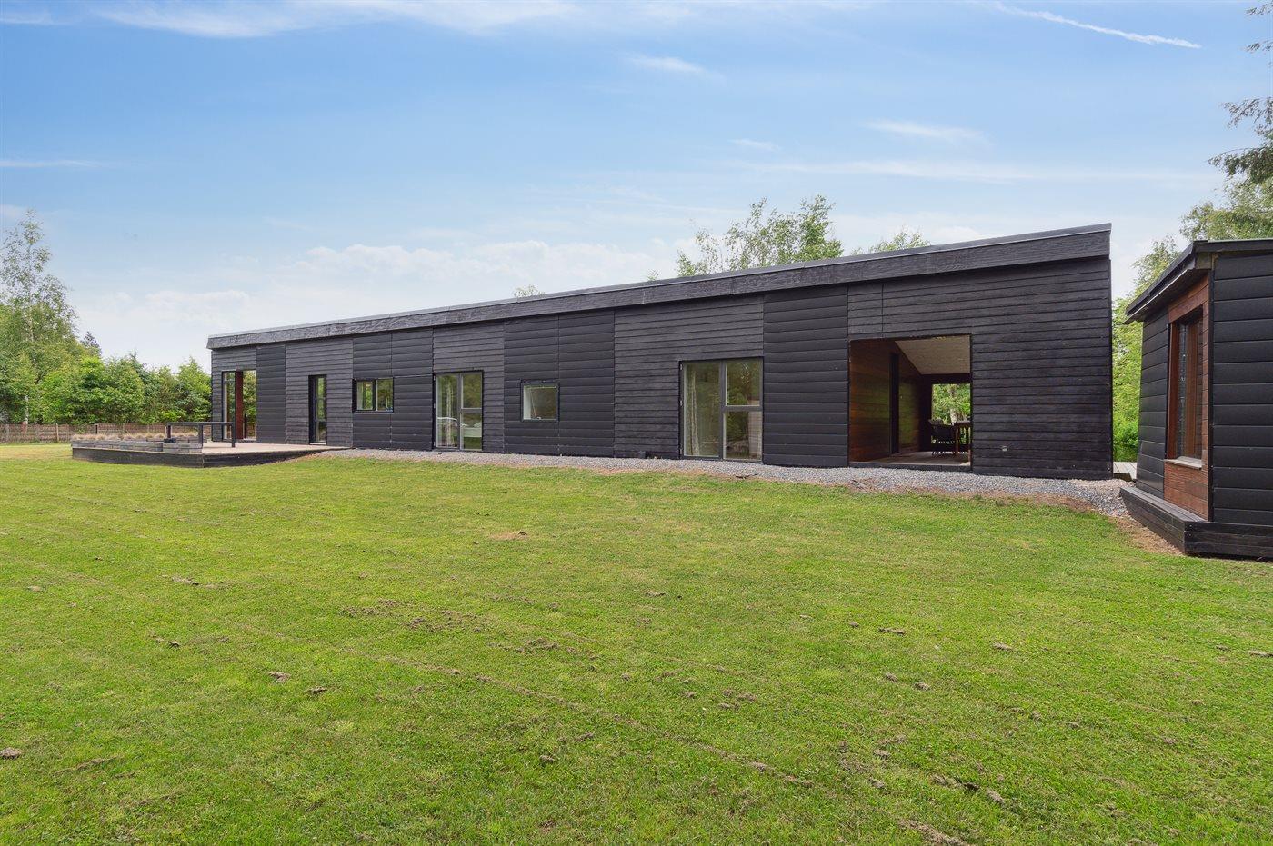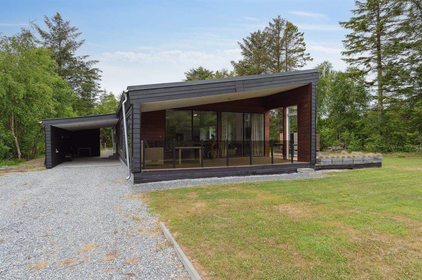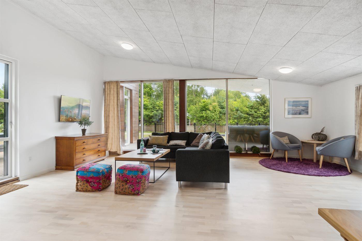Sommerhuset fremstår lyst og moderne og med en rigtig god planløsning. Her er god plads til f.eks. to familier, som ønsker at holder ferie sammen i disse dejlige omgivelser. Her findes tilmed nogle fantastiske terrassearealer, som også er delvist overdækket – der er to store terrasser på begge sider af sommerhuset, så der er altid mulighed for at nyde solen og roen. På den ene terrasse findes et vildmarksbad til 4 personer, hvori man kan sidde helt ugeneret.
