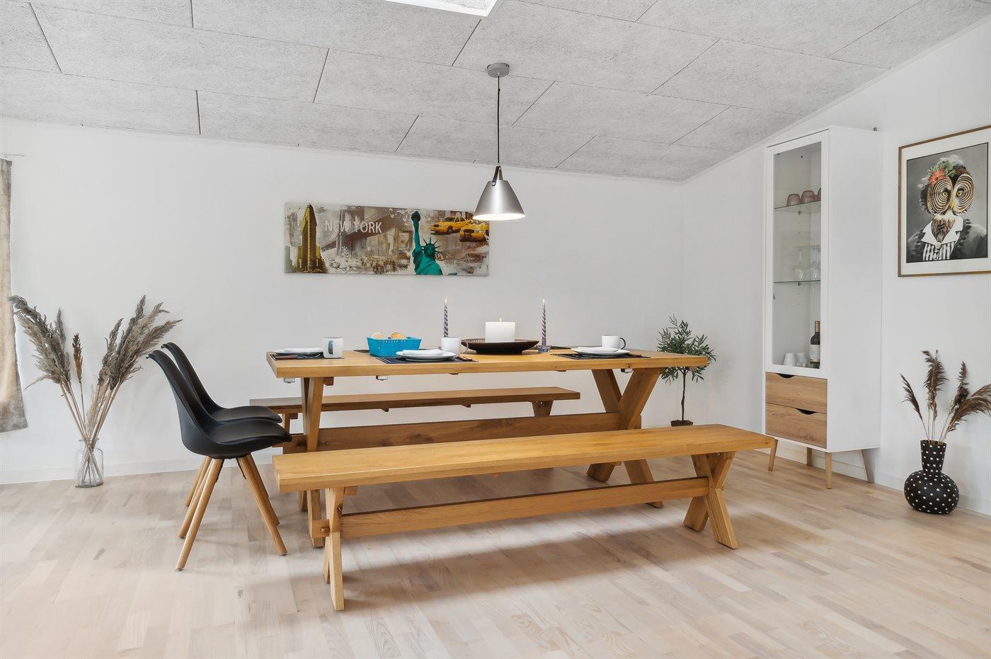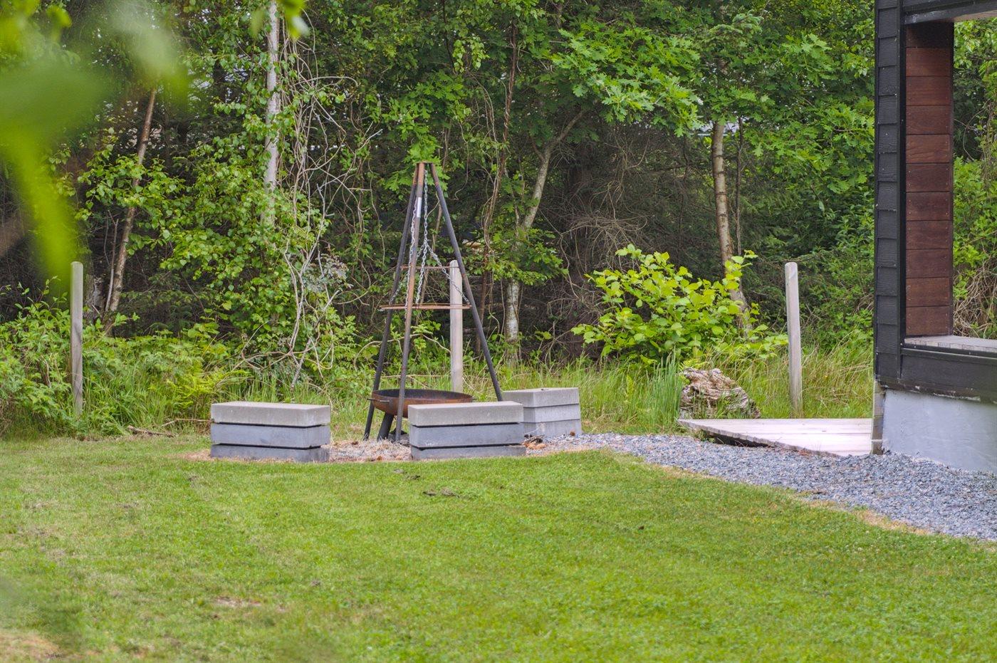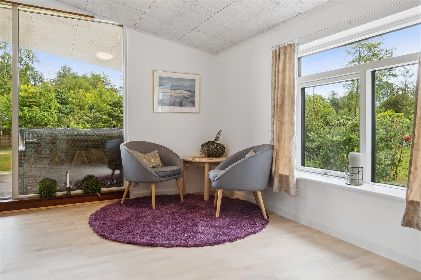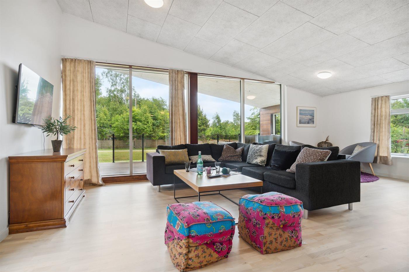 Sommerhuset fremstår lyst og moderne og med en rigtig god planløsning. Her er god plads til f.eks. to familier, som ønsker at holder ferie sammen i disse dejlige omgivelser. Her findes tilmed nogle fantastiske terrassearealer, som også er delvist overdækket – der er to store terrasser på begge sider af sommerhuset, så der er altid mulighed for at nyde solen og roen. På den ene terrasse findes et vildmarksbad til 4 personer, hvori man kan sidde helt ugeneret.