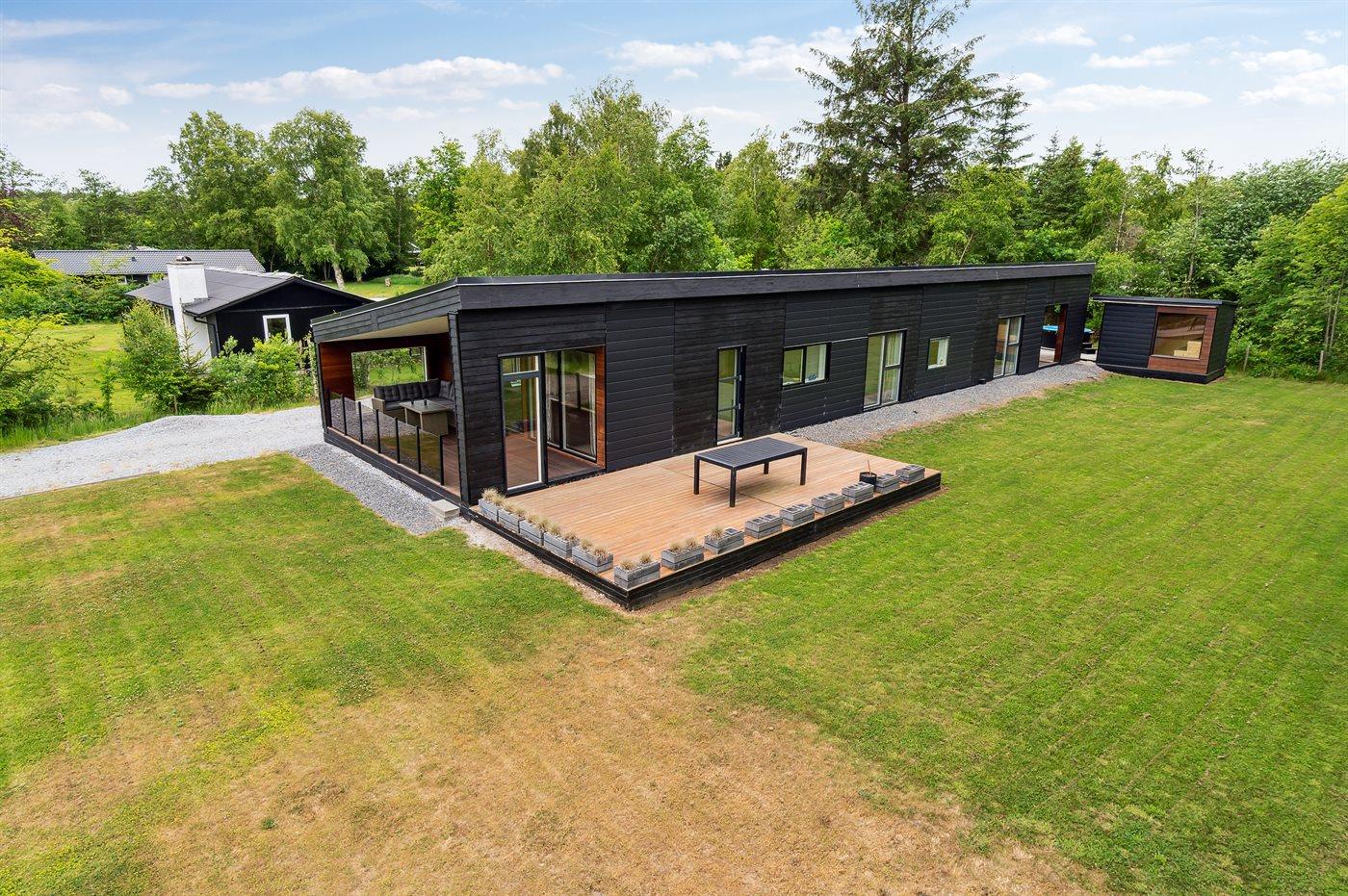 Stort sommerhus i rolige omgivelser tæt på Kattegats kyst og Hals med vildmarksbad og store terrasser.