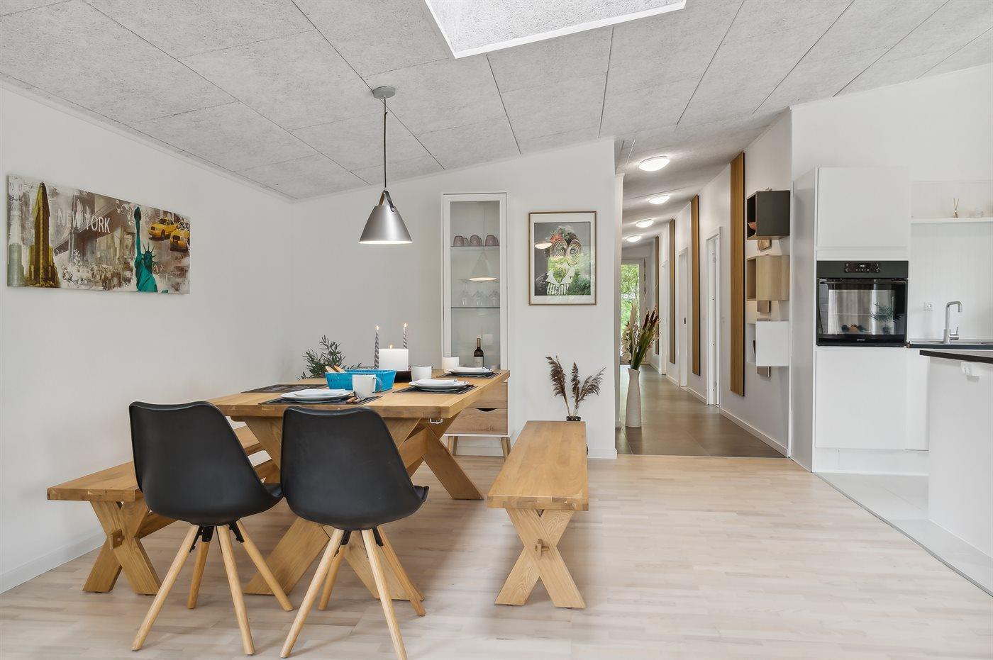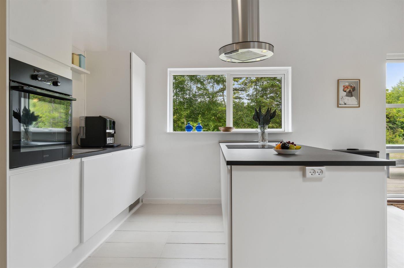Køkkenet er udstyret med 1 køleskab. Der er 4 induktionskogeplader, varmluftovn, mikrobølgeovn samt opvaskemaskine.