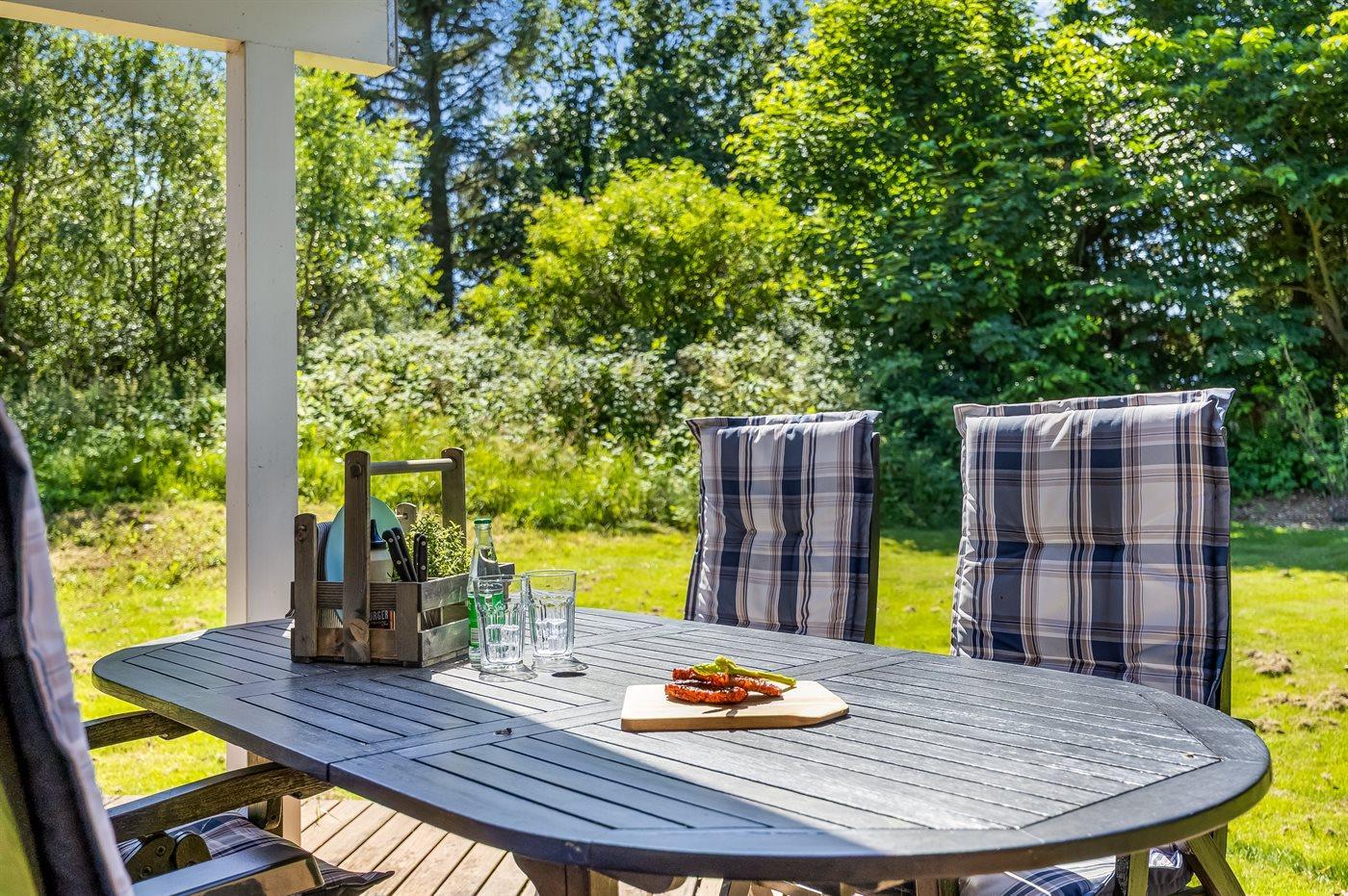 Ferieboligen er beliggende på en 1200 m² stor naturgrund. Der er 1100 m til havet. Nærmeste forretning er beliggende i en afstand af 2000 m. Til ferieboligen hører 25 m² terrasseareal. Desuden er der 10 m² overdækket terrasse. Gynge. Sandkasse. Grill til rådighed. Parkering ved ferieboligen.