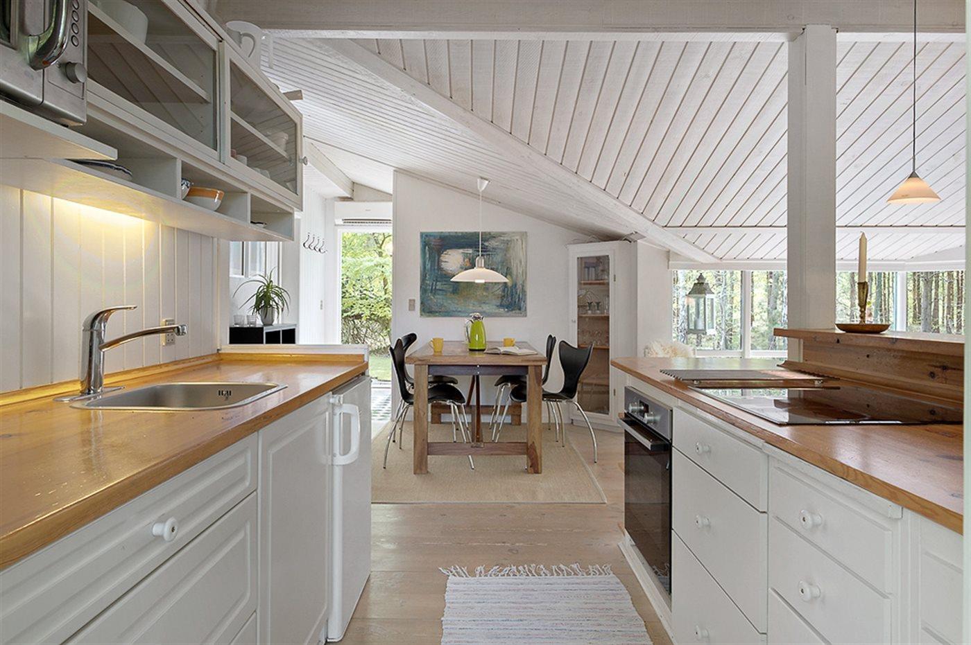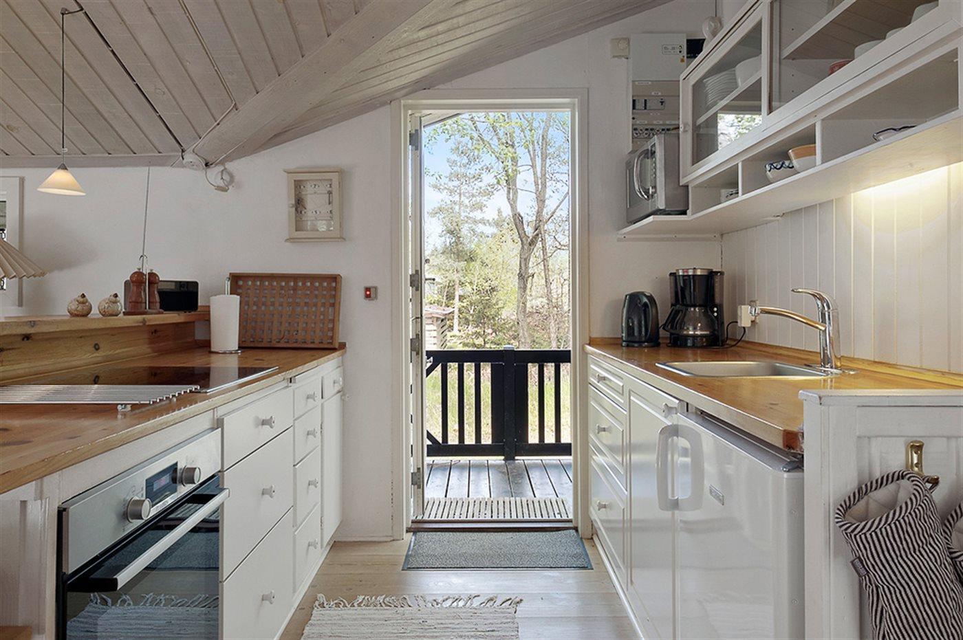 Køkkenet er udstyret med 1 køleskab. Der er 4 keramiske kogeplader, varmluftovn, mikrobølgeovn.