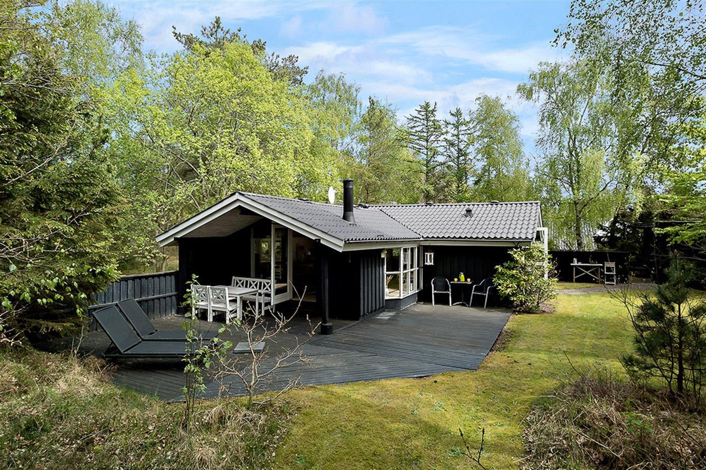 Hyggeligt sommerhus i træ nær Bisnap Strand med indhegnet have og delvist overdækket terrasse.