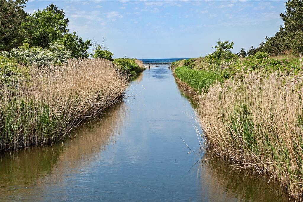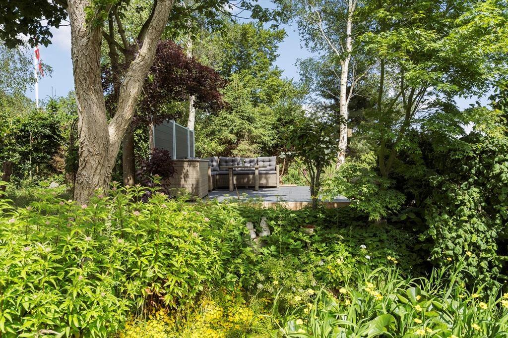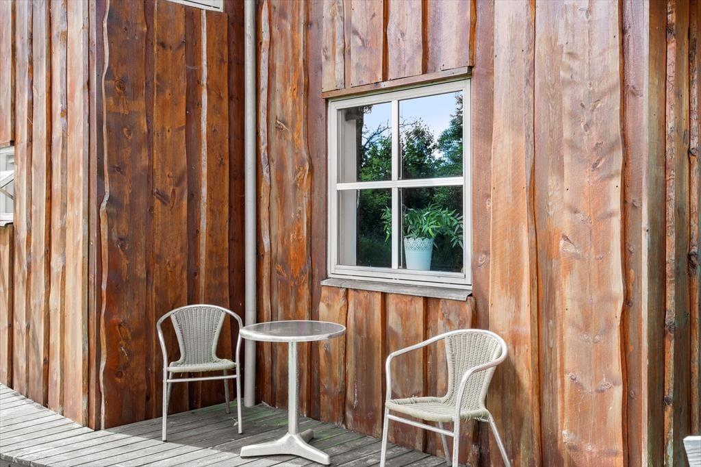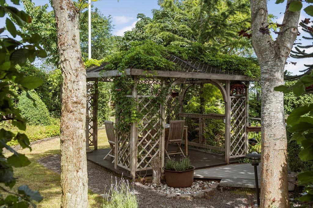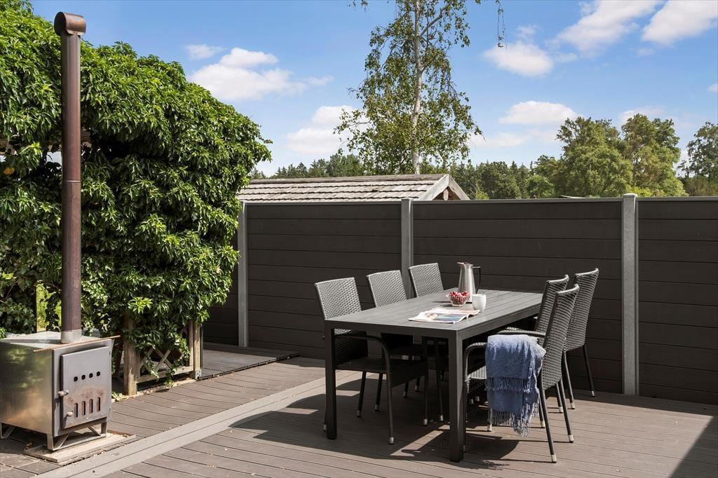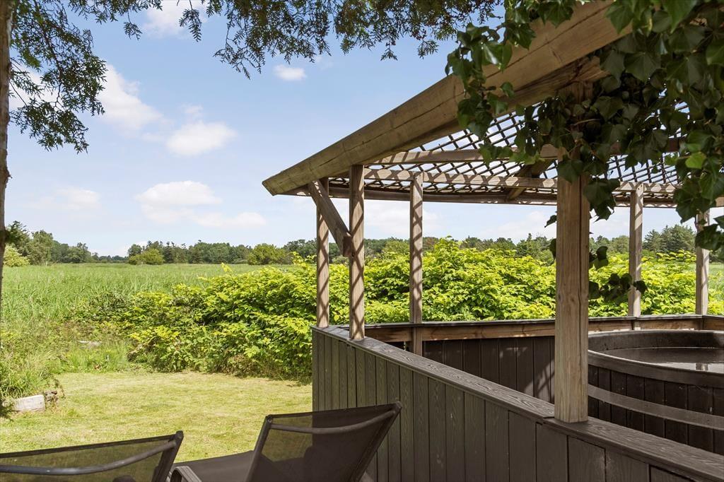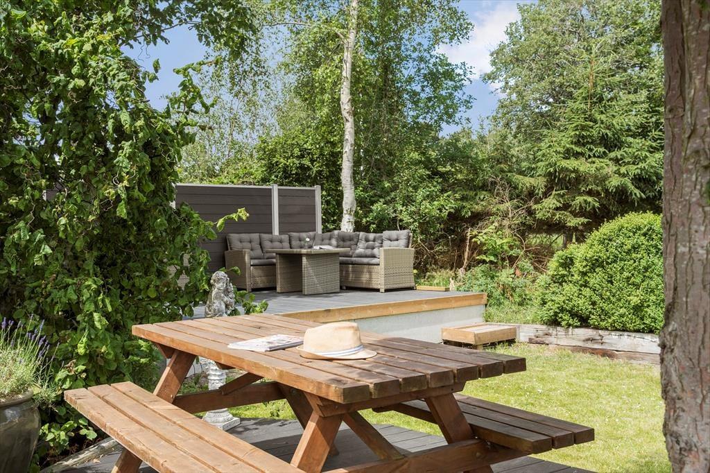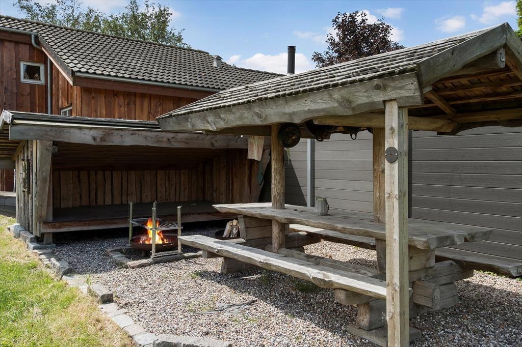Huset har en 2300 m2 grund med en idyllisk have med en å og fiskedam, samt flere terrasser og pavilloner, så man altid kan finde sol eller læ. Ved feriehuset er der vildmarksbad, shelter, bålplads, havemøbler, liggestole, parasol og grill.
