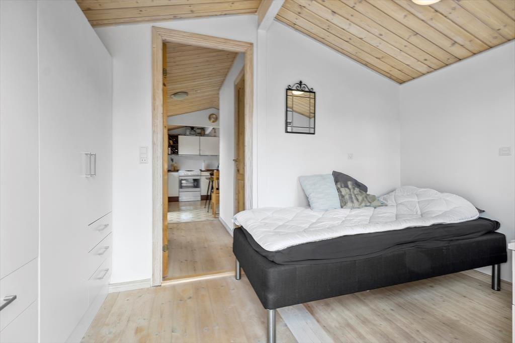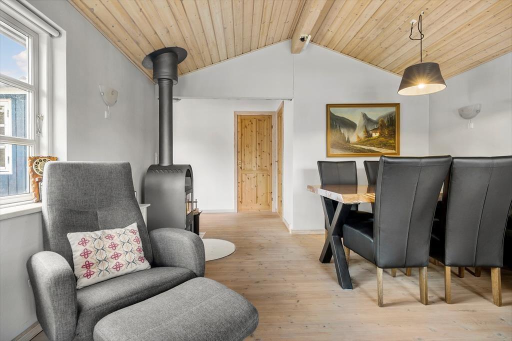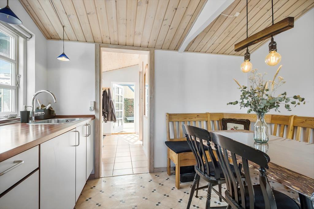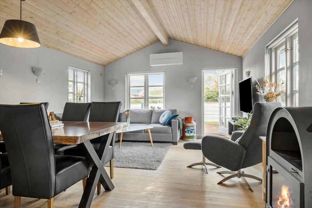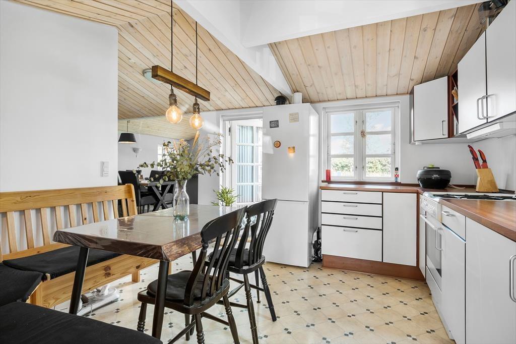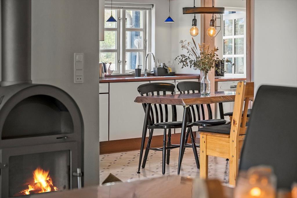 Velkommen indenfor: Det lyse hyggelige køkken har fin spiseplads, og opholdsstuen fungerer som husets naturlige samlingspunkt, hvor du kan nyde et godt måltid ved spisebordet eller slappe helt af i den komfortable opholdsstue. Huset har to soveværelser samt et rummeligt badeværelse med bruser samt vaskemaskine. Tænd gerne op i brændeovnen på de køligere dage, og lad roen sænke sig.