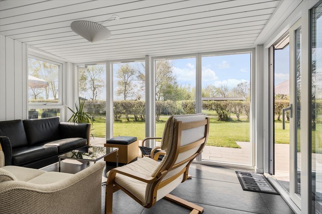 Velkommen indenfor: Træd ind i gangen, videre til det lyse køkken med god spiseplads, hvor der også er direkte udgang til en af terrasserne. Videre til den rummelige opholds- og spisestue, hvor du kan nyde den hyggelige atmosfære med fin udkig til den store have. Der er desuden en dejlig udestue i forbindelse med stuen med flere komfortable siddepladser. Huset rummer to soveværelser begge med to sovepladser samt et praktisk badeværelse med toilet, bruser og håndvask.