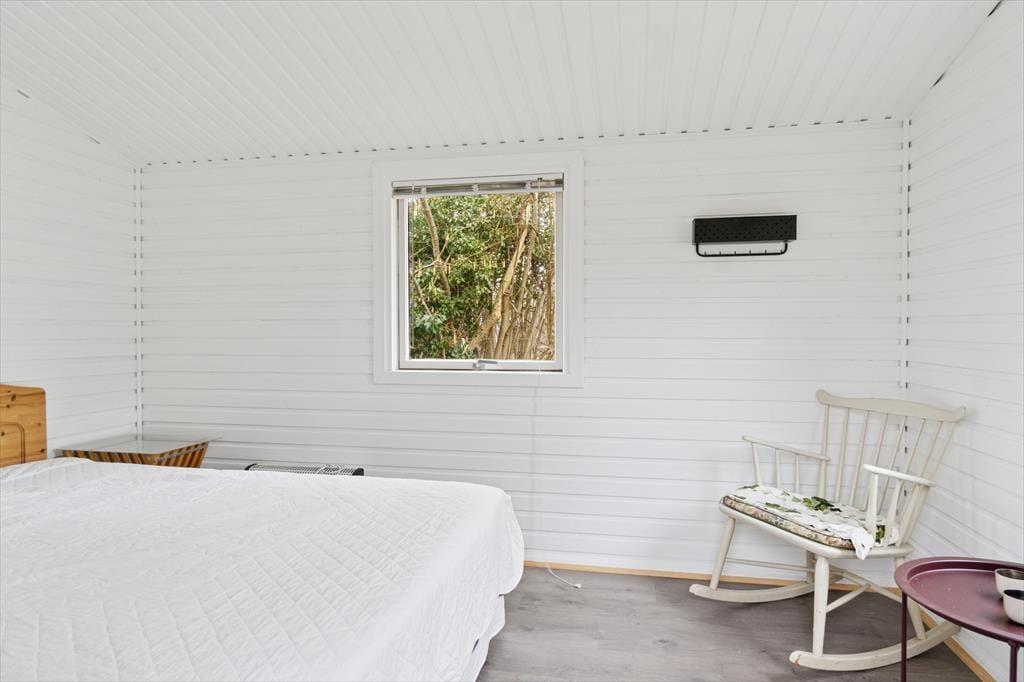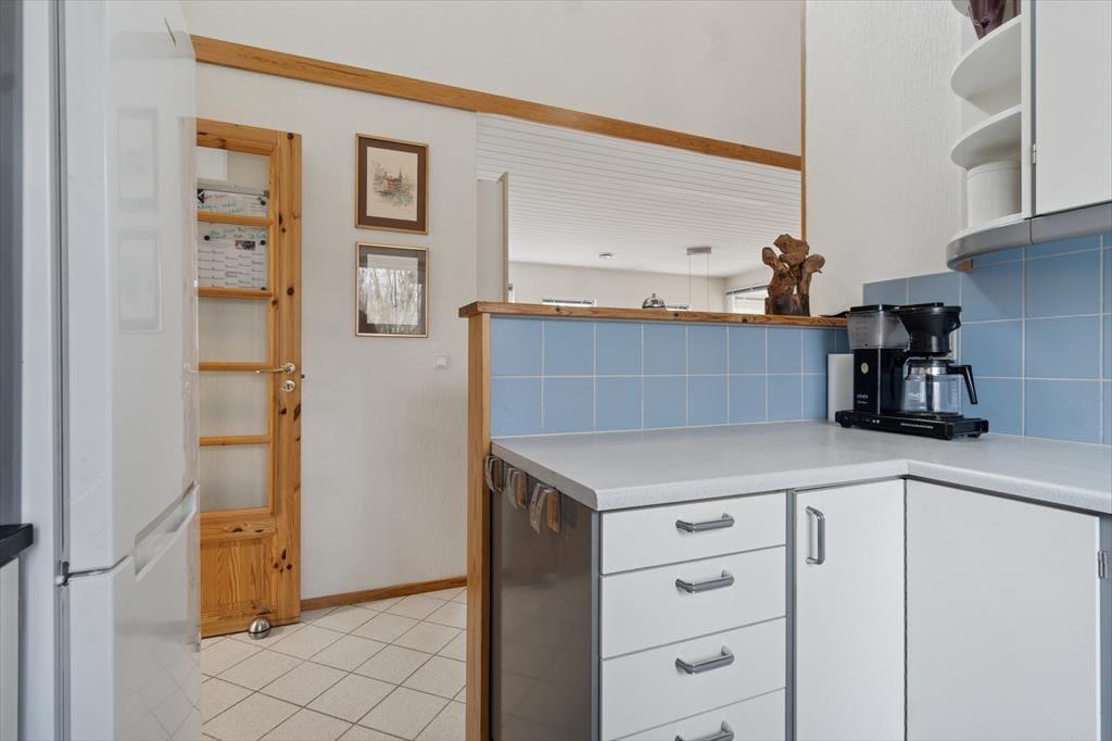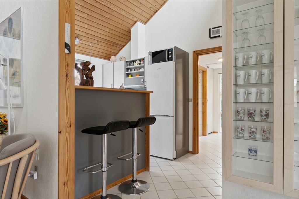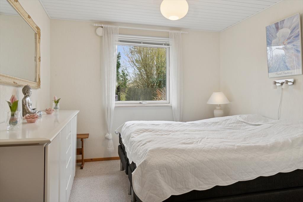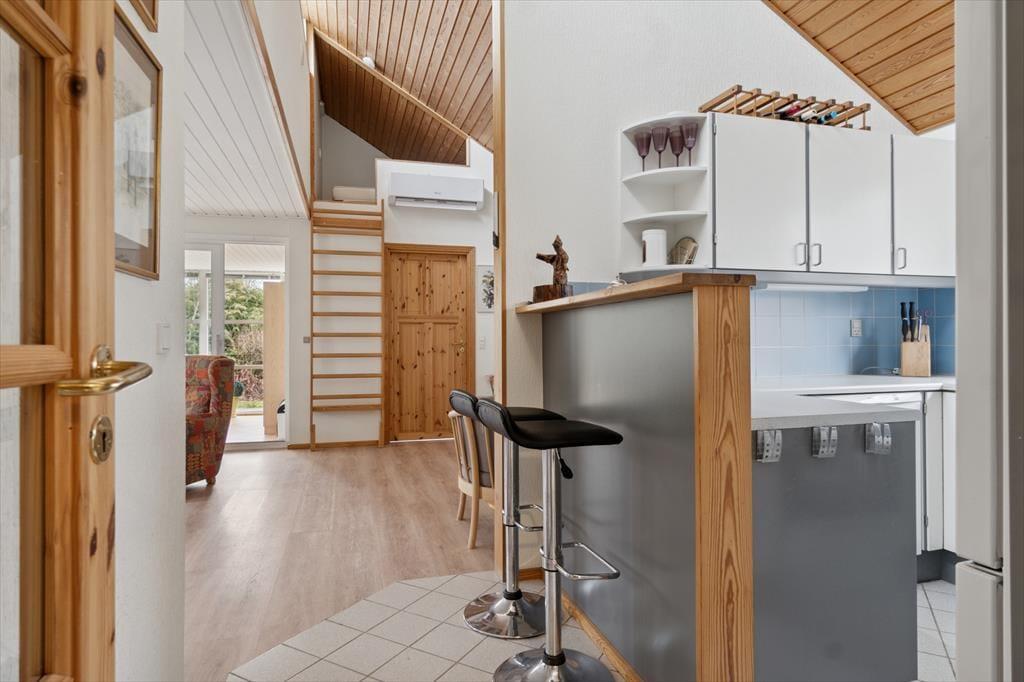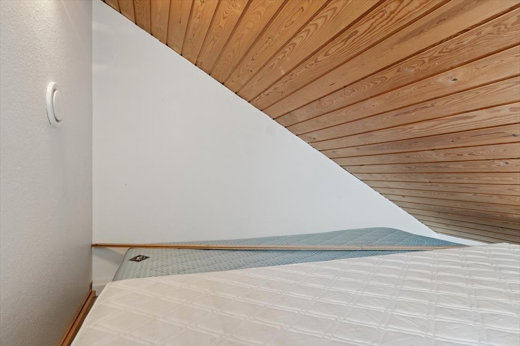 Velkommen indenfor: Huset har en komfortabel indretning med indbydende lysindfald takket være vinduerne i det forskudte tag og udestuen. Loft til kip, i halvdelen af huset, som sammen med den lyse indretning sikrer en meget hyggelig atmosfære. Den rummelige stue og spisestue er perfekt til afslapning, og den ligger i åben forbindelse med køkkenet. Praktisk badeværelse med vaskemaskine og husets sovepladser er fordelt på to gode værelser samt en hems. Tænd op i brændeovnen på de køligere dage og lad roen og feriestemningen sænke sig.
