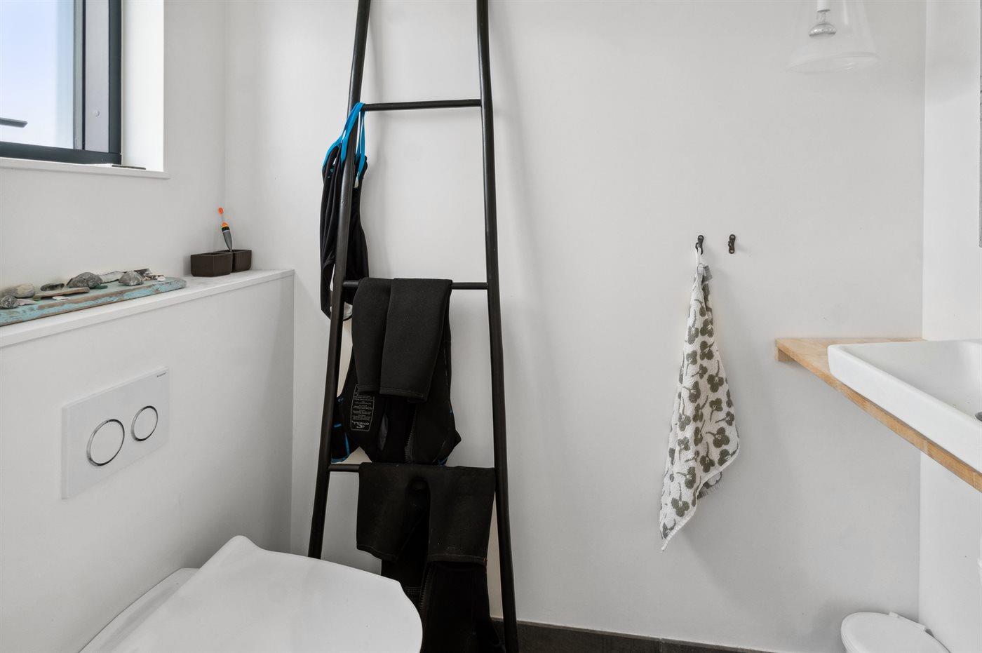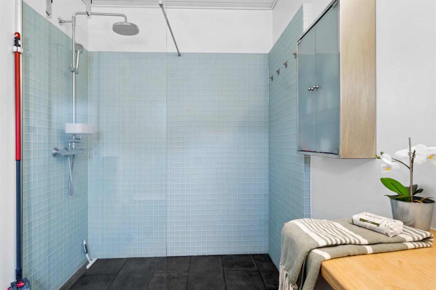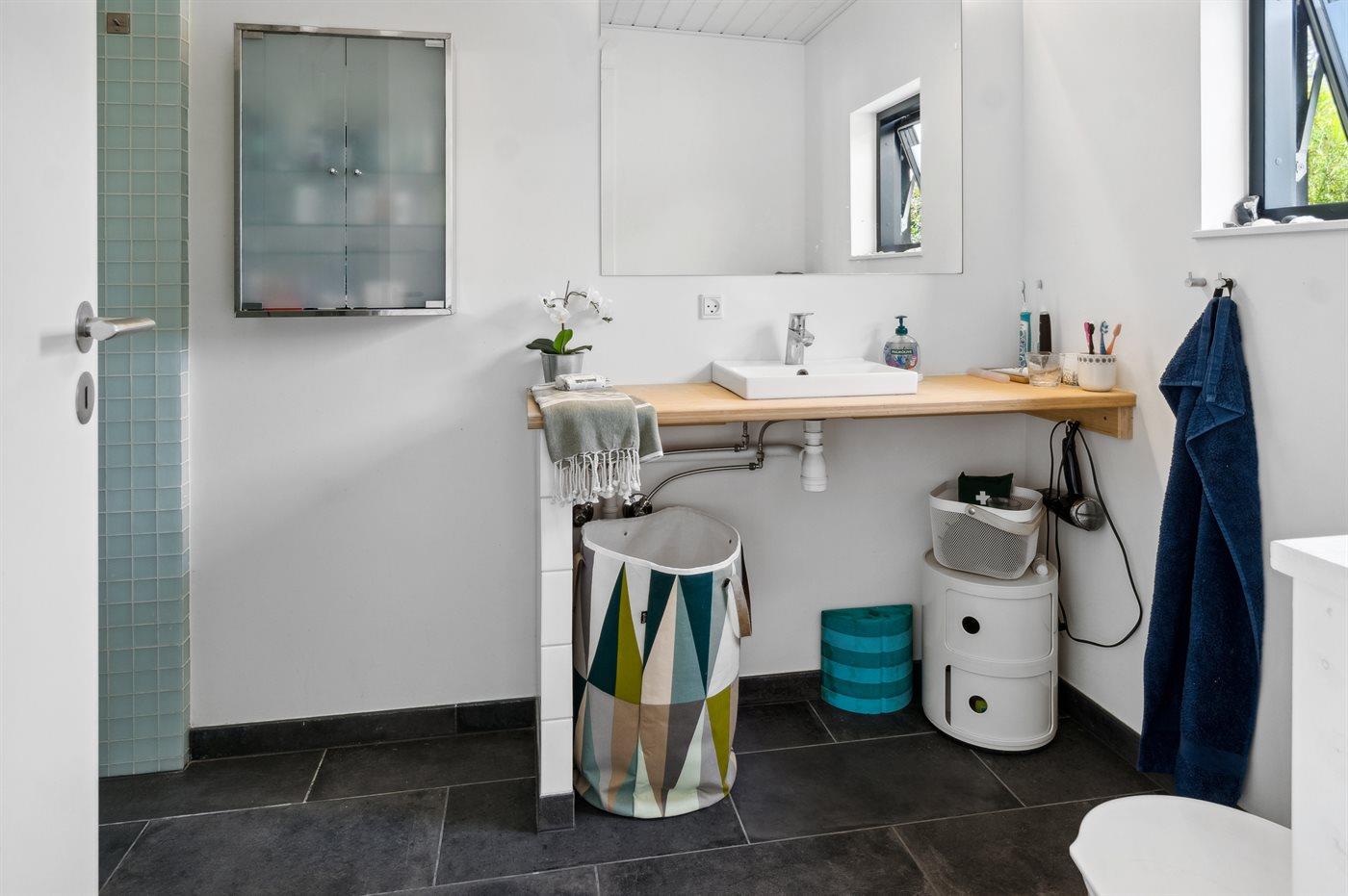Der er 1 badeværelse med bruseniche og 2 toiletter, heraf 1 gæstetoilet. Der er gulvvarme på 1 badeværelse. Der er gulvvarme på gæstetoilettet.