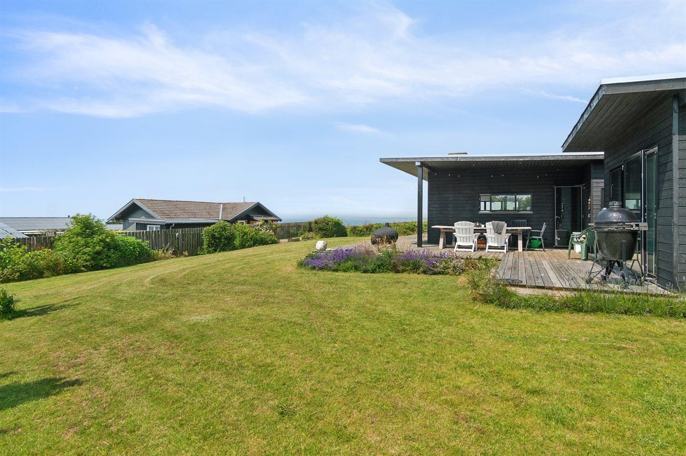 Ferieboligen er beliggende på en 1182 m² stor havegrund. Der er 100 m til havet. Nærmeste forretning er beliggende i en afstand af 5000 m. Til ferieboligen hører 70 m² terrasseareal. Desuden er der 19 m² overdækket terrasse. Fodboldmål. Bålsted. Udendørs sauna. Udendørs bruser. Grill til rådighed. Der er installeret stik til opladning af elbil. Med 11 kW ladeeffekt. Parkering ved ferieboligen.