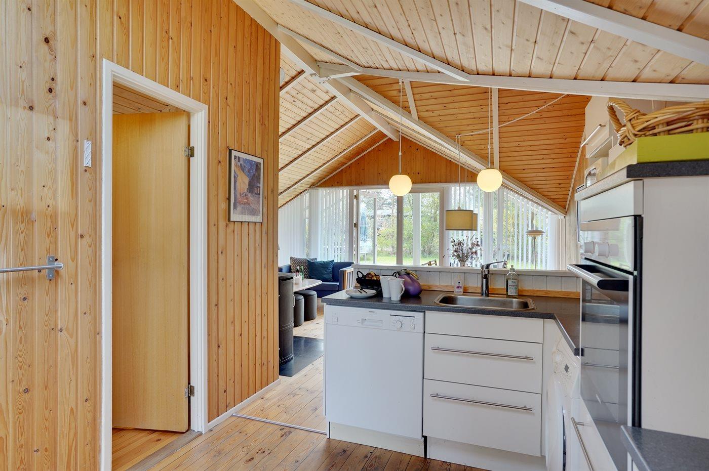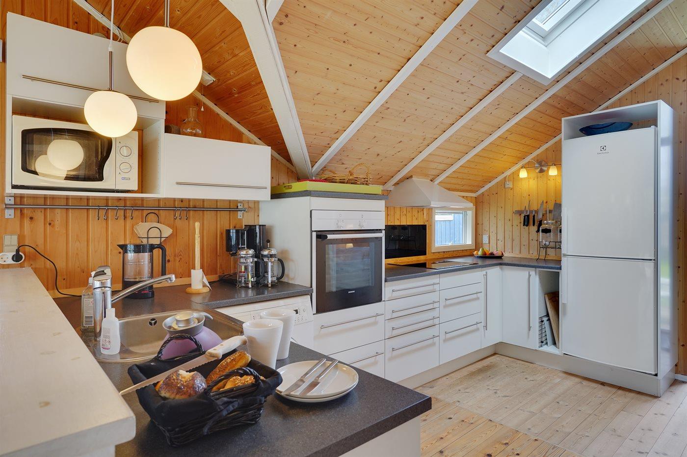 Køkkenet er udstyret med 1 køleskab. Der er 4 keramiske kogeplader, varmluftovn, mikrobølgeovn samt opvaskemaskine.