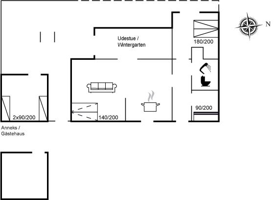 Der er i alt 2 soveværelser. Sovepladserne fordeler sig på: 2 sovepladser i dobbeltseng. 2 sovepladser i enkeltsenge. 2 sovepladser i køjeseng. 2 sovepladser i sovesofa (dobbelt). 2 af disse sovepladser befinder sig i anneks og 2 andre af disse sovepladser befinder sig i stuen. Derudover er der 1 stk. barneseng.
