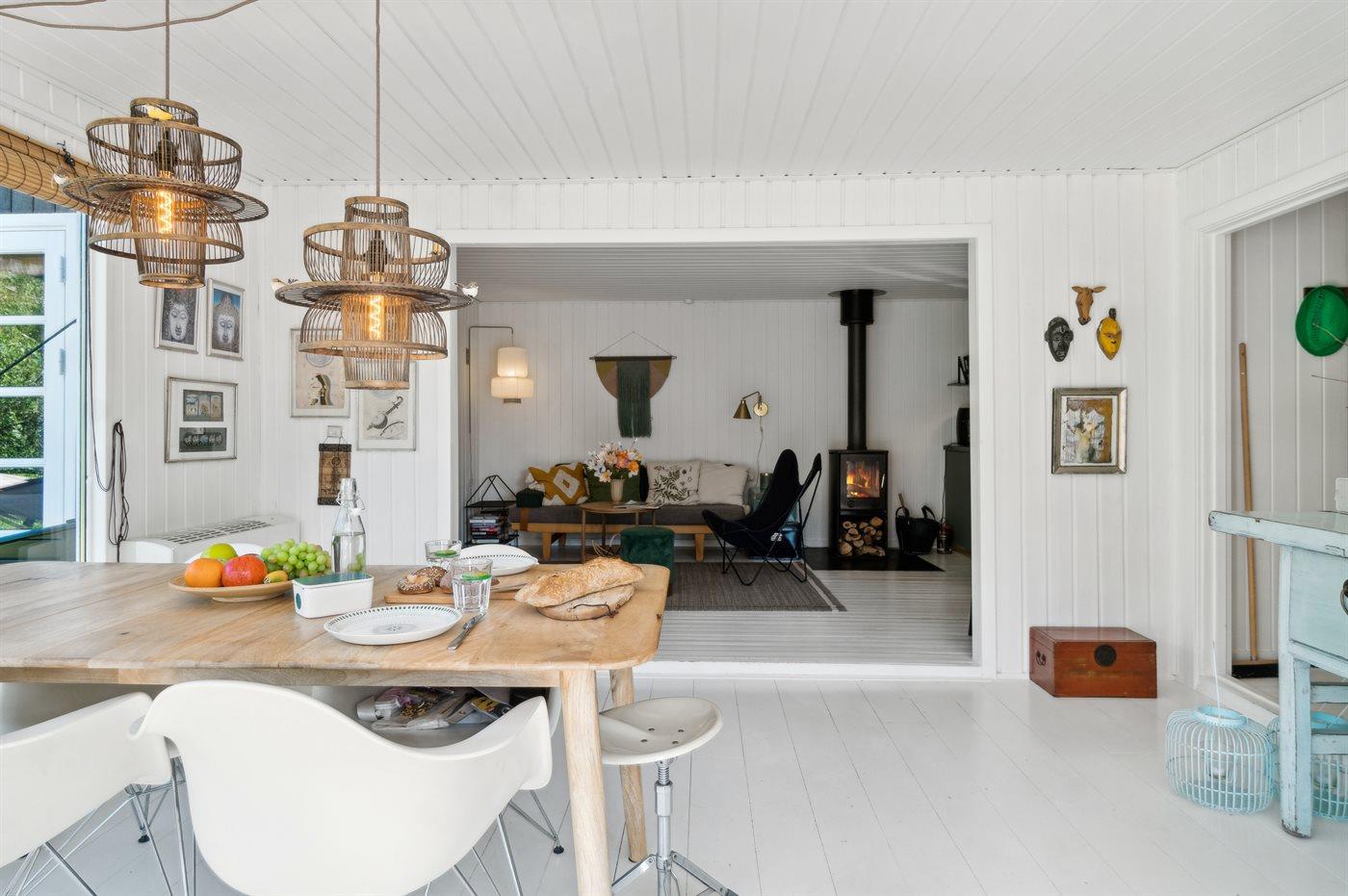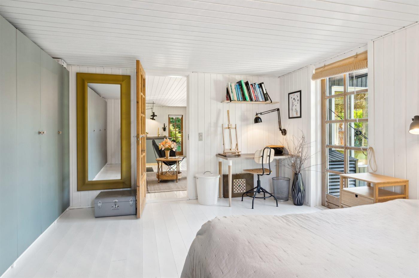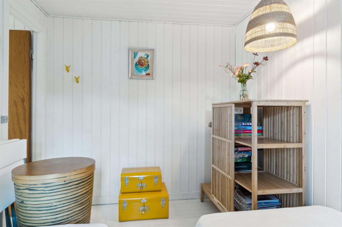 Der er 2 soveværelser med hver 2 sovepladser og fra det ene soveværelser er der udgang til et lille terrasseområde. I annekset som ligger cirka 8 meter fra selve sommerhuset er der yderligere 2 sovepladser. I det moderne badeværelse er der bruseniche, gulvvarme og vaskemaskine. Huset opvarmes energivenligt med luft-til-luft varmepumpe og til de hyggelige stunder er der brændeovn.