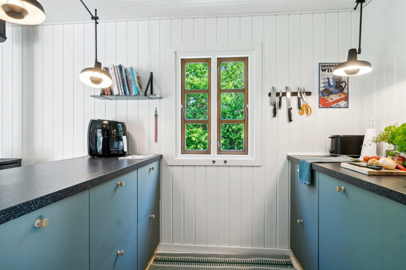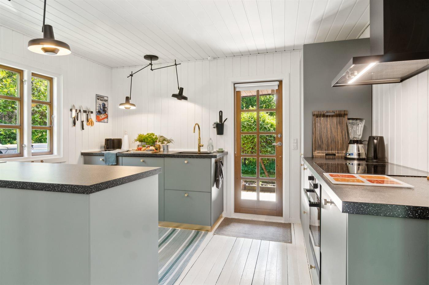 Køkkenet er udstyret med 1 køleskab. Der er 4 induktionskogeplader, varmluftovn, mikrobølgeovn samt opvaskemaskine.