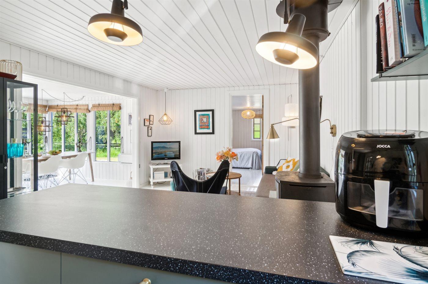 Dette hyggelige og sommerligt indrettede feriehus indbyder til ro og afslapning inde og ude. Huset er beliggende i et fredeligt sommerhusområde i landlige og naturskønne omgivelser og med kun 400 meter til en dejlig og børnevenlig sandstrand. Huset er moderniseret i 2021 og hyggeligt indrettet med et moderne og funktionelt køkken som er i direkte forbindelse med stuen og spisepladsen og som danner rammen for hyggeligt samvær. Herfra er udgang til den store dejlige træterrasse med udebruser og bålsted og hvor en del er overdækket.