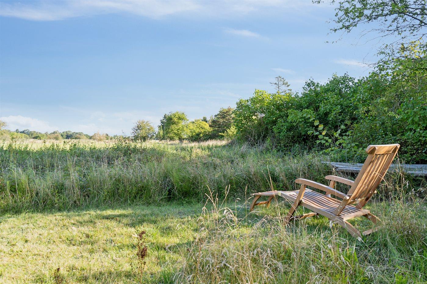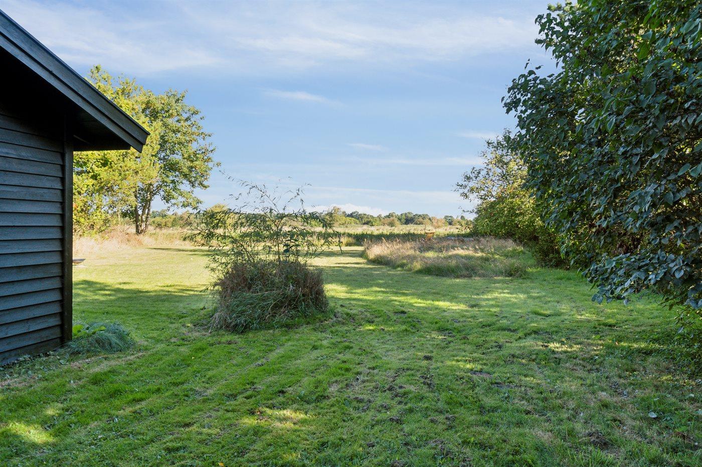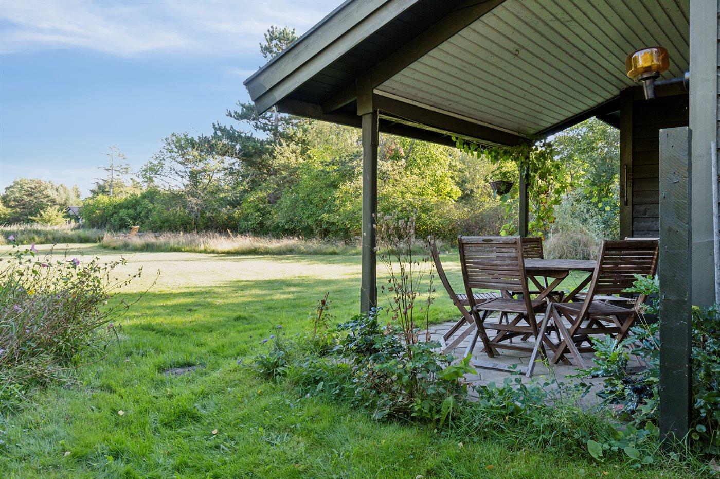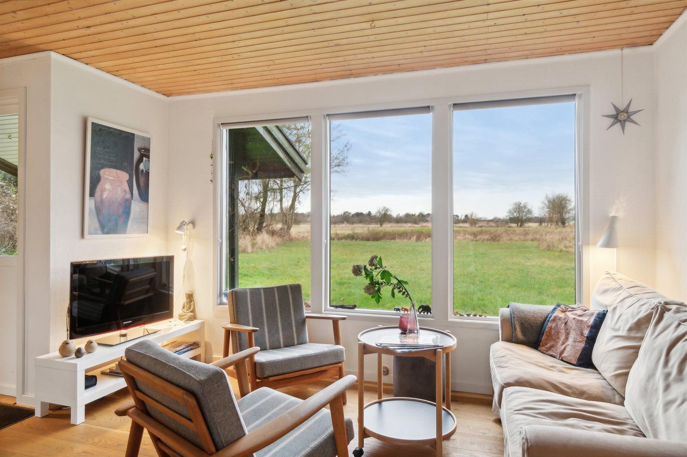 Stue, spiseplads og køkken er ud i et og herfra er udsigt over haven og engen og direkte udgang til den overdækkede terrasse. Mod syd er en hyggelig afskærmet terrasse med god mulighed for at nyde solen og finde læ og i den store have er der rig mulighed for leg og boldspil.
