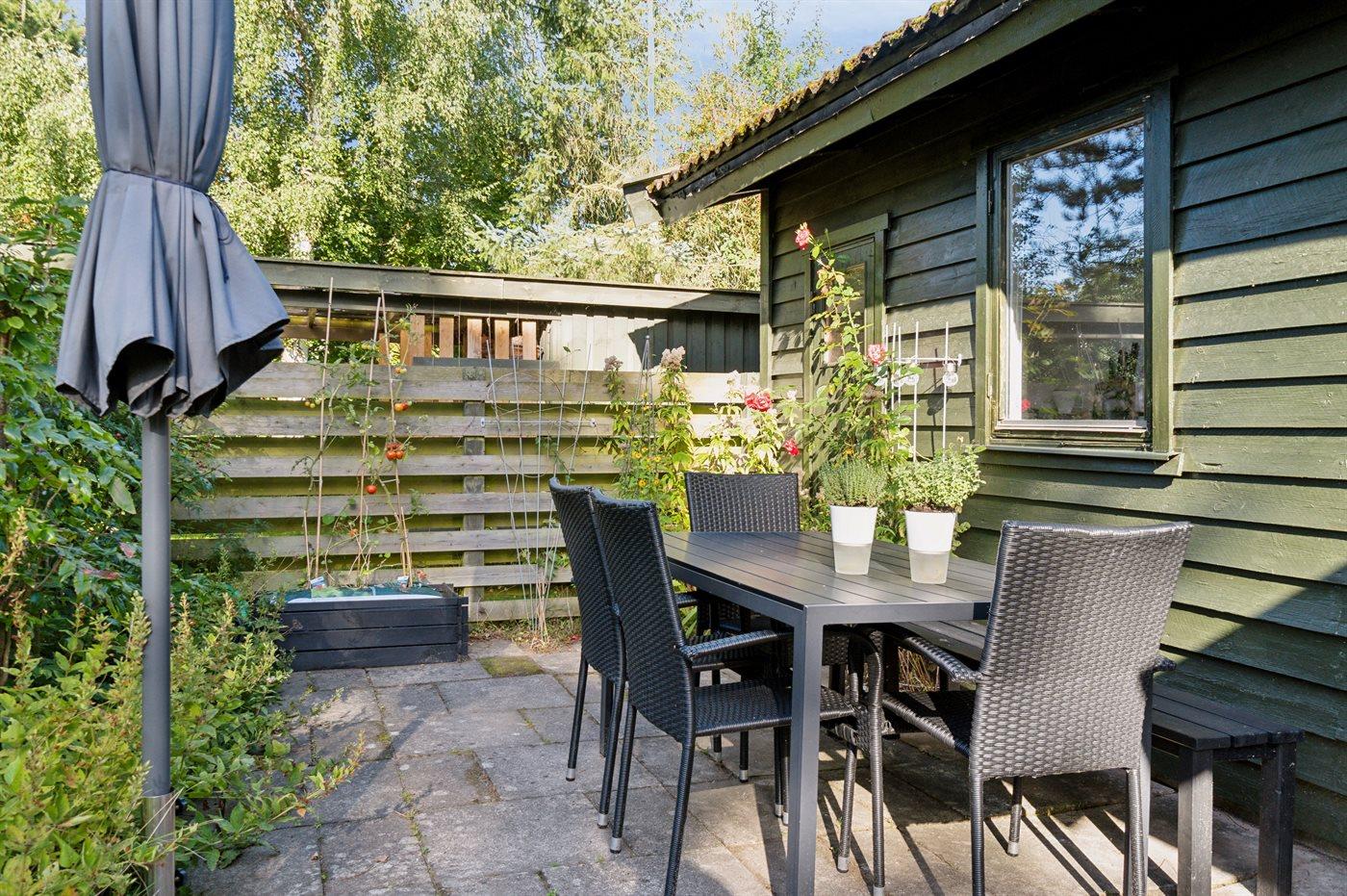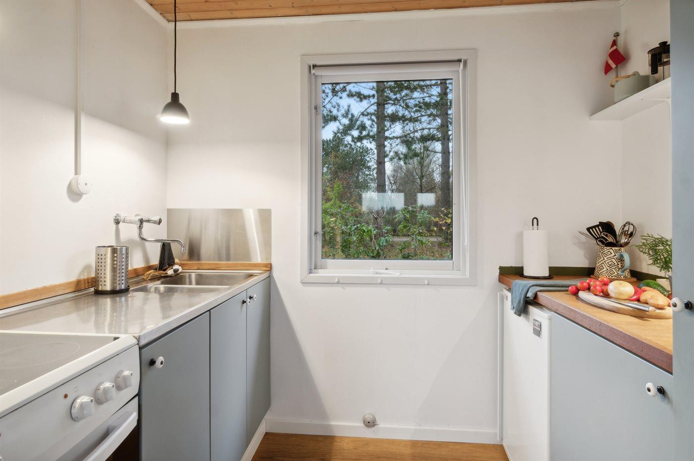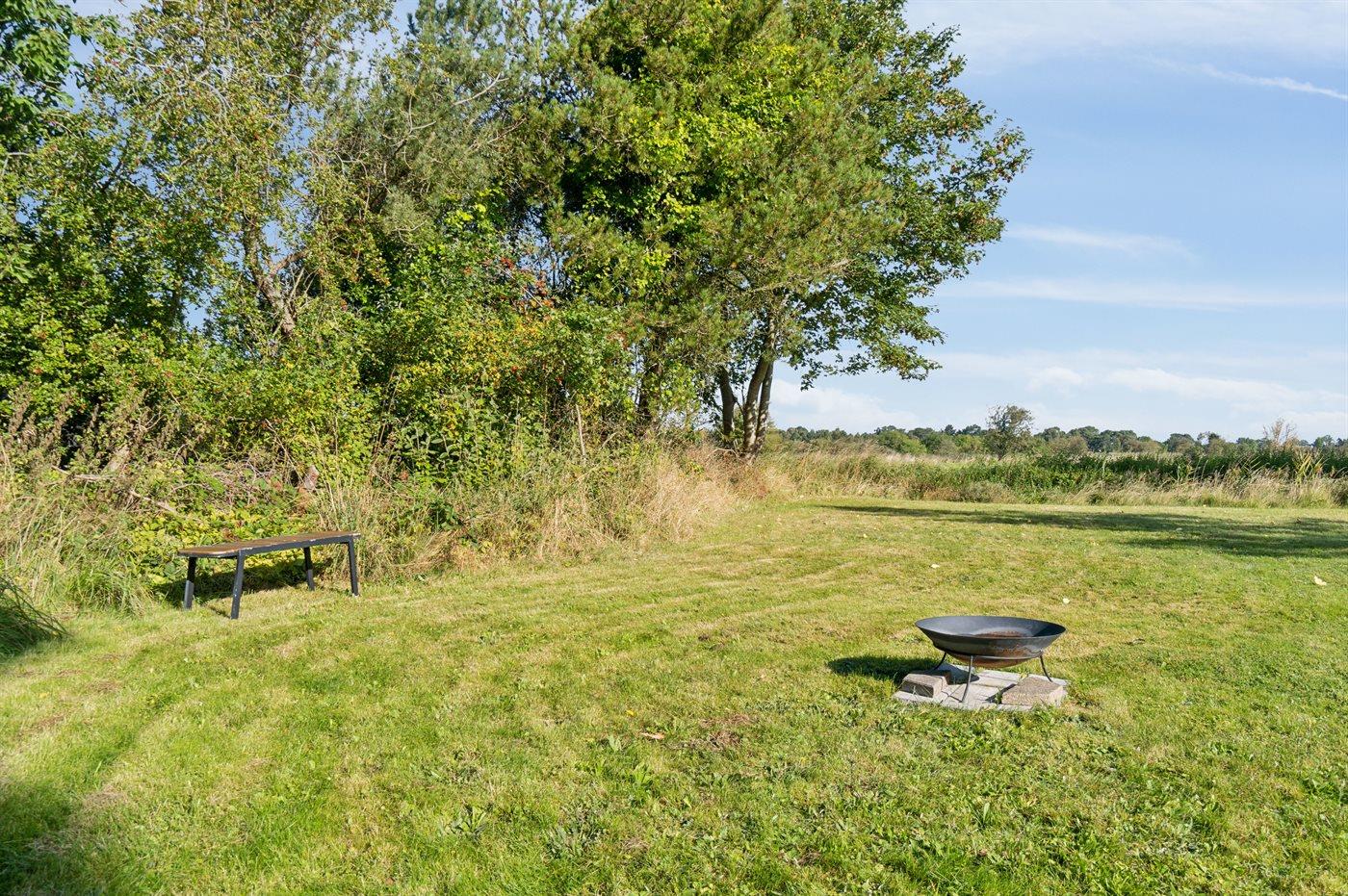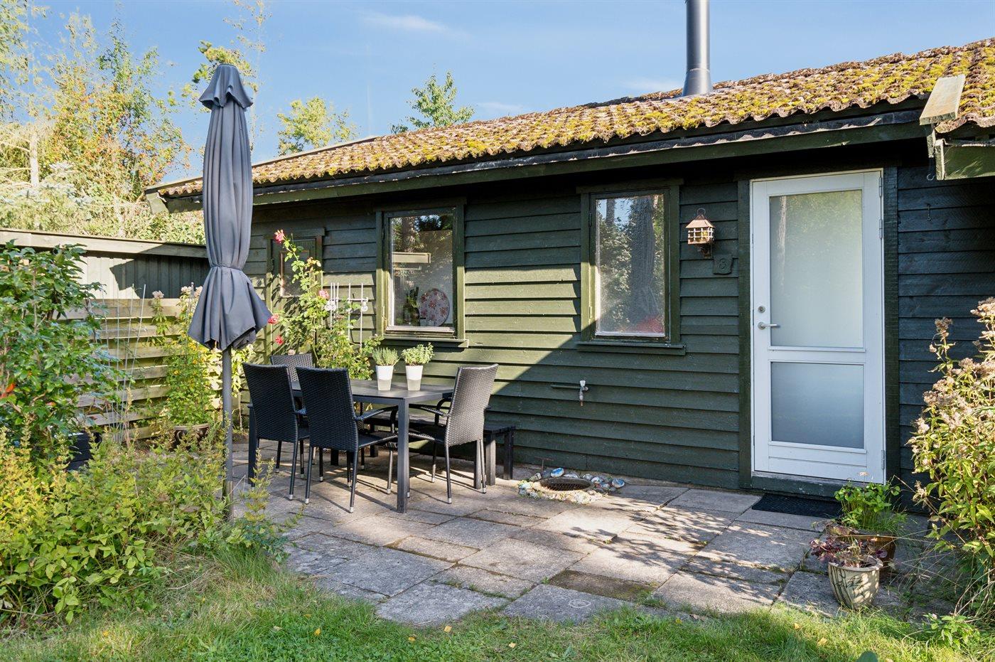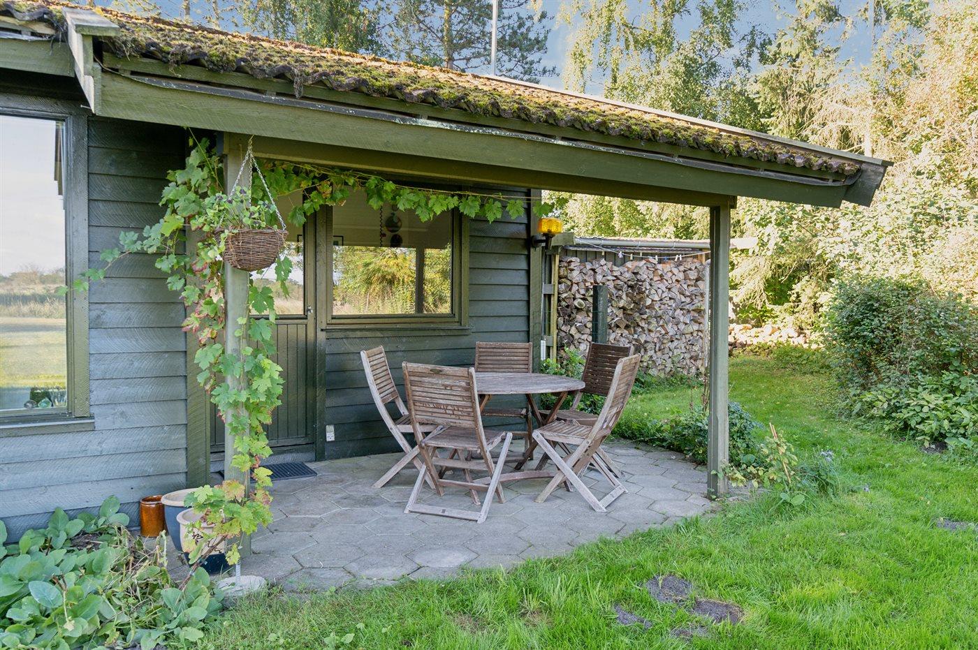 Stue, spiseplads og køkken er ud i et og herfra er udsigt over haven og engen og direkte udgang til den overdækkede terrasse. Mod syd er en hyggelig afskærmet terrasse med god mulighed for at nyde solen og finde læ og i den store have er der rig mulighed for leg og boldspil.