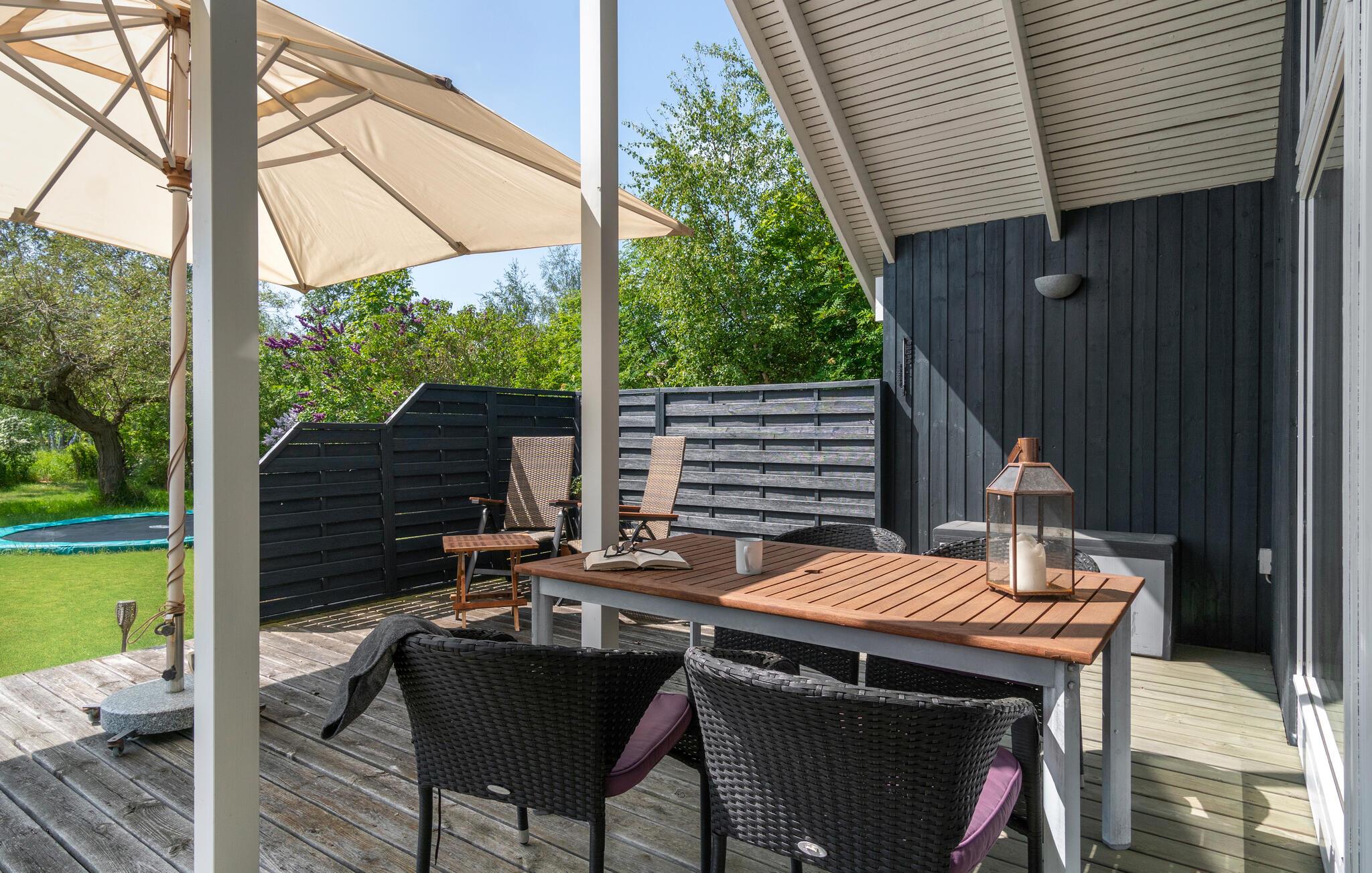Sæt jer med en kop kaffe og lav krydsogtværs og sudoku under parasollen, mens børnene hopper om kap på trampolinen eller leger gemmeleg i det lille stykke skov, som er på grunden.