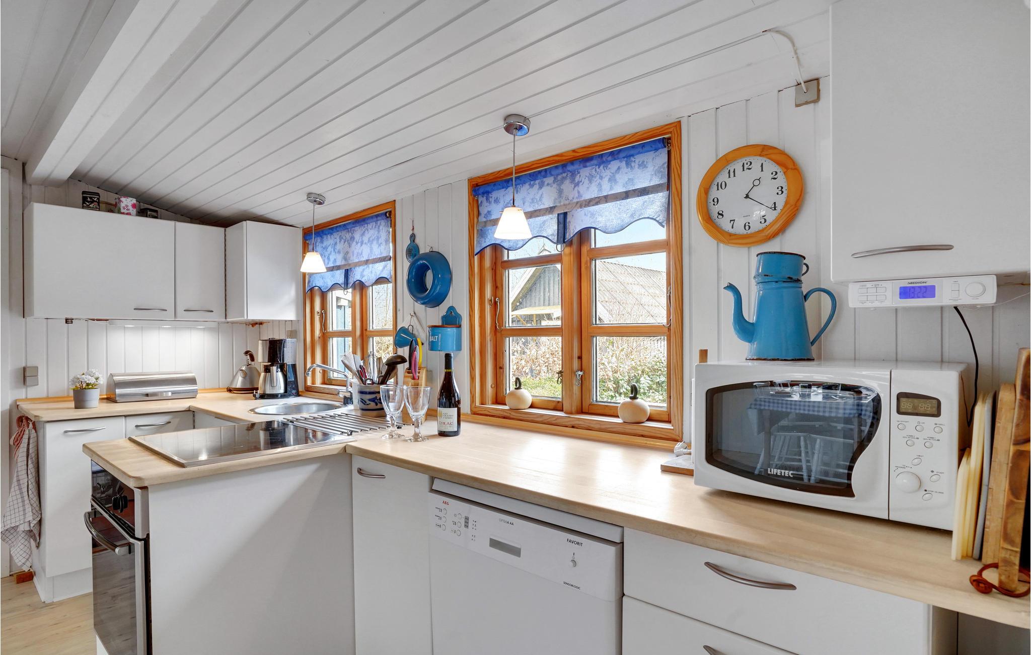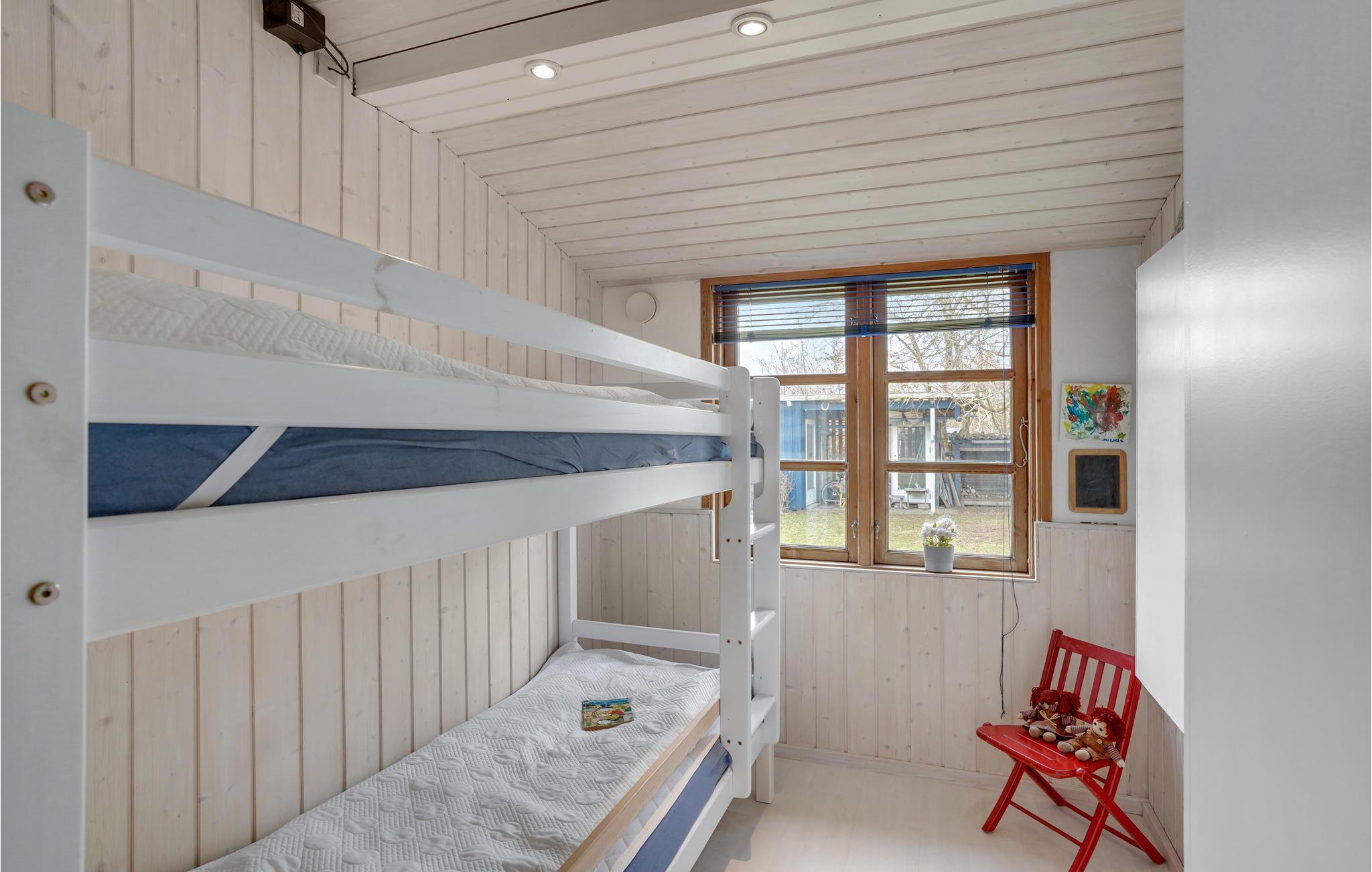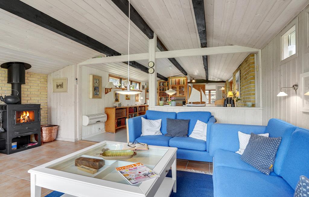 Dette feriehus har plads til op til 6 personer med 3 soveværelser. To af soveværelserne har dobbeltsenge, det tredje soveværelse har en køjeseng. Interiøret er hyggeligt og svarer til den klassiske skandinaviske sommerhusstil. I stuen kan I sætte jer godt til rette ved brændeovnen og nyde hyggen efter en lang dag.