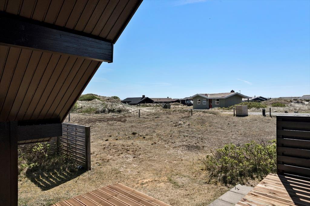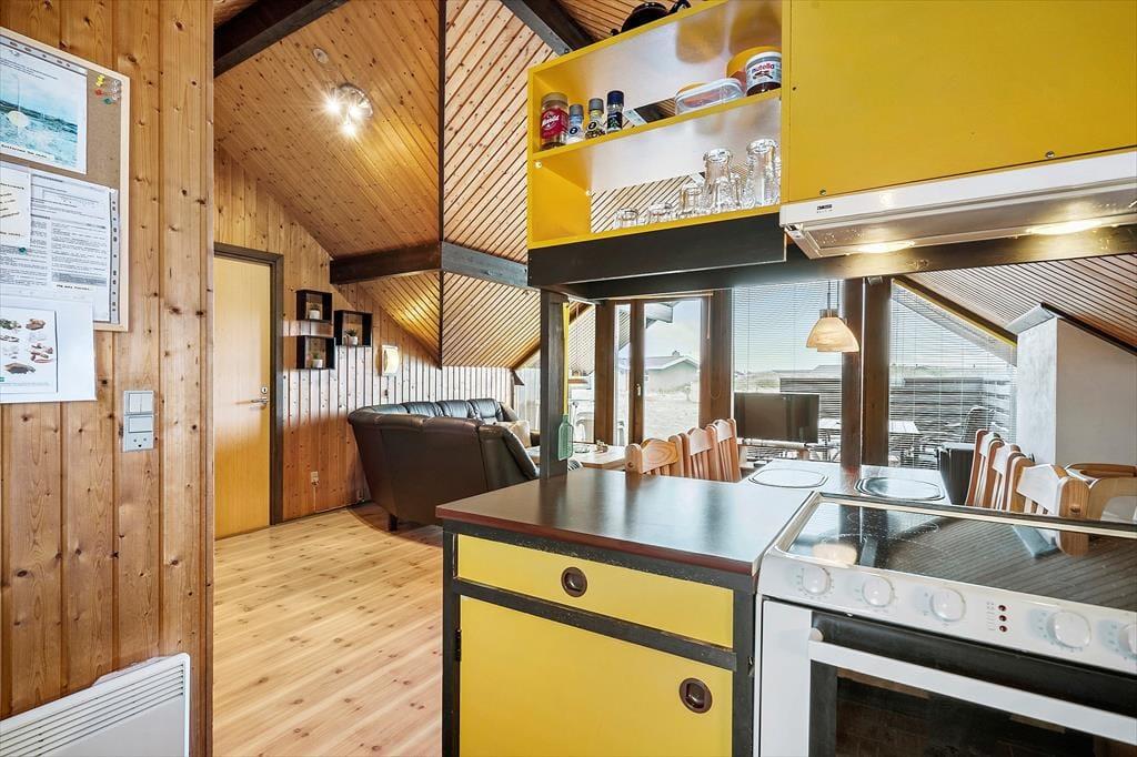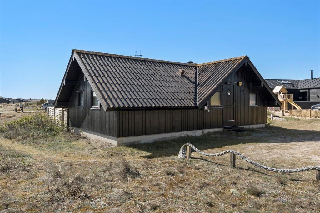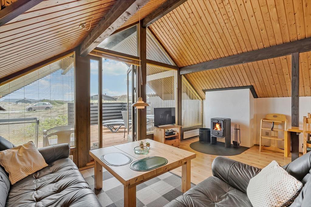 Sommerhuset er opført i 1976, og gennem årene er det blevet vedligeholdt med respekt for den originale stil og oprindelige indretning. Det kan for eksempel ses i stuen, der har loft til kip, umalede trælister på væggene og rustikke bjælkekonstruktioner – samt åben forbindelse til et rammekøkken, der har kombineret varmluftsovn og opvaskemaskine som del af de funktionelle boligløsninger. Når I sidder i stuens komfortable sofa, kan I se tv, nyde skæret fra brændeovnen og kigge ud på klitterne mod syd og vest. Ved entréen finder I husets badeværelse, og side om side ligger to gode soveværelser med i alt fire sengepladser. I huset er der for øvrigt babyseng, babystol og puslebord til rådighed, så de alleryngste feriegæster er der også taget hensyn til.