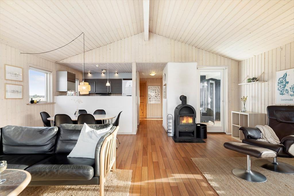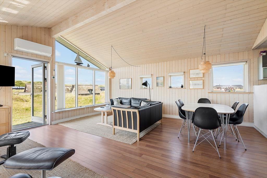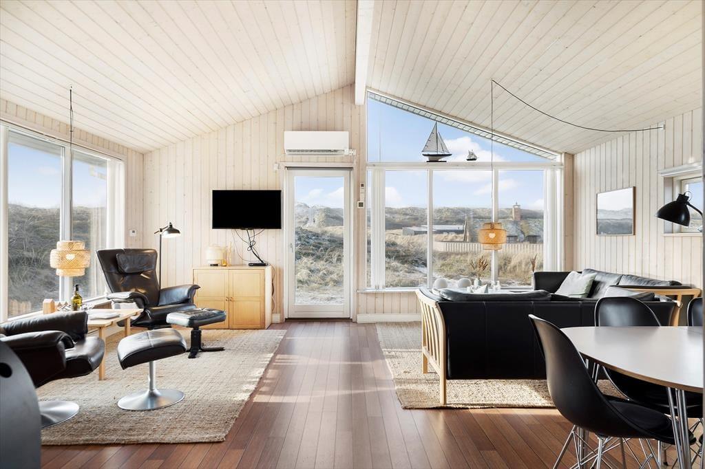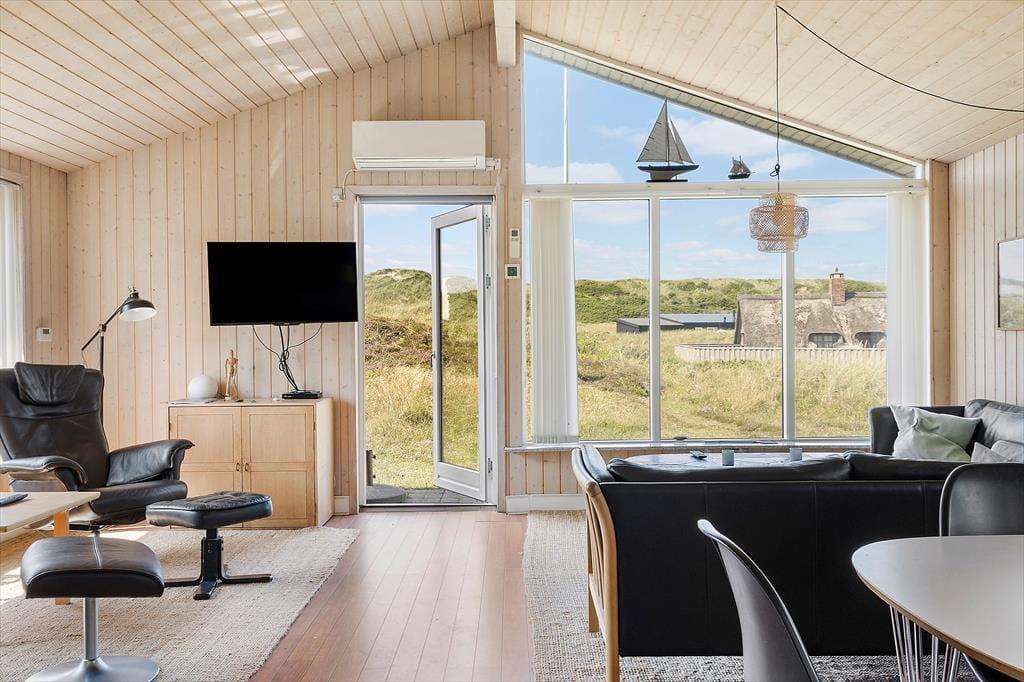 De smukke naturomgivelser indbyder til, at I tager dagene med ro og bare nyder ferien på tilbagelænet vis. Sommerhusets indretning lægger bestemt også op til et komfortabelt driverliv, for det er skønt at slappe af i husets to opholdsrum og på de tre soveværelser – ja, selv på det ene af de to badeværelser er der sauna, så her kan I også koble af og få varme i hele kroppen. Et veludstyret køkken ligger i åben forbindelse med den ene stue, der har brændeovn, loft til kip og et stort vinduesparti vendt ud mod klitterne. Også den anden stue er udstyret med store vinduer, så sol og natur bliver inviteret lige indenfor.