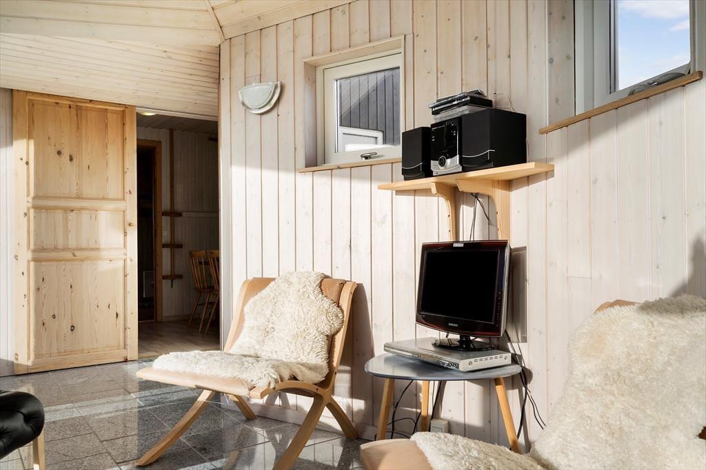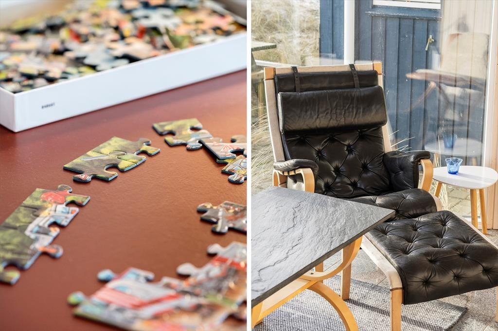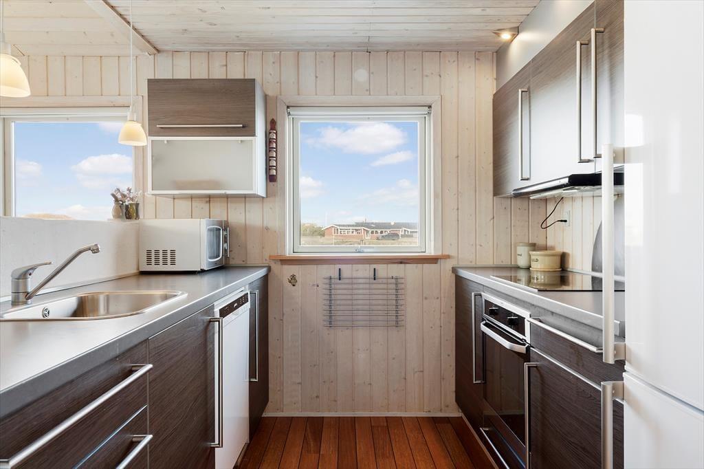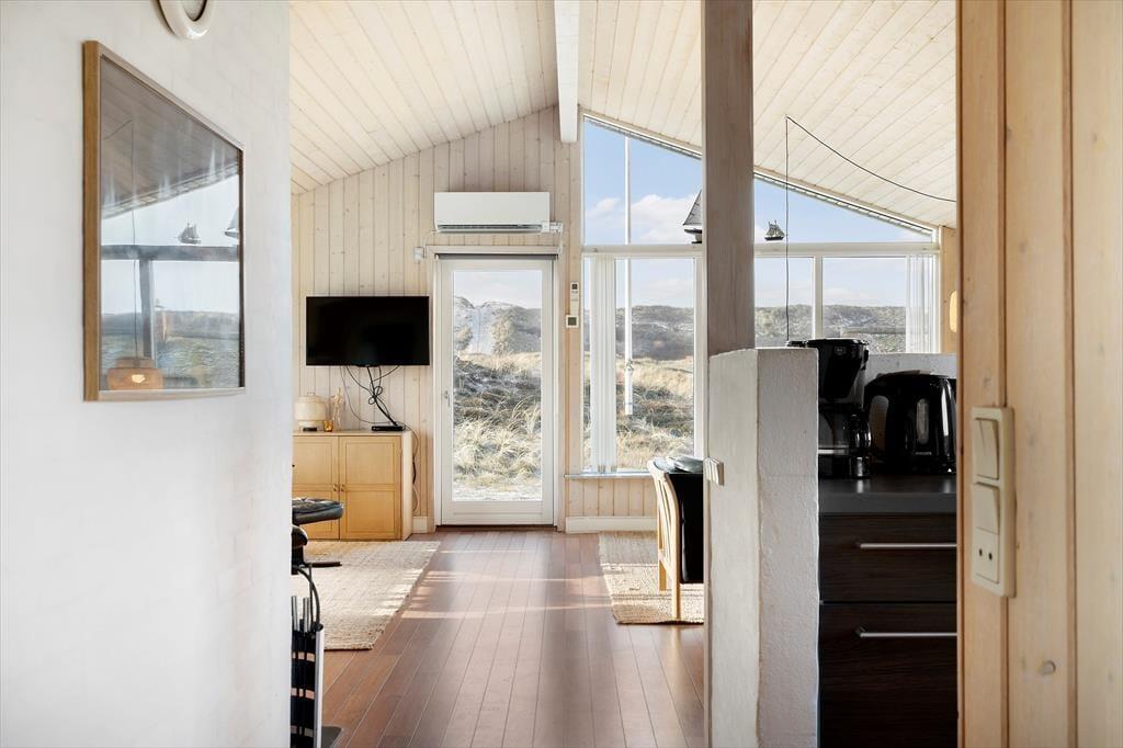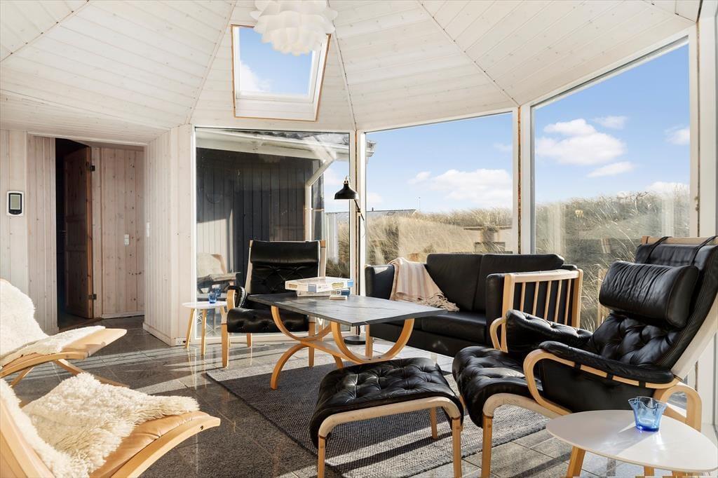 De smukke naturomgivelser indbyder til, at I tager dagene med ro og bare nyder ferien på tilbagelænet vis. Sommerhusets indretning lægger bestemt også op til et komfortabelt driverliv, for det er skønt at slappe af i husets to opholdsrum og på de tre soveværelser – ja, selv på det ene af de to badeværelser er der sauna, så her kan I også koble af og få varme i hele kroppen. Et veludstyret køkken ligger i åben forbindelse med den ene stue, der har brændeovn, loft til kip og et stort vinduesparti vendt ud mod klitterne. Også den anden stue er udstyret med store vinduer, så sol og natur bliver inviteret lige indenfor.