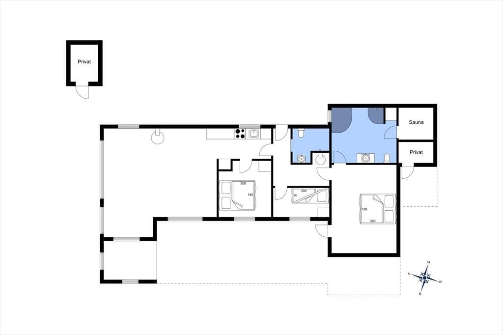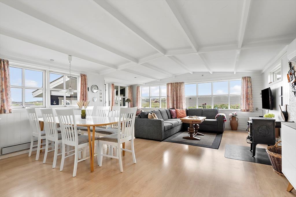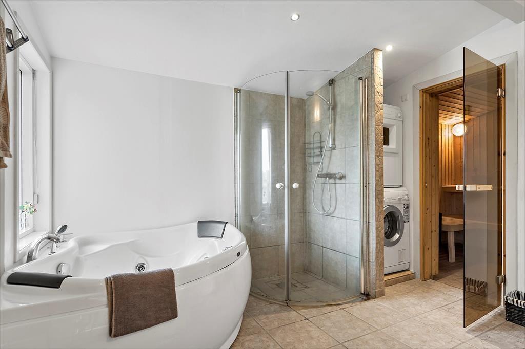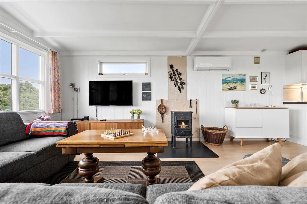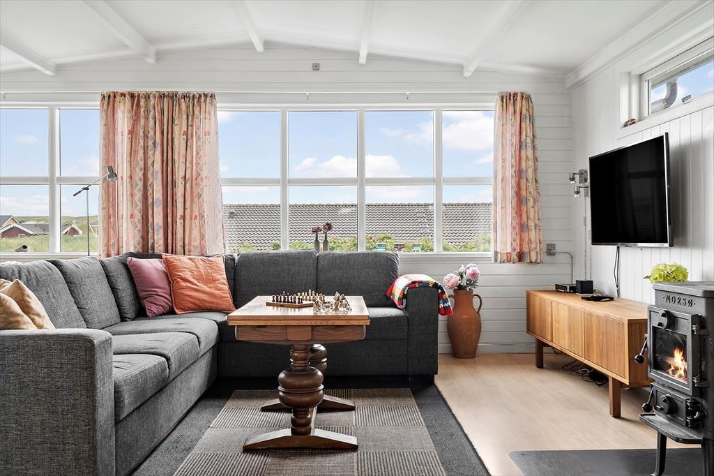 Der er lagt op til indendørs kvalitetstid i sommerhuset, der har en hyggelig atmosfære og en glimrende planløsning til seks personer. Spabadet og saunaen, der ligger på det største af de to badeværelser, kan forvandle en almindelig eftermiddag til en skøn wellness-stund, og stuens brændeovn vil på tilsvarende vis være et hit, når det er køligt udenfor. Køkkenet er integreret med stuen, og her er det sikkert vejrudsigten, der afgør, om du laver iskaffe og koldskål eller kræser om noget mere nærende som en varm simreret. Og når det er ved at være sengetid, kan du og dine kære uanset årstiden se frem til at sove godt og længe på de tre soveværelser.